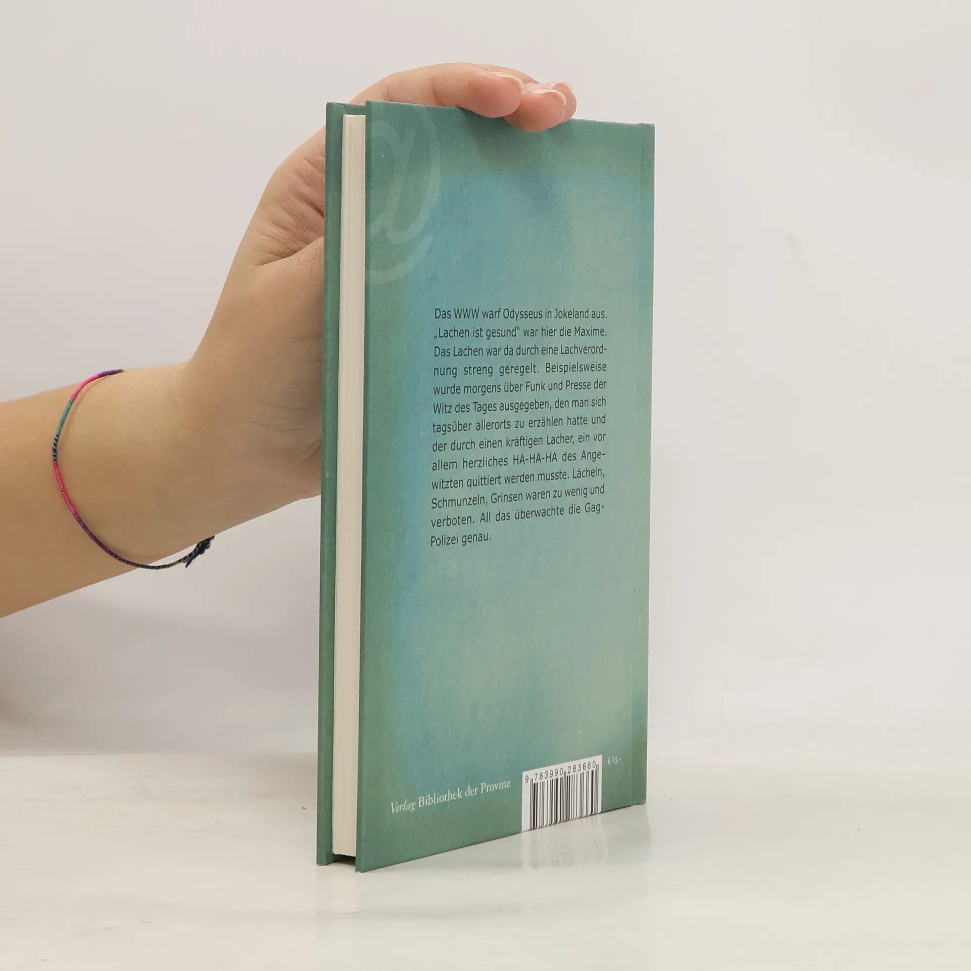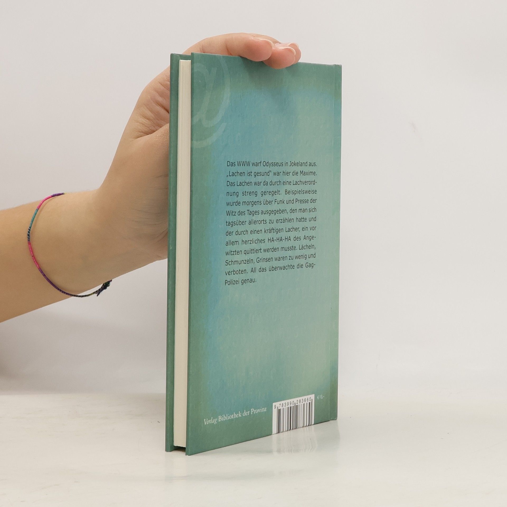 Das WWW warf Odysseus in Jokeland aus. „Lachen ist gesund“ war hier die Maxime. Das Lachen war da durch eine Lachverordnung streng geregelt. Beispielsweise wurde morgens über Funk und Presse der Witz des Tages ausgegeben, den man sich tagsüber allerorts zu erzählen hatte und der durch einen kräftigen Lacher, ein vor allem herzliches HA-HA-HA des Angewitzten quittiert werden musste. Lächeln, Schmunzeln, Grinsen waren zu wenig und verboten. All das überwachte die Gag-Polizei genau.
