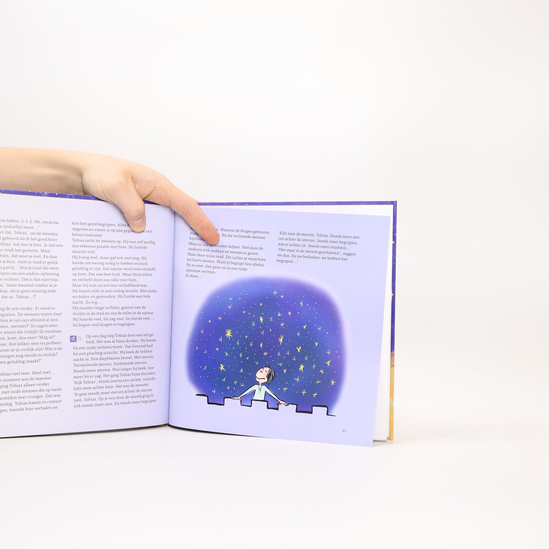 Een boeiend en ongewoon kerstsprookje voor kinderen van 8 - 10 jaar. Tobias, een ondernemende, eigenzinnige jongen, trekt op z'n onafscheidelijke kameel de wereld in. Hij ontmoet bijzondere mensen, wordt aangevallen door een tijger en leert sterren lezen op de School der Wijzen. Een verhaal over durf, avontuur en een open blik. Het lijkt eigenlijk helemaal niet over Kerst te gaan. Maar als plotseling de 'Drie Koningen', de wijzen uit het oosten, in een indrukwekkende stoet bij het kerstfeest van Tobias schoolklas arriveren, krijgt het verhaal plots een andere wending. De koningen hebben een nieuw begin in de sterren gelezen en komen geschenken brengen. Maar een kindje in de kribbe is er niet meer, wel een kerstman... En waar blijft Tobias?
