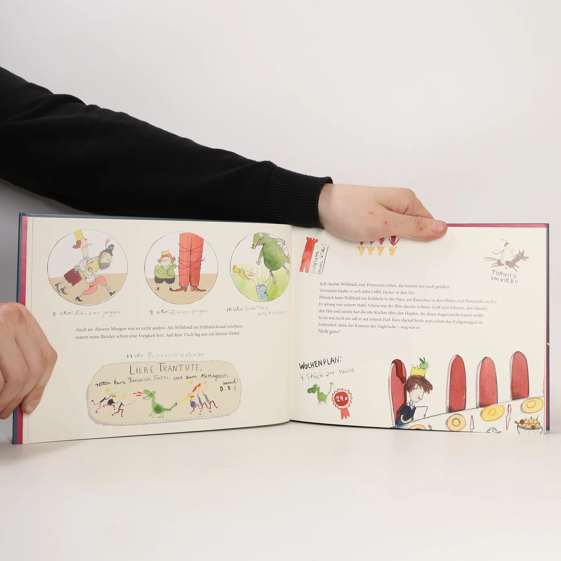 Schnarchnase, Trantüte, Kriechgurke – so nennen ihn seine Brüder, denn Prinz Willibald ist der allergrößte Trödler. Immer kommt ihm etwas dazwischen, wenn er schnell sein will: ein paar Gänseblümchen, die er pflücken muss, oder ein kühler Bach, in den er seine Füße tunken will. So erfährt er auch als Letzter, dass Prinzessin Fritza in Gefahr ist. Und macht sich keine zehn Butterbrote später auf den Weg zur Drachenhöhle. Dass er das entkräftete Ungeheuer dann nur noch umzupusten braucht – Glückssache. Das Herz von Fritza erobert er aber, weil er ihr als Einziger noch Brombeeren gepflückt hat. Ein wunderschönes Märchen-Bilderbuch für alle Kindergartenkinder, die immer etwas zu spät dran sind.