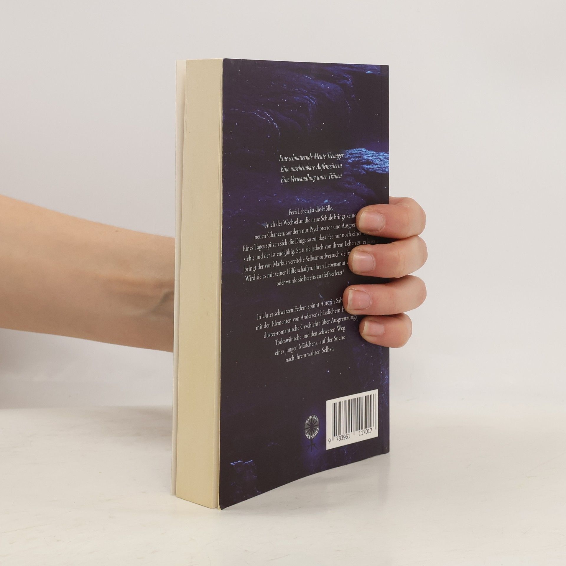 Eine schnatternde Meute Teenager Eine unscheinbare Außenseiterin Eine Verwandlung unter Tränen Fee’s Leben ist die Hölle. Auch der Wechsel an die neue Schule bringt keine neuen Chancen, sondern nur Psychoterror und Ausgrenzung. Eines Tages spitzen sich die Dinge so zu, dass Fee nur noch einen Ausweg sieht; und der ist endgültig. Statt sie jedoch von ihrem Leben zu erlösen, bringt der von Markus vereitelte Selbstmordversuch sie in die Therapie. Wird sie es mit seiner Hilfe schaffen, ihren Lebensmut wiederzufinden oder wurde sie bereits zu tief verletzt? In Unter schwarzen Federn spinnt Autorin Sabrina Schuh mit den Elementen von Andersens hässlichem Entlein eine düster-romantische Geschichte über Ausgrenzung, Todeswünsche und den schweren Weg eines jungen Mädchens, auf der Suche nach ihrem wahren Selbst.