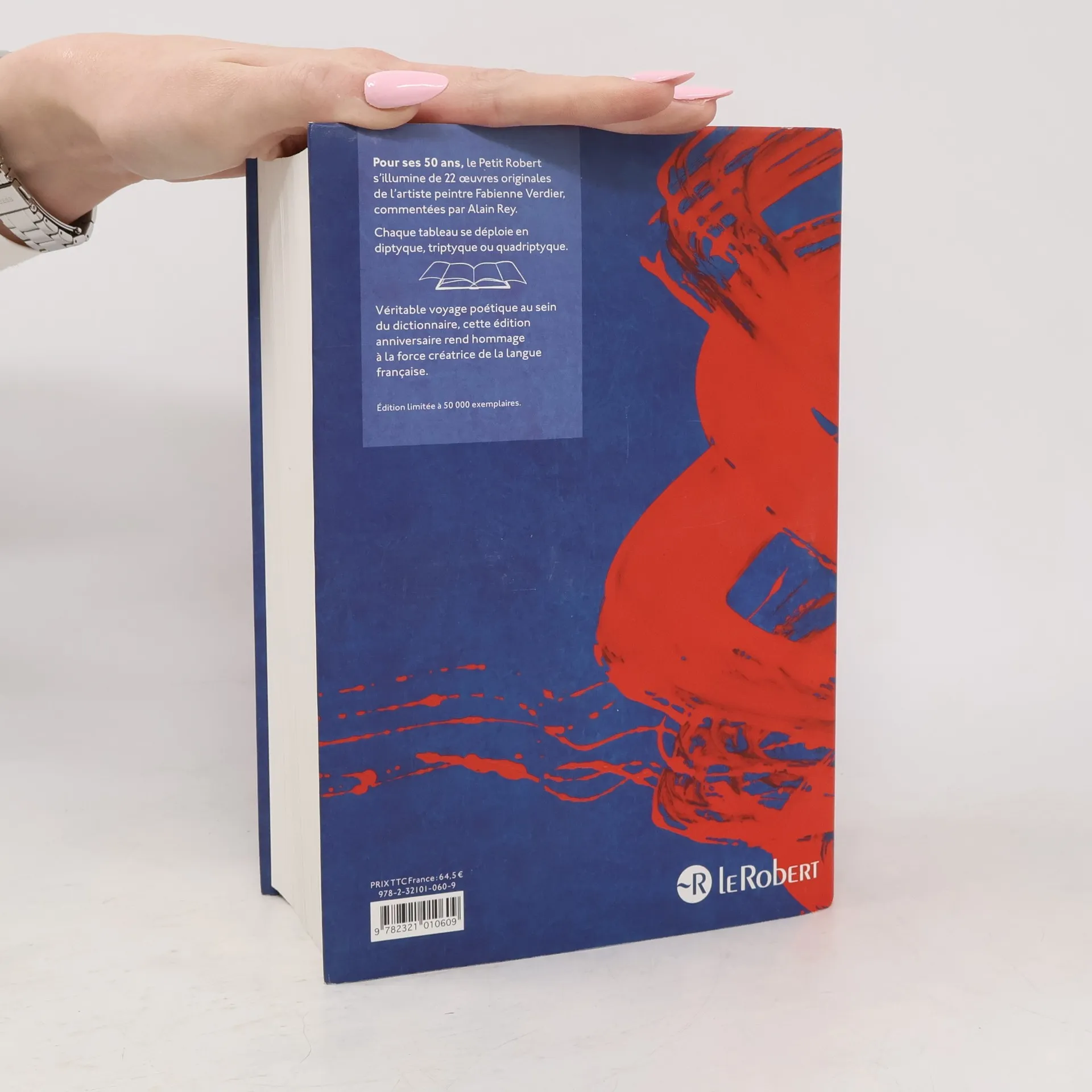 Pour ses 50 ans, le dictionnaire Le Petit Robert s'illumine de 22 œuvres de l'artiste Fabienne Verdier, commentées par Alain Rey.Véritable voyage poétique au sein du dictionnaire, cette édition anniversaire rend hommage à la force créatrice de la langue française.Les auteurs ont imaginé un parcours de création dans le corps même du dictionnaire Le Petit Robert autour d'associations de mots allant de l'évidence apparente (le nom nuit et l'adjectif noir) à l'incongruité inventive (labyrinthe et liberté). Chaque tableau est l'expression de ce couple de mots et se déploie en diptyque, triptyque et quadriptyque.Et toujours ... une description inégalée de la langue françaiseLe seul dictionnaire dédié à la langue française : 60 000 mots, 300 000 sens, 35 000 citations littéraires, 150 000 synonymes et contraires, 75 000 étymologies.Une édition exceptionnelle à tirage limité.Linguiste et lexicographe reconnu, Alain Rey est l'auteur de nombreux ouvrages sur la langue.Fabienne Verdier est une artiste française dont le travail repose sur une hybridation des savoirs. Ses toiles montrent l'énergie d'un monde en devenir.Pour en savoir plus, rendez-vous sur .