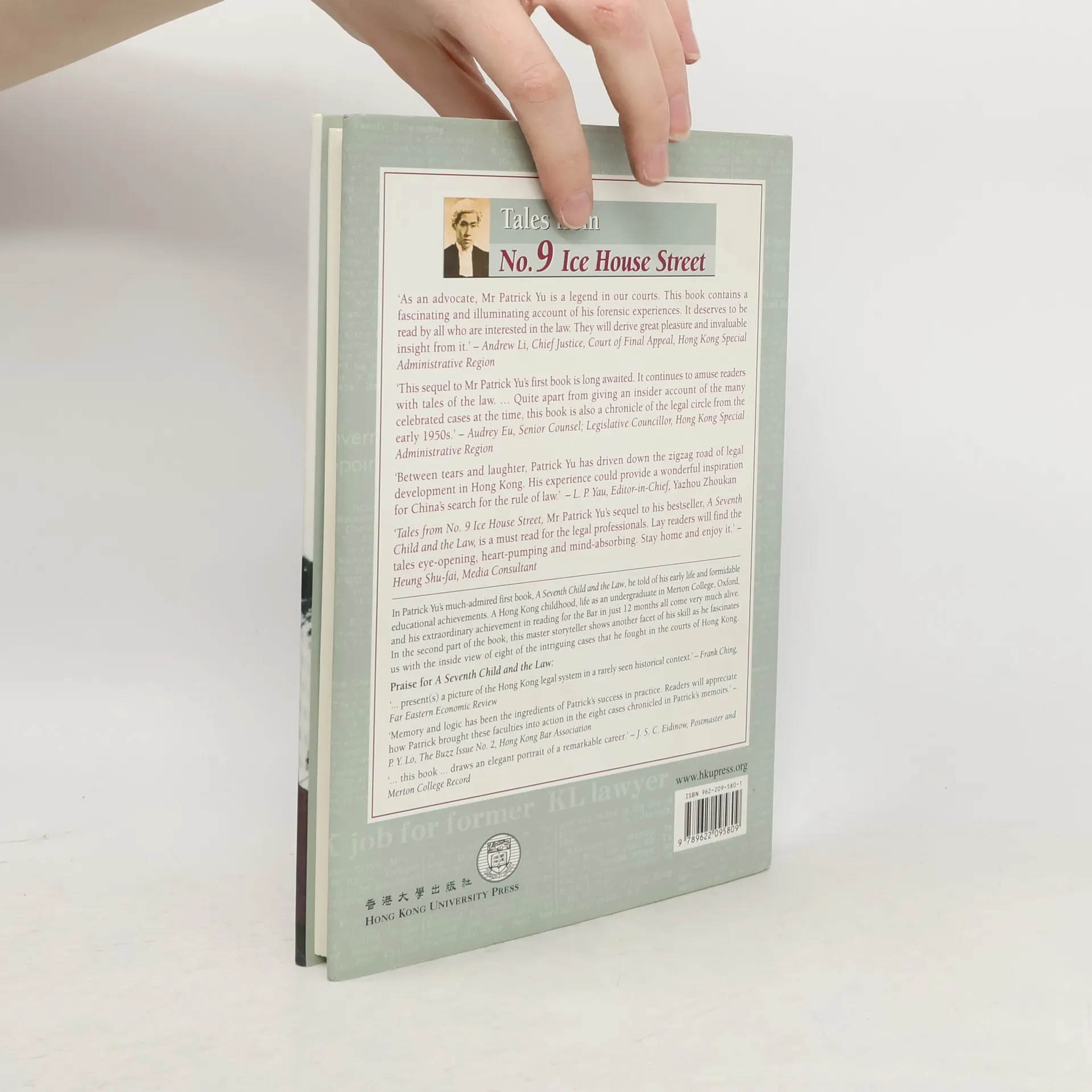 In Tales from No. 9 Ice House Street, Patrick Yu takes up his story as he returns to Hong Kong to become the first Chinese Crown Counsel. Thereafter he tells of the years in which he established himself as a most successful advocate in private practice. His story is enriched with anecdotes of his legal life and reminiscences of the many people with whom he came into contact. In the second part of the book, he recounts in his lively and intriguing way a series of the court cases in which he was involved as an important member of the Hong Kong Bar. The cases have surprising twists that the defence counsel-cum-storyteller deploys to surprise the reader. There are also unusual topics such as ‘The Case of the Young Man Who Impersonated a Police Officer’, or ‘The Case of the Solicitor Convicted of an Offence Not Known to the Law’. These read like classic detective stories, while also shedding light on life and the law in Hong Kong. Whether telling of his own life, recalling people with whom he came into contact, or telling the legal stories of the second part of this book, Patrick Yu again shows himself to be a notable raconteur and one whose life has provided him with many fascinating stories to tell.