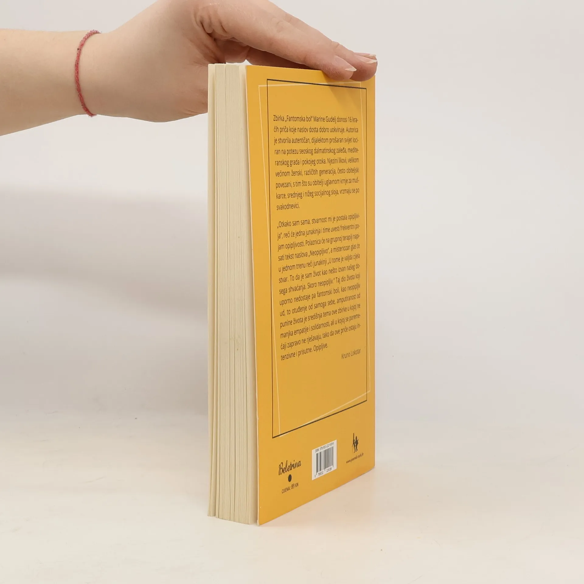 Zbirka „Fantomska bol“ Marine Gudelj donosi 16 kraćih priča koje naslov dosta dobro uokviruje. Autorica je stvorila autentičan, dijalektom prošaran svijet lociran na potezu seoskog dalmatinskog zaleđa, mediteranskog grada i pokojeg otoka. Njezini likovi, velikom većinom ženski, različitih generacija, često obiteljski povezani, s tim što su obitelji uglavnom krnje za muškarce, srednjeg i nižeg socijalnog sloja, vrzmaju se po svakodnevici. „Otkako sam sama, stvarnost mi je postala opipljivija“, reći će jedna junakinja i time uvesti frekventni pojam opipljivosti. Polaznica će na grupnoj terapiji napisati tekst naslova „Neopipljivo“, a misteriozan glas će u jednom trenu reći junakinji „U tome je valjda cijela stvar. To da je sam život kao nešto izvan našeg dosega shvaćanja. Skoro neopipljiv.“ Taj dio života koji uporno nedostaje pa fantomski boli, kao neopipljiv ud, to otuđenje od samoga sebe, amputiranost od punine života je središnja tema ove zbirke u kojoj ne manjka empatije i solidarnosti, ali u kojoj se poremećaji zapravo ne rješavaju, tako da ove priče ostaju intenzivne i prisutne. Opipljive. Kruno Lokotar