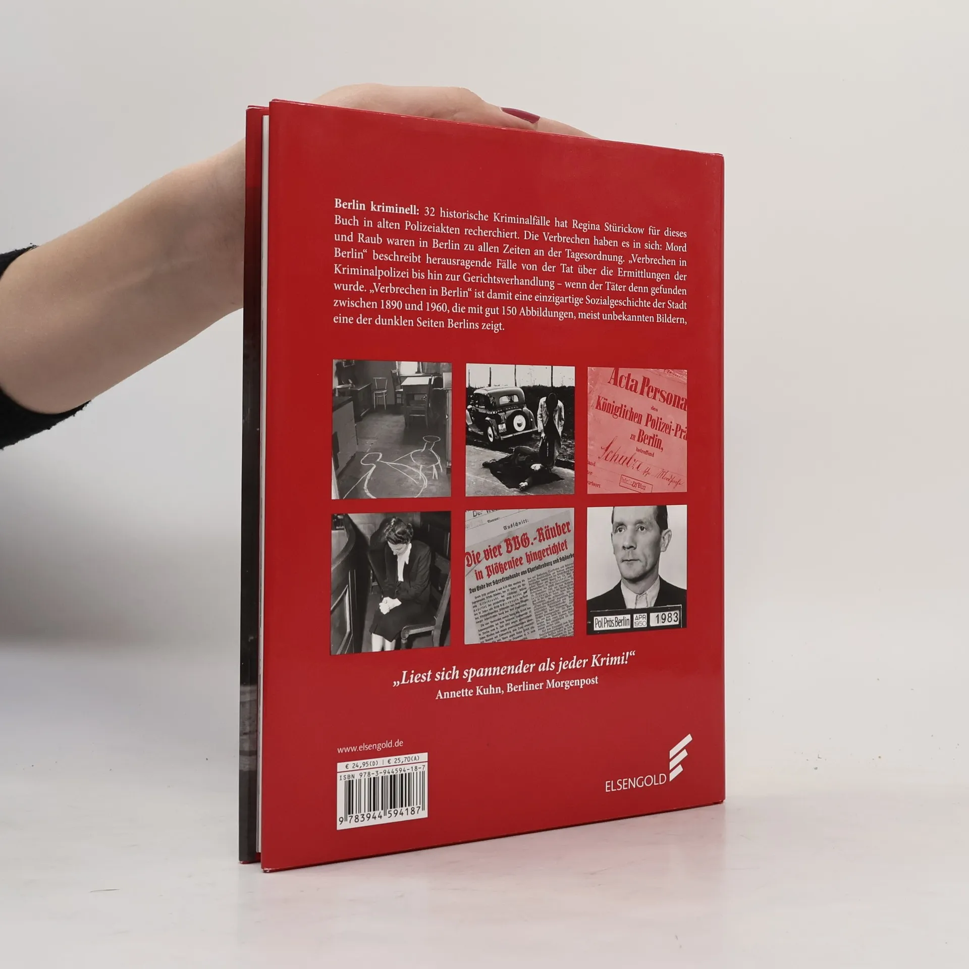 Berlin kriminell: 32 Kriminalfälle hat Regina Stürickow für dieses Buch in alten Polizeiakten recherchiert. Die Verbrechen haben es in sich: Mord und Raub war in Berlin zu allen Zeiten an der Tagesordnung. „Verbrechen in Berlin“ beschreibt herausragende Fälle von der Tat über die Ermittlungen der Kriminalpolizei bis hin zur Gerichtsverhandlung – wenn der Täter denn gefunden wurde. „Verbrechen in Berlin“ ist damit eine einzigartige Sozialgeschichte der Stadt, die mit über 150 Bildern eine der dunklen Seiten Berlins zeigt.