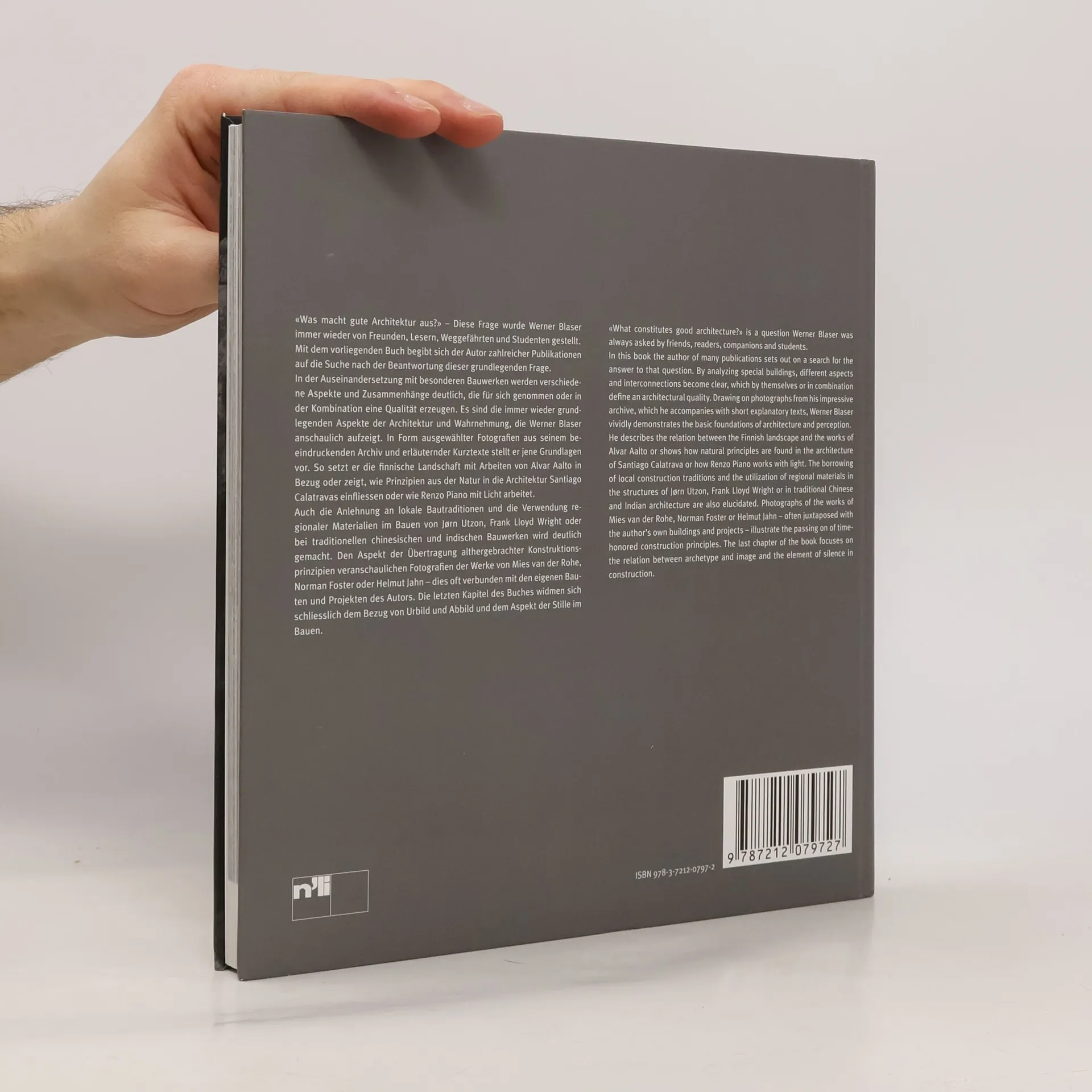 The question "What constitutes good architecture?" has long intrigued Werner Blaser, who embarks on a quest to find an answer in this comprehensive work. By analyzing notable buildings, he reveals various aspects and interconnections that define architectural quality. Utilizing photographs from his extensive archive, Blaser enhances his insights with brief explanatory texts, illustrating the fundamental principles of architecture and perception. He explores the relationship between the Finnish landscape and Alvar Aalto's works, highlights natural principles in Santiago Calatrava's architecture, and examines Renzo Piano's use of light. The book also addresses the influence of local construction traditions and regional materials in the designs of Jørn Utzon, Frank Lloyd Wright, and traditional Chinese and Indian architecture. Juxtaposed photographs of Mies van der Rohe, Norman Foster, and Helmut Jahn with Blaser's own projects showcase the continuity of time-honored construction principles. The final chapter delves into the relationship between archetype and image, as well as the significance of silence in construction. Blaser's encounters with architectural giants like Aalto and Mies van der Rohe have shaped his understanding, leading him to identify fundamental similarities between Western classical Modernism and traditional architecture from the Middle East and Asia.