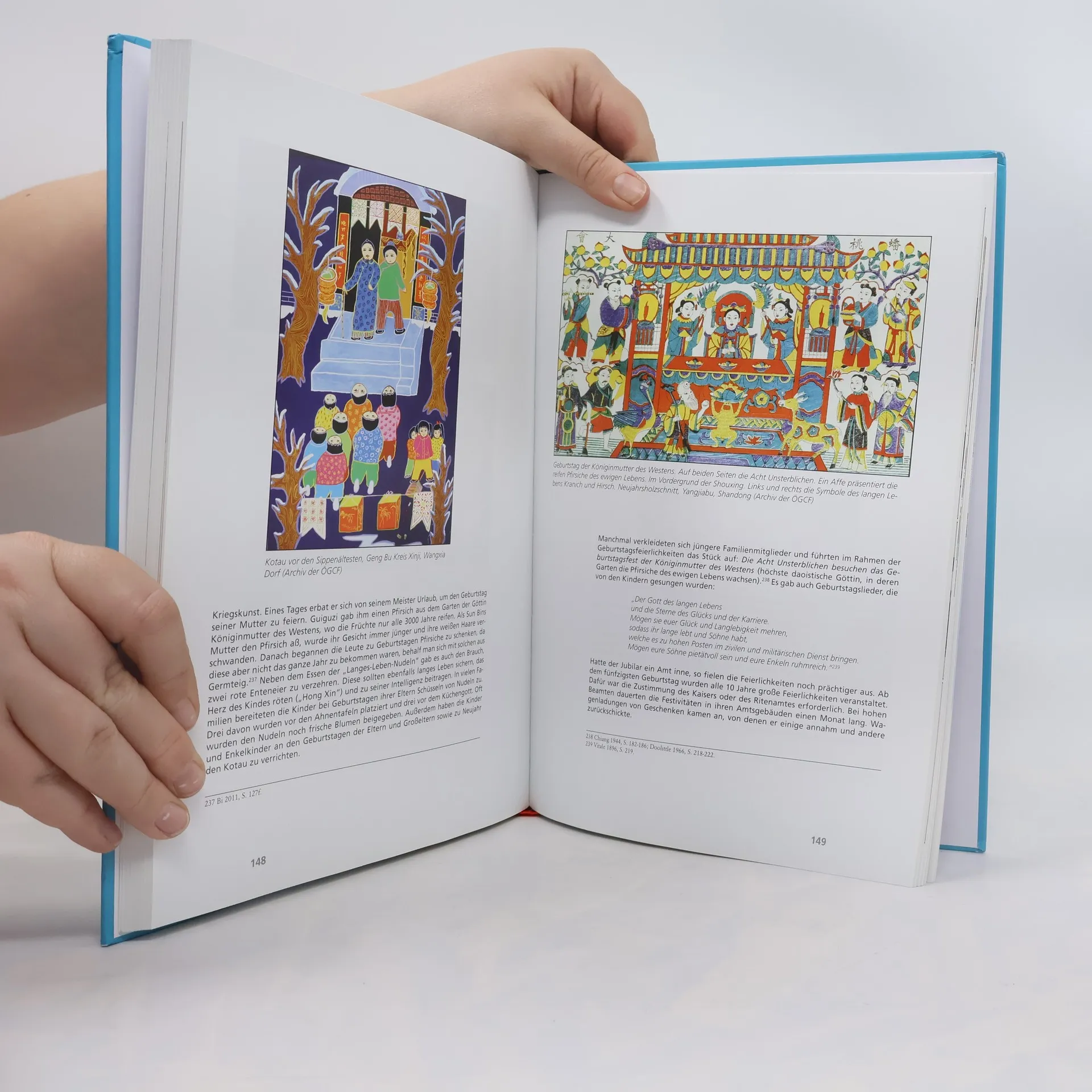 Das Buch behandelt die chinesischen Lebensbräuche, darunter Verlobung, Hochzeit, Geburt, Großjährigkeit und Trauer. Der Autor beleuchtet die tiefen Wurzeln dieser Bräuche, die oft bis in vorchristliche Zeiten zurückreichen, und dokumentiert, was von den traditionellen Praktiken trotz der Kulturrevolution erhalten geblieben ist. Der Leser wird von der Vielzahl der überlebenden Rituale überrascht sein. Beispielsweise werden die mündlich überlieferten Lamentos der Braut in den Dörfern sowie andere Aspekte der Verlobungsriten detailliert beschrieben. Die Geschichte des roten Schleiers und die Bedeutung bunter Eier bei Hochzeits- und Geburtsritualen werden ebenfalls behandelt. Zudem wird erklärt, wie die Elster zum Hochzeitsvogel wurde und welche Rolle das Münzschwert bei schwangeren Frauen spielt. Der chinesische Storch, das Fabeltier Qilin, das Kinder bringt, sowie die Rolle von über zehn daoistischen Gottheiten bei der Geburt werden thematisiert. Das Fest der Hundert Tage nach der Geburt und der Brauch des zhuazhu, bei dem ein Orakel am ersten Geburtstag des Kindes durchgeführt wird, werden erläutert. Der Autor verweist auch auf die vielen Legenden und Märchen, die mit diesen Bräuchen verbunden sind, und integriert alte Liedtexte, die verschiedene persönliche Festtage betreffen. Im Kapitel über Trauerriten wird die Bedeutung der Geburt männlicher Nachkommen und die damit verbundenen Ängste thematisiert.