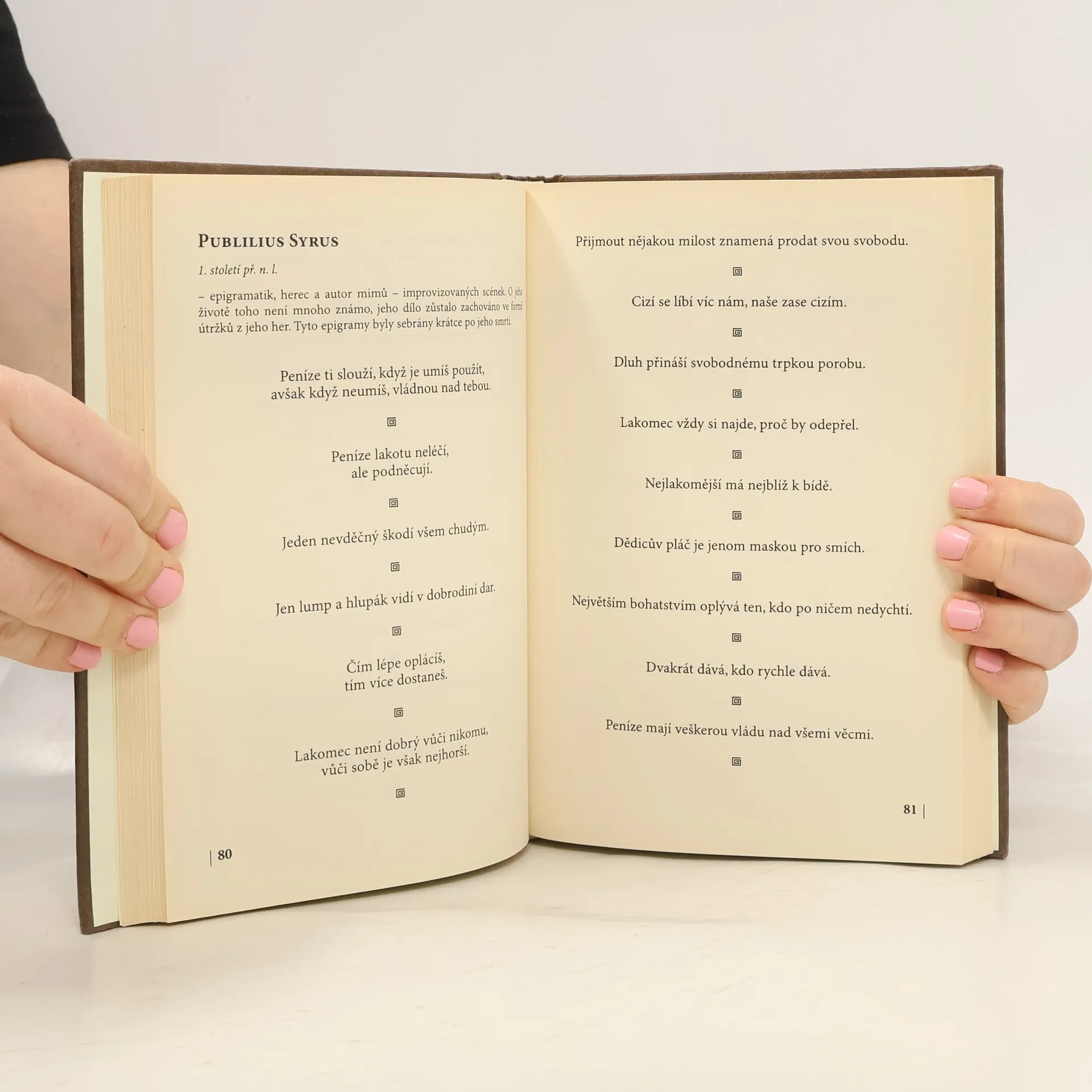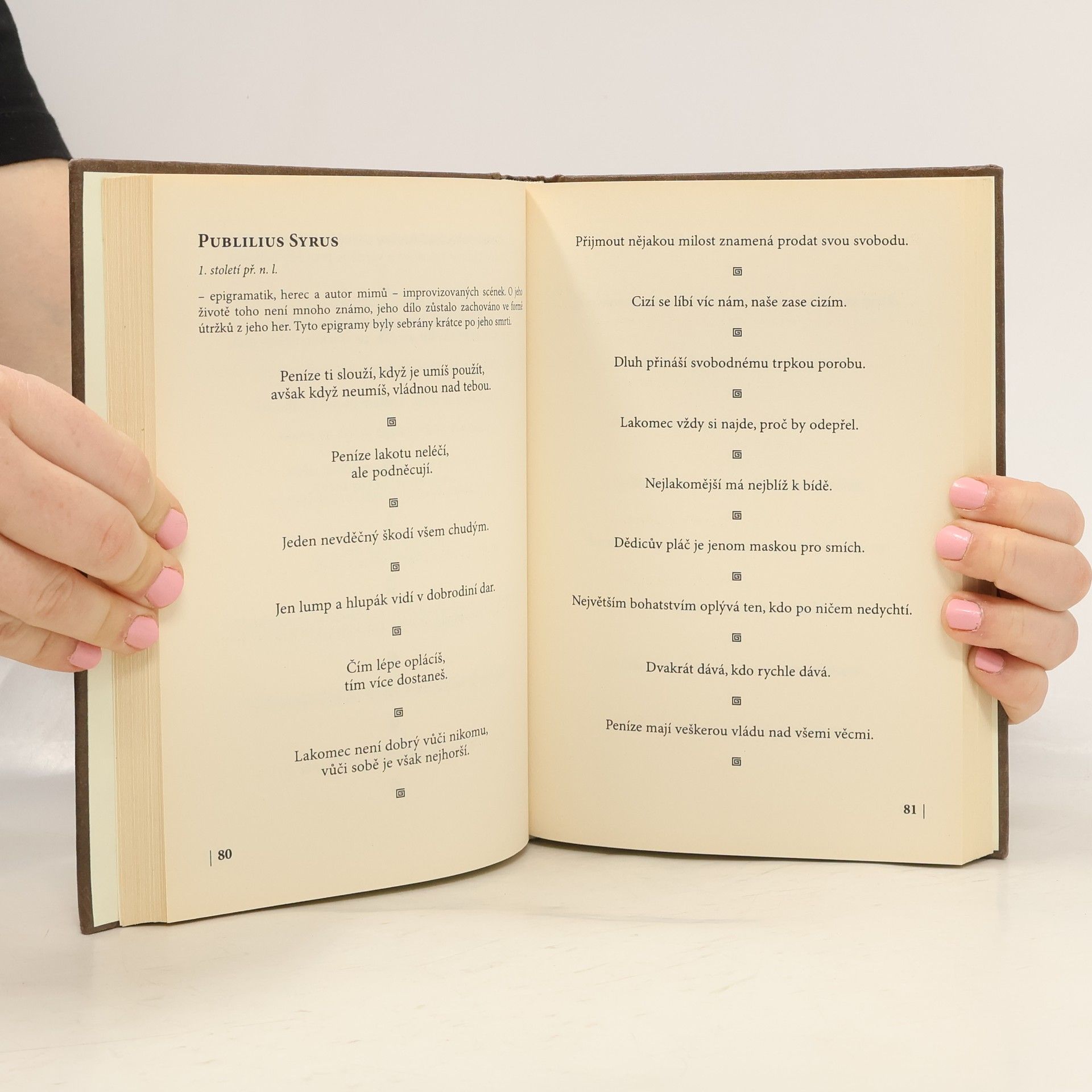 Antika jako pokladnice moudrosti dodnes udivuje hloubkou poznání, jež ani staletí neubrala nic z byvší aktuálnosti. Tato publikace obsahuje základní myšlenky takových myslitelů, jakými byli kupříkladu Vergilius, Cicero, Seneca, Horatius nebo Tacitus. Kniha, vydaná v elegantní úpravě v edici Koloseum, pak může splnit dvojí úkol; jednak obohatit duši čtenáře, jednak se stát důstojným dárkovým předmětem každému, kdo chce věnovat svému bližnímu vskutku hodnotný dárek.