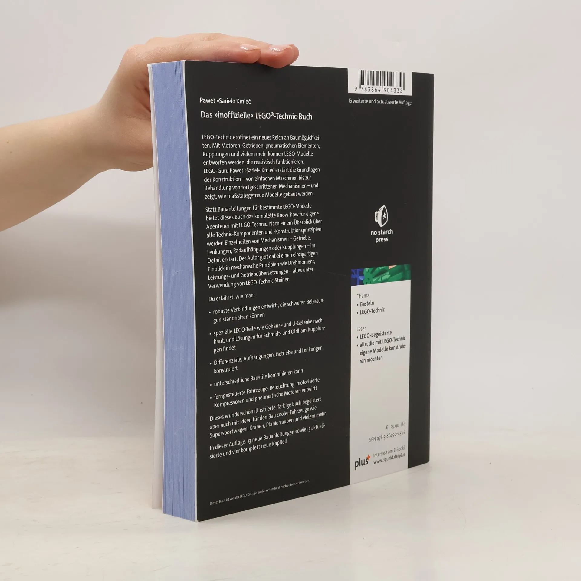 LEGO-Technic eröffnet ein neues Reich an Baumöglichkeiten.Mit Motoren, Getrieben, pneumatischen Elementen, Kupplungen und vielem mehr können LEGO-Modelle entworfen werden, die realistisch funktionieren.LEGO-Guru Pawel »Sariel« Kmiec erklärt die Grundlagen der Konstruktion - von einfachen Maschinen bis zur Behandlung von fortgeschrittenen Mechanismen - und zeigt, wie maßstabsgetreue Modelle gebaut werden.Statt Bauanleitungen für bestimmte LEGO-Modelle bietet dieses Buch das komplette Know-how für eigene Abenteuer mit LEGO-Technic. Nach einem Überblick über alle Technic-Komponenten und -Konstruktionsprinzipien werden Einzelheiten von Mechanismen - Getriebe, Lenkungen, Radaufhängungen oder Kupplungen - im Detail erklärt. Der Autor gibt dabei einen einzigartigen Einblick in mechanische Prinzipien wie Drehmoment, Leistungs- und Getriebeübersetzungen - alles unter Verwendung von LEGO-Technic-Steinen.Du erfährst, wie man:- robuste Verbindungen entwirft, die schweren Belastungen standhalten können- spezielle LEGO-Teile wie Gehäuse und U-Gelenke nachbaut,und Lösungen für Schmidt- und Oldham-Kupplungen findet- Differenziale, Aufhängungen, Getriebe und Lenkungen konstruiert- unterschiedliche Baustile kombinieren kann- ferngesteuerte Fahrzeuge, Beleuchtung, motorisierte Kompressoren und pneumatische Motoren entwirftDieses wunderschön illustrierte, farbige Buch begeistert aber auch mit Ideen für den Bau cooler Fahrzeuge wie Supersportwagen, Kränen, Planierraupen und vielem mehr.In dieser Auflage: 13 neue Bauanleitungen sowie 13 aktualisierte und vier komplett neue Kapitel!Dieses Buch ist von der LEGO-Gruppe weder unterstützt noch autorisiert worden. Jetzt reinlesen: Inhaltsverzeichnis(pdf)