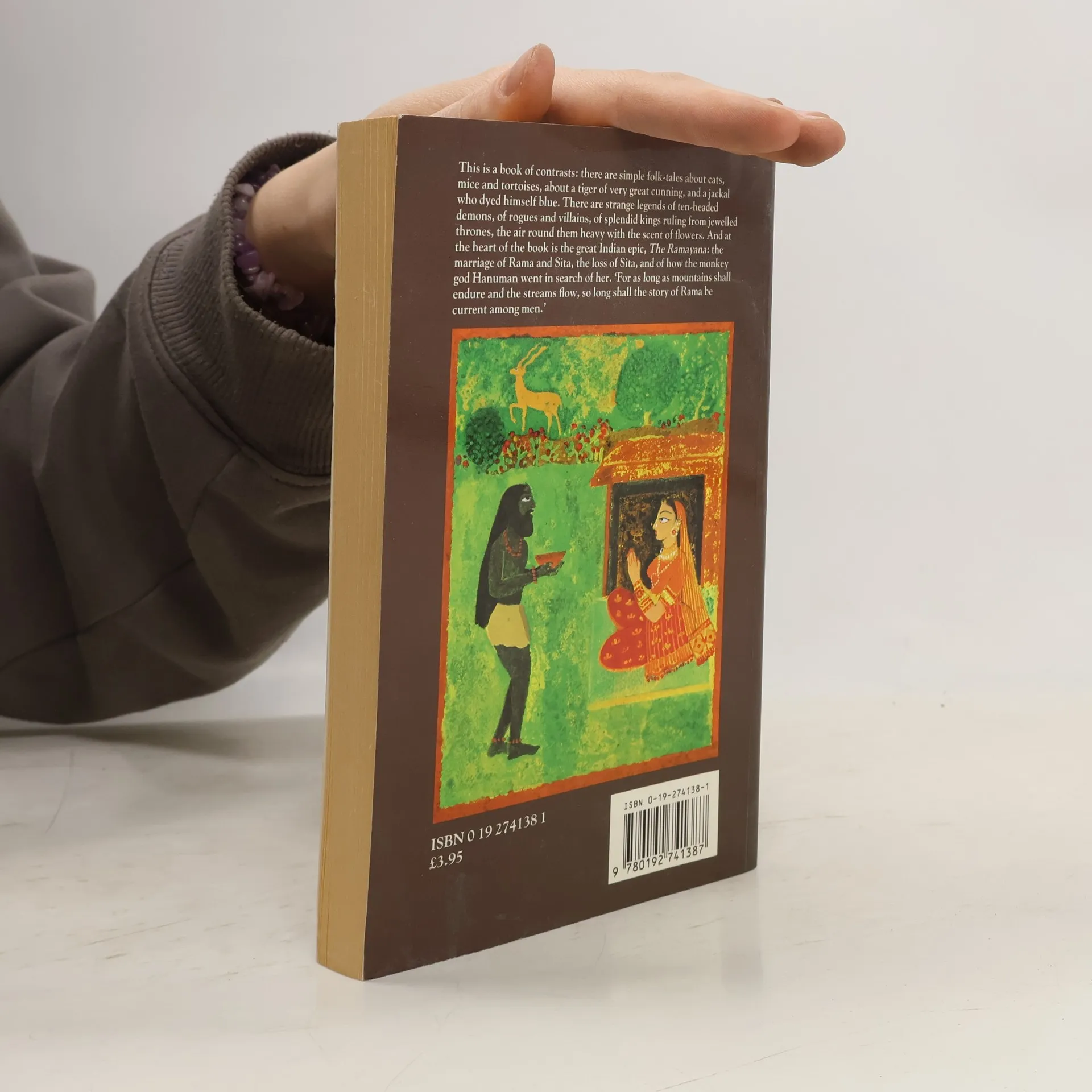 Indian Tales and Legends is a book of there are simple folk tales about cats, mice and tortoises, about a tiger of very great cunning, and a jackal who dyed himself blue. There are strange legends of ten-headed demons, of rogues and villains, of splendid kings ruling from jewelledthrones, the air around them heavy with the scent of flowers. And at the heart of the book is the great Indian epic The Ramayana : the marriage of Rama and Sita, the loss of Sita, and of how the monkey god Hanuman went in search of her.