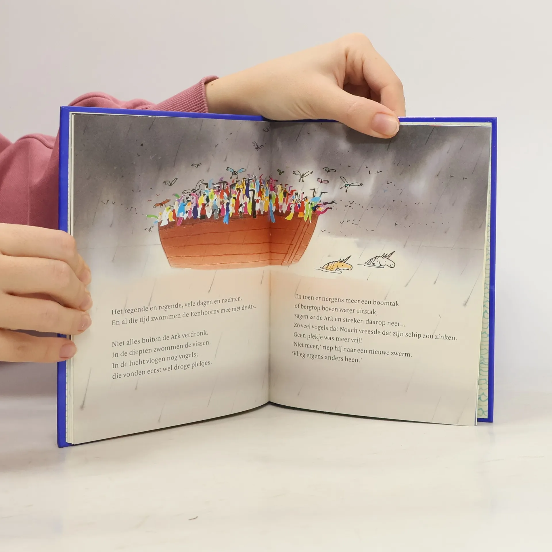 Uitgegeven door Stichting Collectieve Propaganda van het Nederlandse Boek ter gelegenheid van de Kinderboekenweek 2007.Dat het zou gaan regenen en regenen en dat er een Grote Vloed zou komen, was voor de mensen een geheim. Behalve voor Noach. En Noach bouwde een boot. Ook voor de dieren was het een geheim, behalve voor de Eenhoorns ...------------------------------The coming of the rains and the flood was a secret from the humans, except for Noah: he built an ark. It was a secret from the animals as well, except for the unicorns ...Picture book especially published for the Children's Book Week 2007.