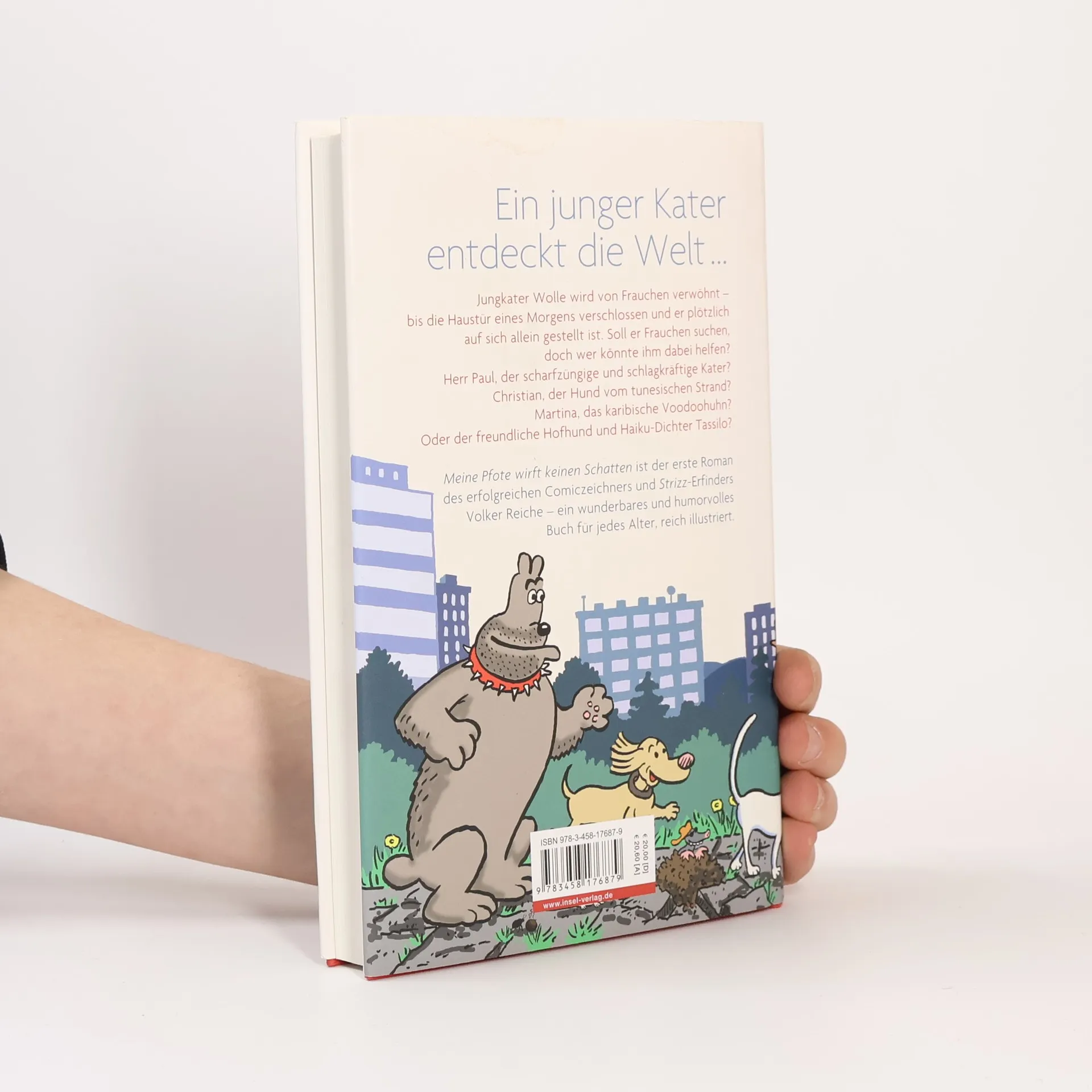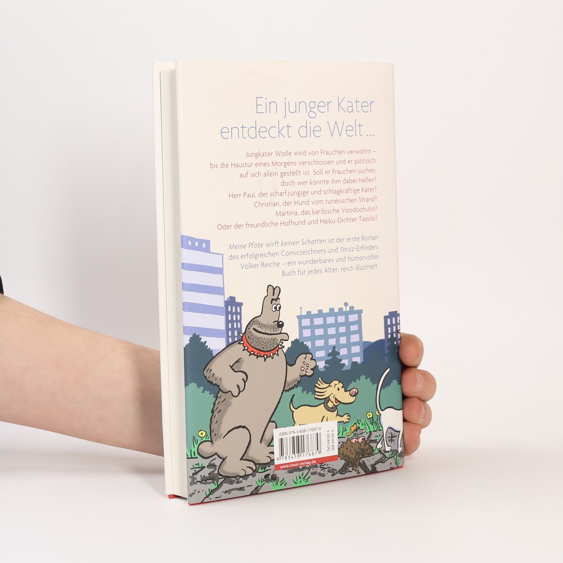 Jungkater Wolle wird von Frauchen verwöhnt. »Herrlich«, denkt er, »Fressen und Schlafen und sonst gar nichts, es ist eine Lust zu leben.« Doch in einer Gewitternacht hört er einen dumpfen Schlag im Wohnzimmer, und am nächsten Morgen entführt ein Rettungswagen Frauchen aus Wolles Leben, das von Stund an härter, aber auch spannender wird. Ob er Frauchen suchen soll, obwohl sie ihn gewarnt hat, sich nicht platt fahren zu lassen? »Doch wer könnte mir dabei helfen?«, überlegt Wolle. Herr Paul, der scharfzüngige und schlagkräftige Kater, der Jungkater nicht ausstehen kann? Christian, der Hund vom tunesischen Strand, der gerade einen Integrationstest bestanden hat? Martina, das karibische Voodoohuhn, das Wolles Schatten vermisst? Oder eher der freundliche Hofhund und Haiku-Dichter Tassilo? »Ach«, träumt Wolle, »am liebsten würde ich mit Katharina losziehen, der wunderbaren weißen Katze, die nichts von mir wissen will …« Meine Pfote wirft keinen Schatten ist der erste Roman des erfolgreichen Comiczeichners und Strizz -Erfinders Volker Reiche – ein wunderbares und humorvolles Buch für jedes Alter, reich illustriert.