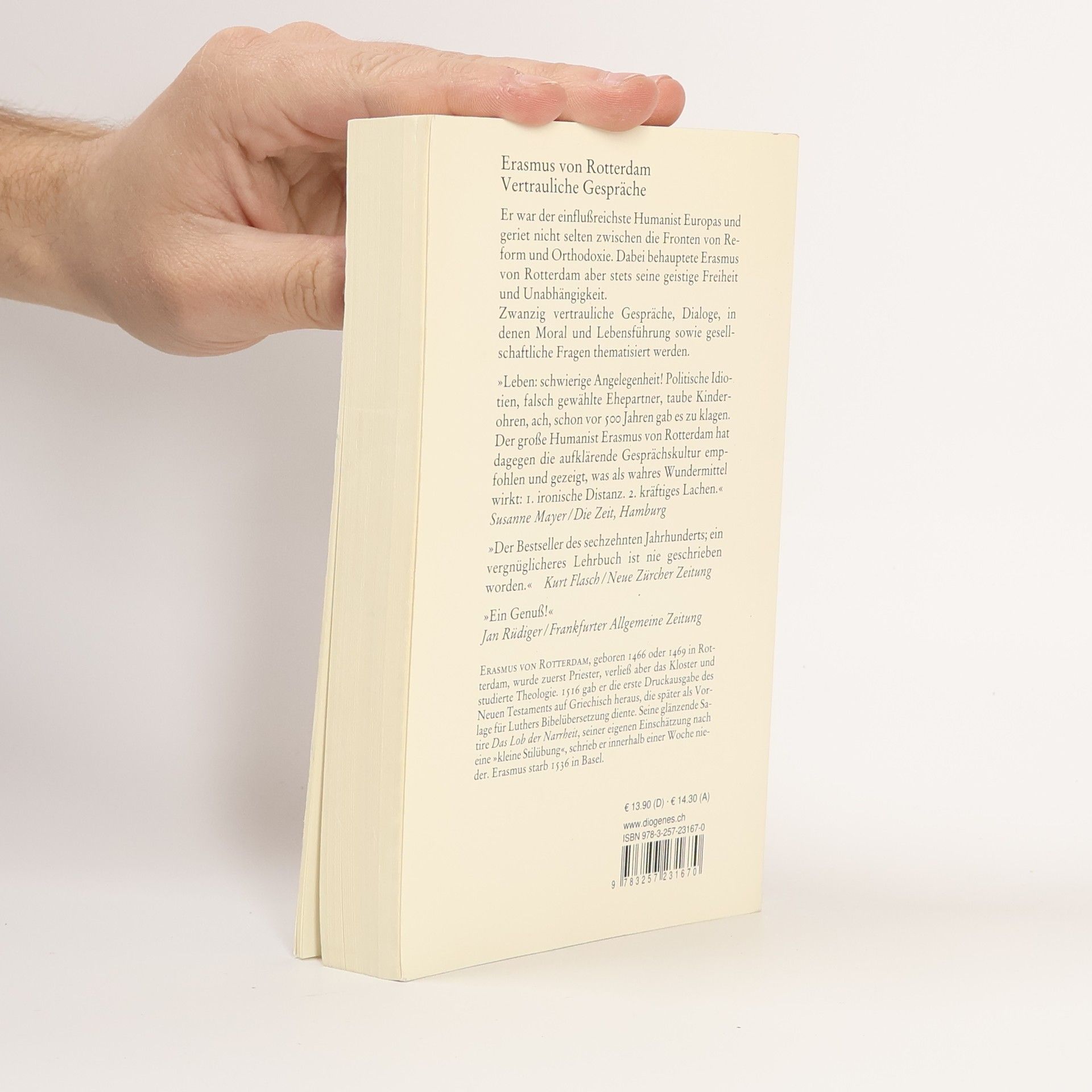 Er war einer der einflußreichsten Humanisten Europas, ein Pazifist, ein unermüdlicher Publizist und Propagandist für eine umfassende Bildungs-, Gesellschafts- und Glaubensreform seiner Zeit war Erasmus von Rotterdam weit voraus. Er geriet nicht selten zwischen die Fronten von Reform und Orthodoxie, behauptete dabei aber stets seine geistige Freiheit und Unabhängigkeit. Der vorliegende Band vereinigt zwanzig vertrauliche Gespräche, Dialoge, in denen Moral und Lebensführung sowie drängende politische und gesellschaftliche Fragen thematisiert werden. Und obwohl nun nahezu 500 Jahre alt, sind die Fragen von brennender Aktualität: Kann ein Krieg gerecht, das heißt zu rechtfertigen, sein? Kann man im Namen Gottes kämpfen? Wie kommt es, daß sich einzelne so oft und auf Kosten kollektiver Solidarität durchsetzen? Und worauf gründet sich eigentlich die Diffamierung und Unterdrückung des weiblichen Geschlechts? Beharrlich und mit viel Charme verkündet Erasmus seine humanistische Botschaft: den Triumph des unabhängigen und selbständigen vor dem dogmatischen, autoritätsgläubigen, konfessionell und politisch gefesselten Denken. "