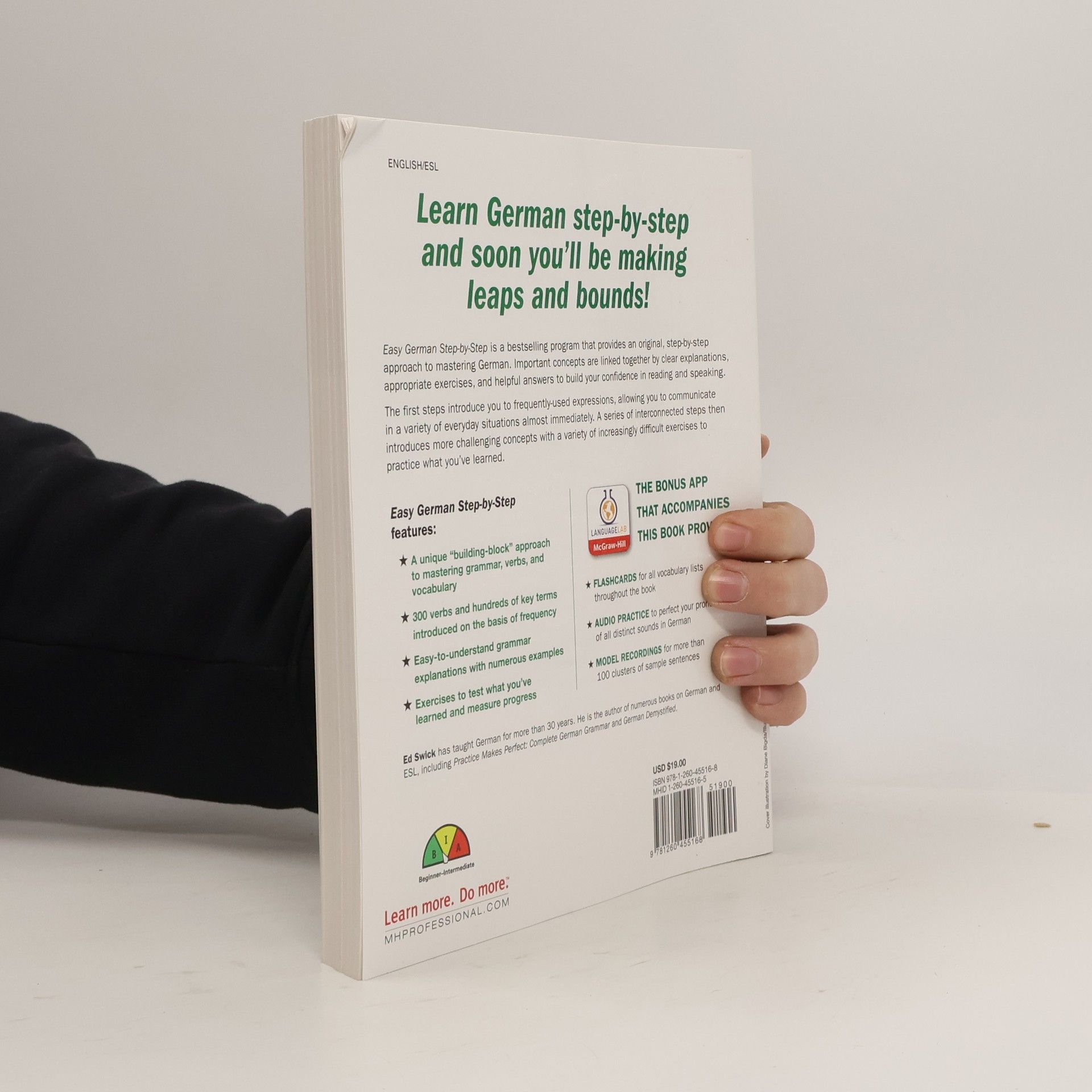 " Get the skills you need to begin communicating in German quickly and easily! Communicating in a new language can be intimidating. This accessible guide will give you the tools and confidence to understand and converse in German with confidence. Based on the idea that the quickest route to learning a language is through a solid foundation in the basics, Easy German Step-by-Step presents a successful building block approach to mastering German, with important concepts linked together by clear explanations, appropriate exercises, and helpful answers. The first steps introduce you to the everyday expressions of the language, allowing you to communicate in a variety of everyday situations almost immediately. Gradually, a series of interconnected steps takes you from simple to more challenging concepts at your own pace. After working through these exercises, you'll have a better grasp of the language and the skills to handle German with confidence. New for this second edition, the McGraw-Hill Language Lab app streams accompanying audio recordings to help you improve your German pronunciation and fluency. Easy German Step-by-Step, Second Edition features: Easy-to-grasp descriptions of essential rules and concepts; Key verbs and hundreds of key terms introduced on the basis of frequency; Numerous exercises that give you valuable practice; Audio recordings of exercise answers throughout the book, streamed via the McGraw-Hill Language Lab app (web and mobile)." -- ONIX annotation