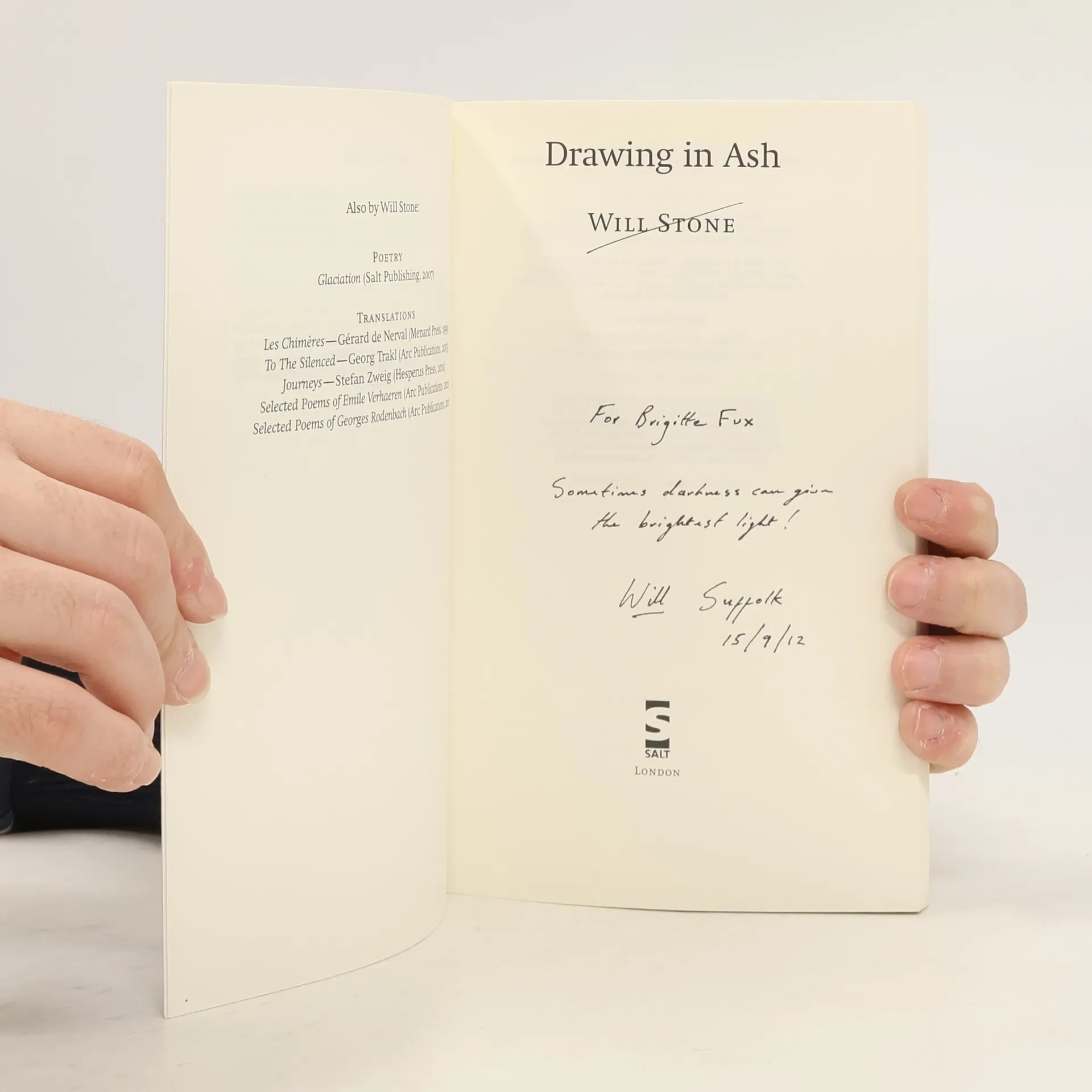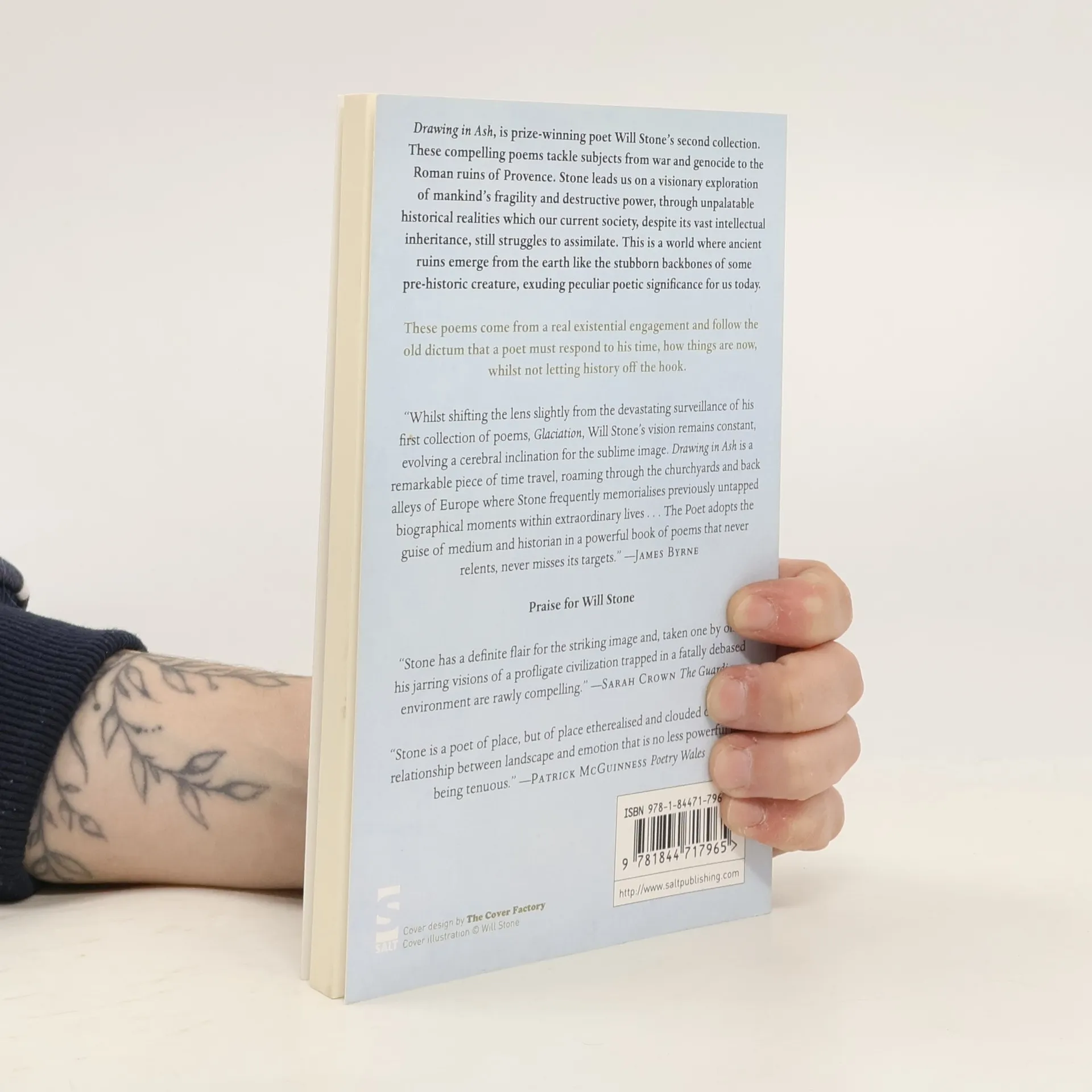 Will Stone's powerful second collection Drawing in Ash extends the remarkable imagery and visionary capacity he displayed in his first collection from Salt Publishing, Glaciation, which went on to win the prestigious international Glen Dimplex prize in 2008. Stone's poems stand apart and are as Sarah Crown stated in the Guardian 'rawly compelling'. He is as poet Matthew Sweeney remarked in a recent poll of the most promising new voices, 'up there with the best'.