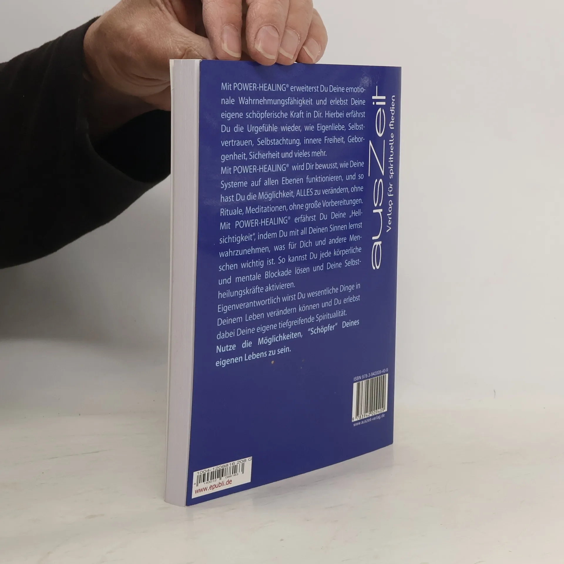 POWER-HEALING ist eine Selbstheilungsmethode, die unser BewusstSein und emotionale Wahrnehmungsfähigkeit erweitert, indem wir unsere Herzensenergie aktivieren können und dadurch unsere eigene schöpferische Kraft neu erleben. Hierbei kannst Du lernen, Deinem "Bauchgefühl" wieder zu vertrauen, um leichter Entscheidungen zu treffen. So wirst Du auch Deinen inneren Stress erkennen und lösen können. Du wirst die Urgefühle wieder erfahren, wie Geborgenheit, Vertrauen, Sicherheit, Liebe, Eigenliebe Selbstachtung, Selbstvertrauen, Frieden, Freiheit, innere Ruhe und vieles mehr.Alte Muster, erlernte Verhaltensweisen und Prägungen, die uns an unserer Weiterentwicklung hindern, wirst Du erkennen und lösen können.Gezielt und mit Leichtigkeit erreichst Du innerhalb kürzester Zeit den Zugang zu Deiner allumfassenden Weisheit, deiner Kreativität und Selbstheilungskraft.Eigenverantwortlich wirst Du wesentliche Dinge in Deinem Leben verändern können.Nutze die Möglichkeit, “Schöpfer“ Deines eigenen Lebens zu sein. Du ermöglichst Dir, Dein Leben so zu erschaffen, wie Du es Dir wünschst. Den Weg zu gehen, den Du von Herzen gerne gehen magst.Lerne auf verschiedenen Ebenen zu arbeiten, so kannst Du für Dich und für andere Menschen jede körperliche und mentale Blockade auflösen und Selbstheilungskräfte aktivieren.Erfahre, wie sich Dein Gefühlsleben verändert, denn Du wirst neue Emotionen mit Leichtigkeit zulassen können.Du bekommst die „Werkzeuge“, die es Dir ermöglichen, Deine früheren Einstellungen und die damit verbundenen negativen Auswirkungen zu verändern.POWER-HEALING kann jeder leicht und schnell erlernen. Dies ist ohne Vorkenntnisse möglich und so einfach wie Einschlafen, Aufwachen, Spielen, Musizieren, Malen, usw., und das kannst Du bereits.In diesem Buch wirst Du alle wichtigen Anwendungen für Dich finden. Einige der Themen Alle Informationen über die Aura und die Chakren. Die Basis der Wahrnehmungen mit POWER-HEALING. Visualisieren (Die Vorstellungskraft). Die POWER-HEALING „Technik“. Energetische Reinigung und Schutz. Heilung für Dich selbst. Verschiedene Muskeltests (Kinesiologie). Emotionen und Gefühle erschaffen. Aktivierung unserer Zellen, Zellmembrane und DNS. Alte Gelübde, Flüche und sexuelle Verbindungen lösen. Die Wahrnehmung verschiedener zeitlicher Ebenen, wie Vergangenheit - Zukunft - Dein Weg. Seelen und Wesen ins Licht geleiten. Körperliche Symptome, Depressionen, Miasmen, Gift, Bakterien, Viren, Pilze und Parasiten.