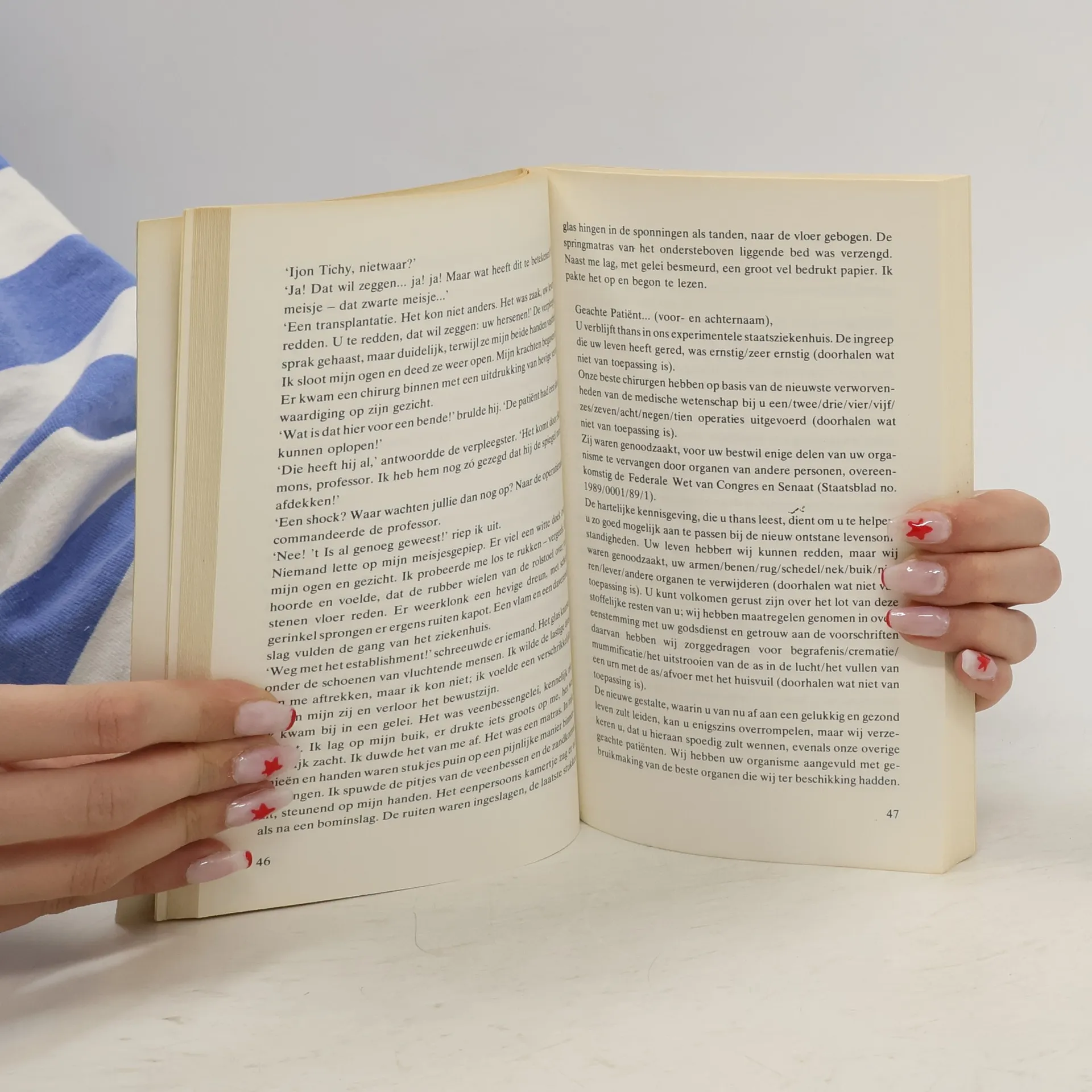 Ijon Tichy attends the 8th World Futurological Congress, organized by Prof Tarantoga, focusing on overpopulation at the extravagant Costa Rica Hilton. The conference is chaotic, with absurdities like guaranteed bomb-free rooms and an all-girl orchestra performing Bach while stripteasing. Presentations are limited as speakers call out paragraph numbers from distributed papers. Tichy drinks tap water, triggering a hallucinogenic experience, which is compounded when he discovers the government has drugged the water with a substance that induces benevolence. The situation deteriorates as the hotel is bombed, and Tichy escapes into the sewers, only to be evacuated by a military helicopter that crashes. He wakes in a hospital to find his brain transplanted into a young black woman, then later into a fat, red-haired man, blurring the lines between reality and hallucination. Frozen until medical advancements can help, he awakens in 2039, where he documents his experiences. The future presents a utopia where money is irrelevant, and drugs regulate emotions. Tichy becomes involved with a woman who uses a drug to enhance her argumentative skills. Disillusioned by this reliance on drugs, he confides in Dr. Trottelreiner, who reveals that common substances are just a glimpse of more powerful drugs that can obscure reality entirely.
