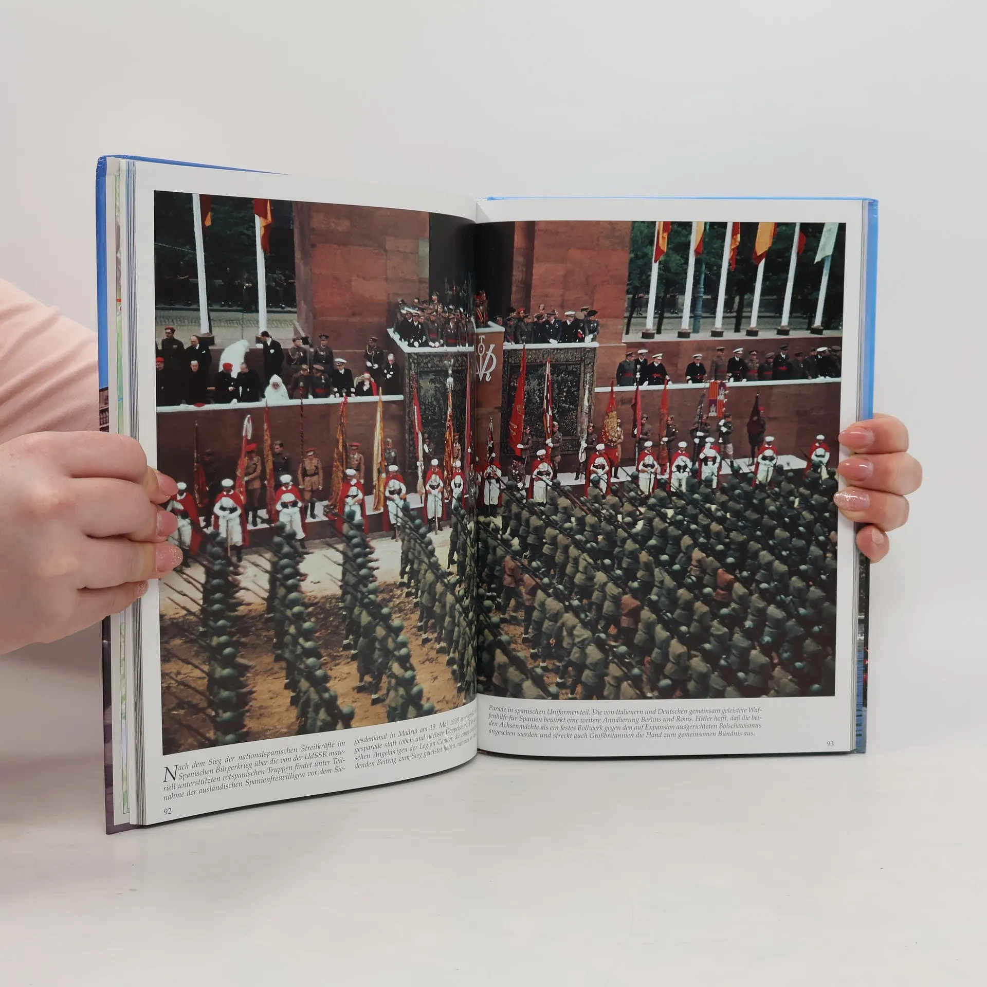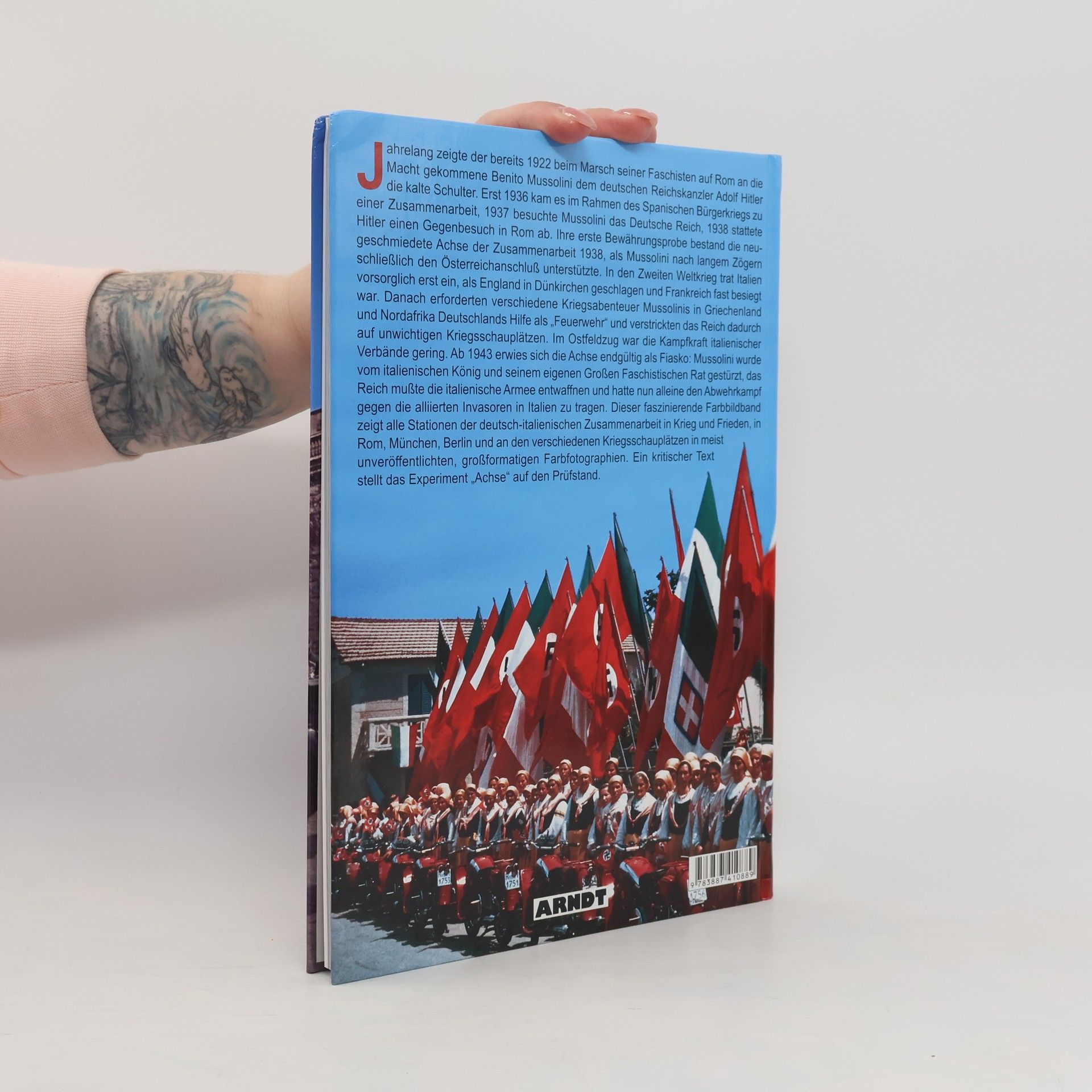 1936 kam es im Rahmen des Spanischen Bürgerkriegs zu einer Zusammenarbeit zwischen dem Deutschen Reich und Italien. In den 2. Weltkrieg trat Italien vorsorglich erst ein, als Frankreich fast besiegt war. Danach erforderten verschiedene Kriegsabenteuer Mussolinis in Griechenland und Nordafrika Deutschlands Hilfe als „Feuerwehr“ und verstrickten das Reich dadurch auf unwichtigen Kriegsschauplätzen. Ab 1943 erwies sich die Achse endgültig als Fiasko: Mussolini wurde vom italienischen König und seinem eigenen faschistischen Großrat gestürzt, das Reich mußte nun alleine den Abwehrkampf gegen die US-Invasoren in Italien tragen. Dieser faszinierende Farbbildband zeigt alle Stationen der deutsch-italienischen Zusammenarbeit in Krieg und Frieden, in Rom, München, Berlin und an den verschiedenen Kriegsschauplätzen in großformatigen Farbfotographien.