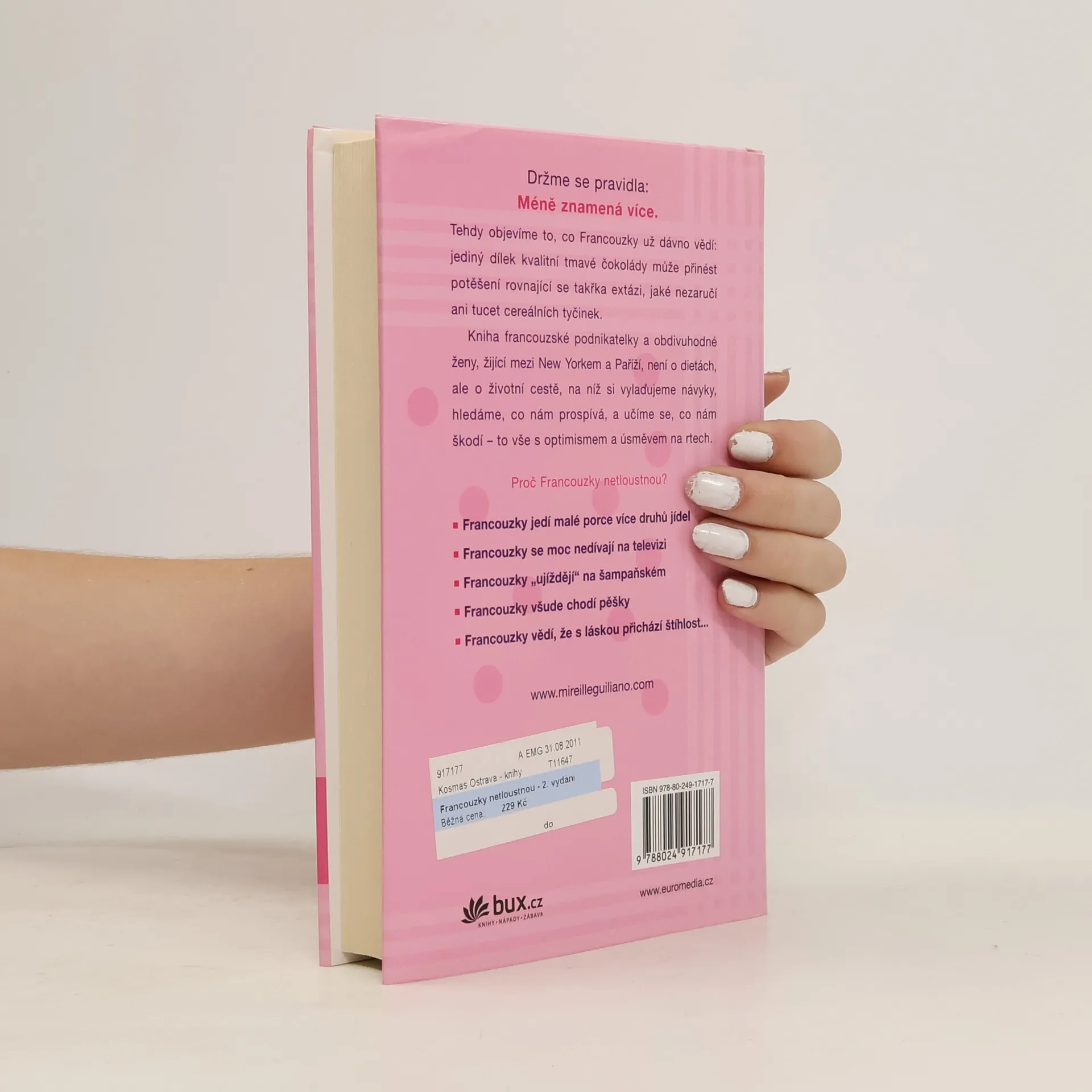 Autorka radí ženám, jak si, podle francouzského vzoru, upravit životosprávu a stravovací návyky a po celý život si udržet ideální hmotnost. Trik spočívá v tom, že nikdy nesmíte hladovět, naopak ke každému jídlu si dopřát několik chodů, ale pouze v malém množství. Občas si můžete dát i kousek svého oblíbeného vysoce kalorického jídla, ale musíte to v brzké době vykompenzovat větší zdrženlivostí. Cílovým pocitem má být uspokojení a radost z jídla, v žádném případě ne strádání. Stravovací návyky je třeba doplnit pitným režimem a pohybovou aktivitou (nikoli však týráním se v tělocvičnách). Dobrý dojem poněkud kalí poznání, že k dosažení uspokojivého výsledku musíte tento nový životní styl praktikovat už do konce života. Součástí textu jsou zajímavé recepty.