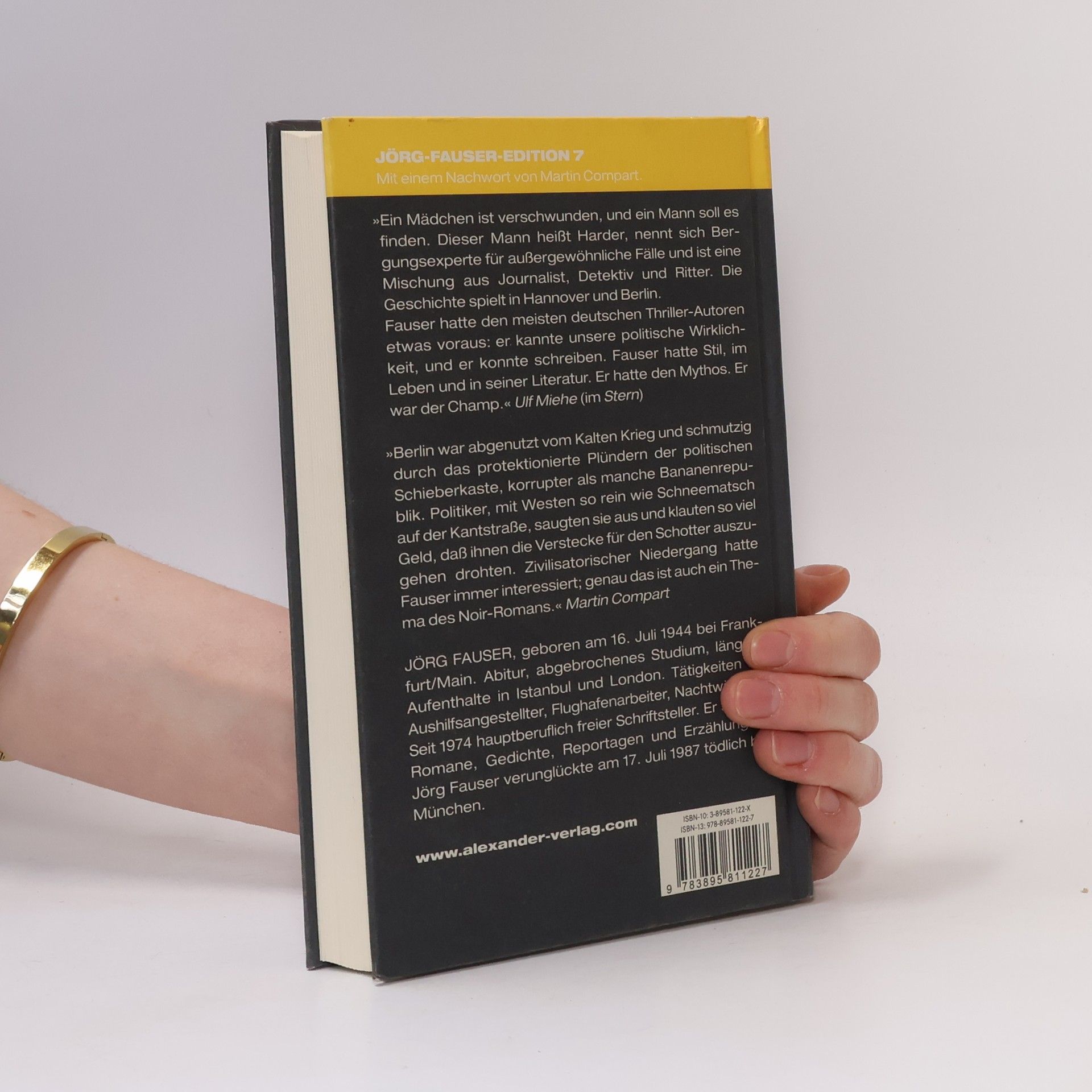 "Zunächst eine typische Genre-Geschichte: ein Mädchen ist verschwunden, und ein Mann soll es finden. Dieser Mann heißt Harder, nennt sich Bergungsexperte für außergewöhnliche Fälle und ist eine Mischung aus Journalist, Detektiv und Ritter. Die Geschichte spielt in Hannover und Berlin. Tatsächlich hatte Fauser den meisten deutschen Thriller-Autoren etwas voraus: er kannte unsere politische Wirklichkeit und er konnte schreiben. Fauser hatte Stil, im Leben und in seiner Literatur. Fauser hatte den Mythos. Er war der Champ.' Ulf Miehe