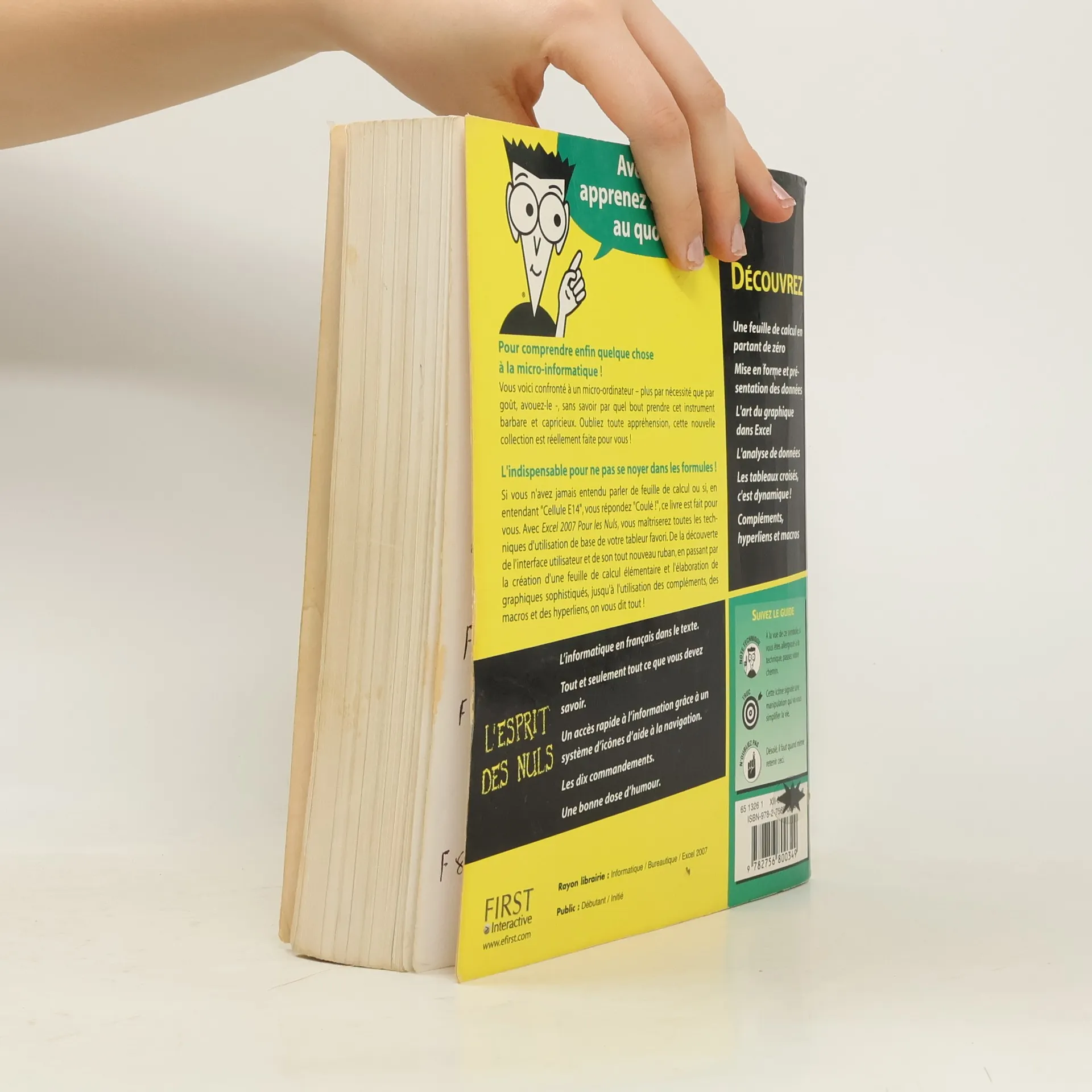 La 4e de couverture indique : Pour comprendre enfin quelque chose à la micro-informatique! Vous voici confronté à un micro-ordinateur - plus par nécessité que par goût, avouez-le -, sans savoir par quel bout prendre cet instrument barbare et capricieux. Oubliez toute appréhension, cette nouvelle collection est réellement faite pour vous! L'indispensable pour ne pas se noyer dans les formules! Si vous n'avez jamais entendu parler de feuille de calcul ou si, en entendant "Cellule E14", vous répondez "Coulé !", ce livre est fait pour vous. Avec Excel 2007 Pour les Nuls, vous maîtriserez toutes les techniques d'utilisation de base de votre tableur favori. De la découverte de l'interface utilisateur et de son tout nouveau ruban, en passant par la création d'une feuille de calcul élémentaire et l'élaboration de graphiques sophistiqués, jusqu'à l'utilisation des compléments, des macros et des hyperliens, on vous dit tout !