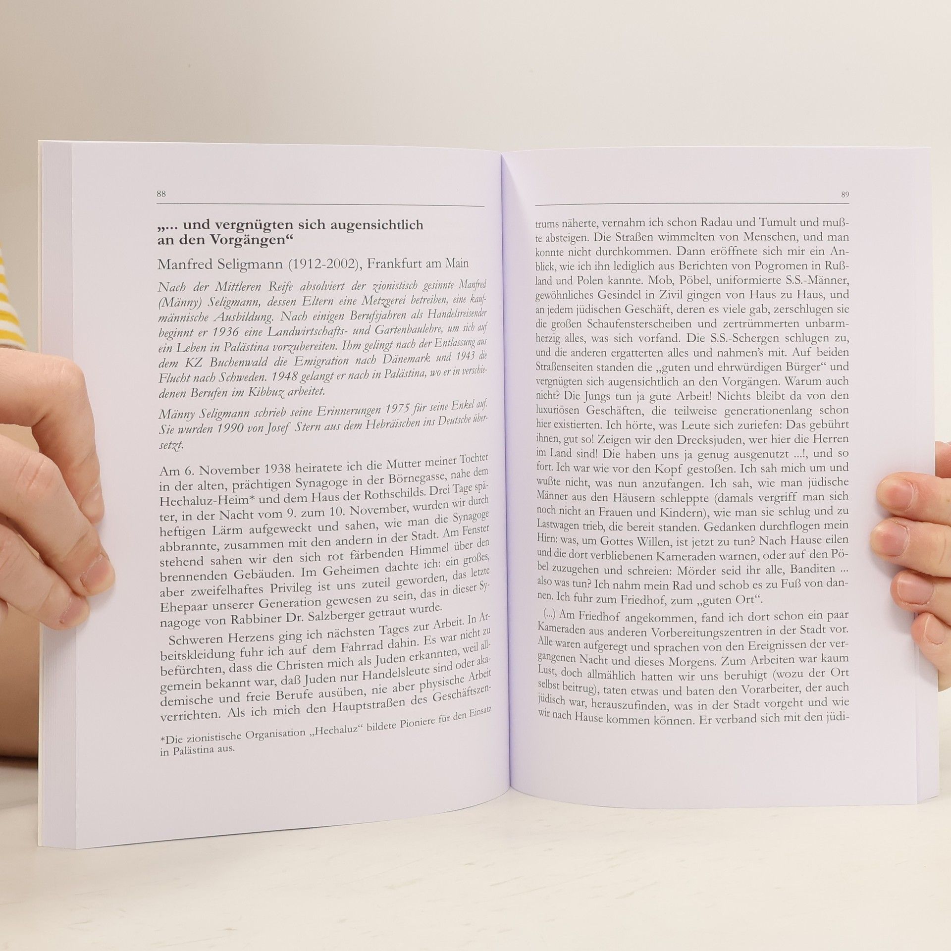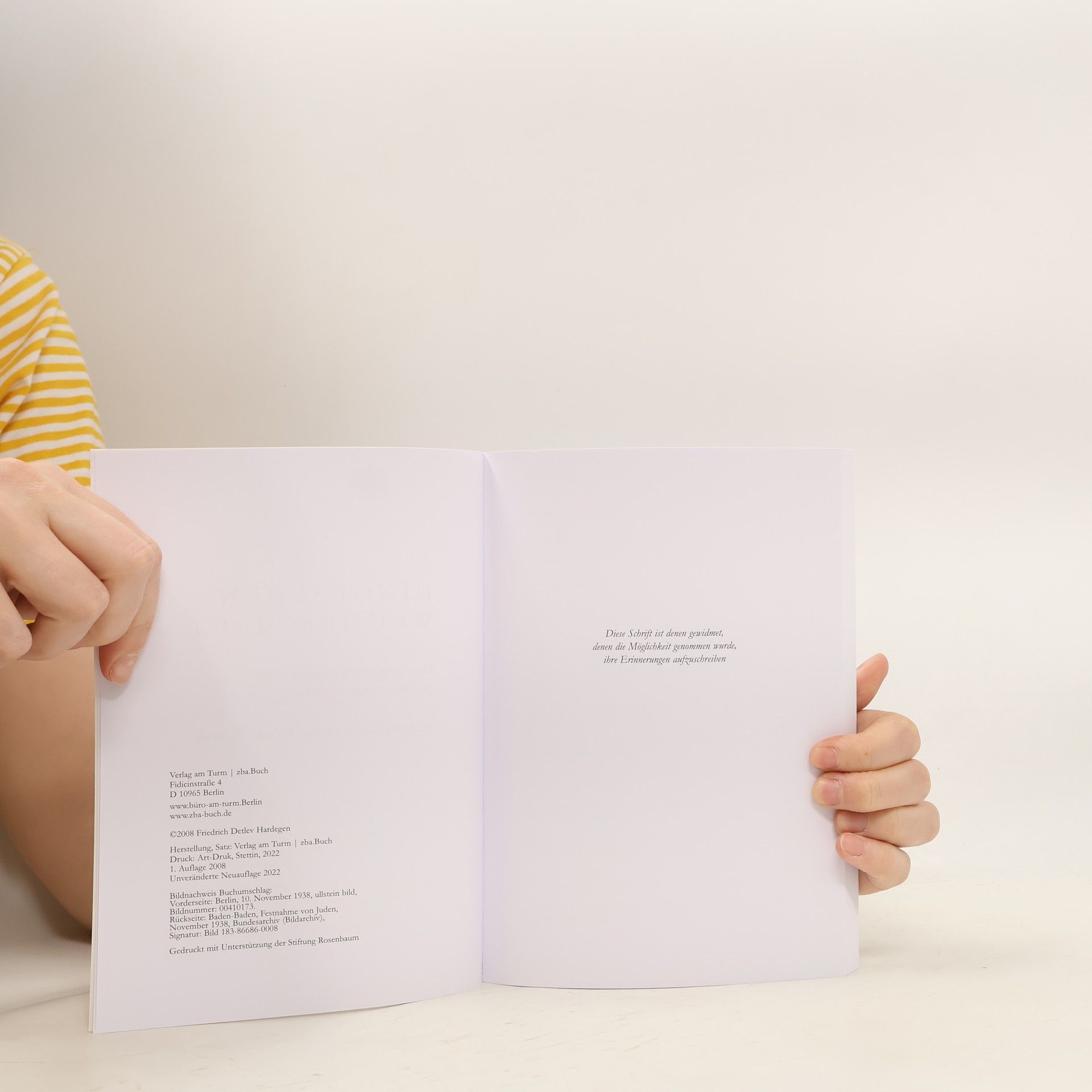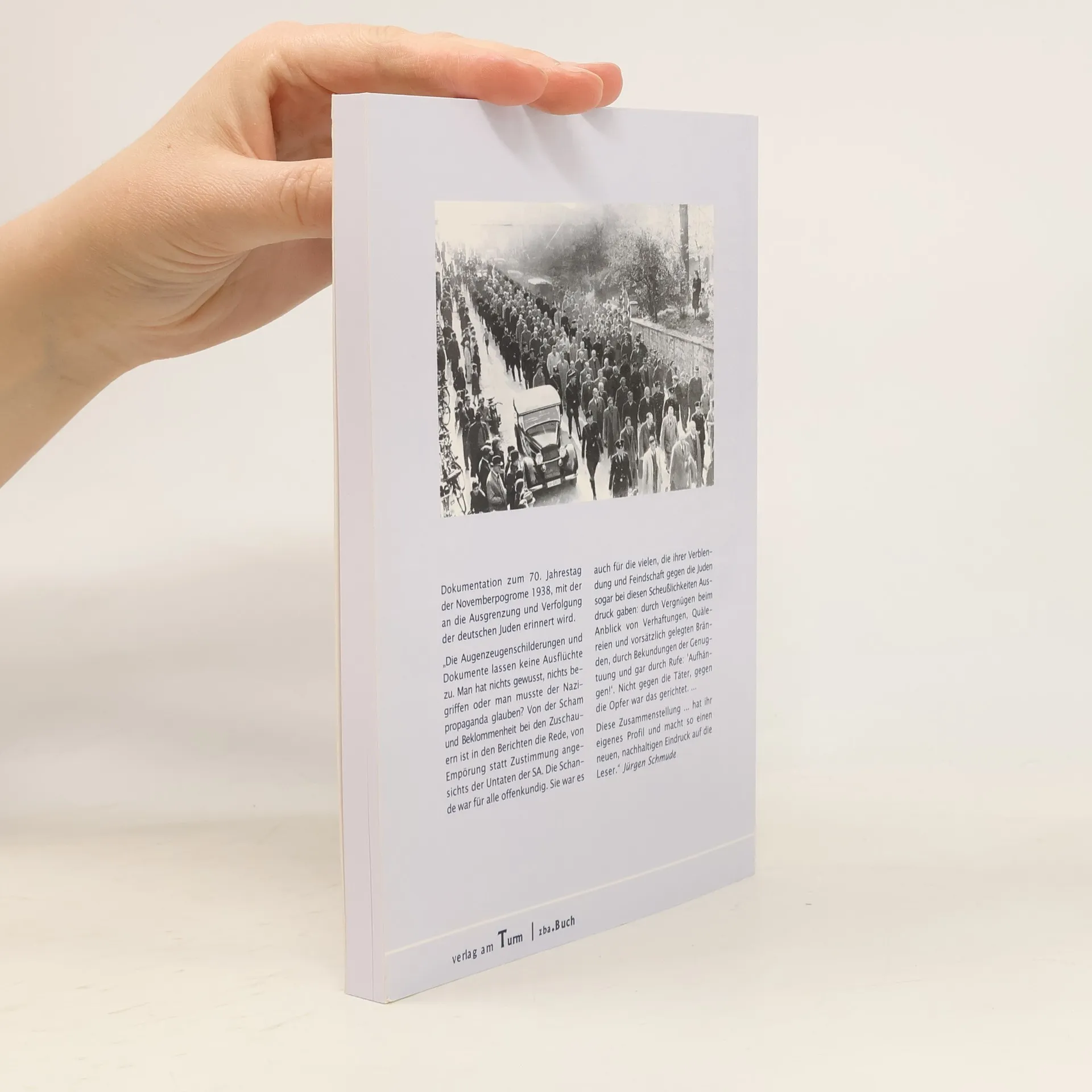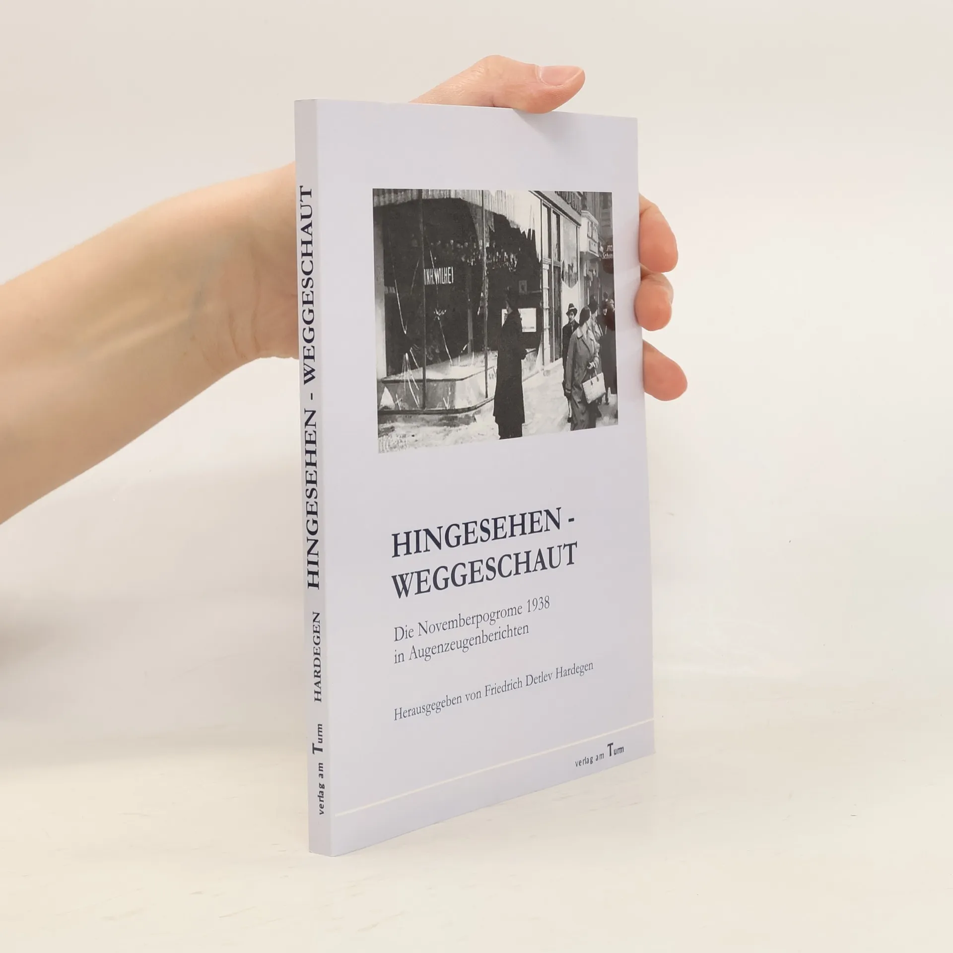 Eine Dokumentation zum 70. Jahrestag der Novemberpogrome im November 2008, mit der an die Ausgrenzung und Verfolgung der deutschen Juden erinnert wird. Hergestellt für die Landeszentrale für politische Bildungsarbeit Berlin. Herausgegeben von Friedrich Detlev Hardegen, unterstützt von der „Stiftung Rosenbaum“– mit einem Vorwort von Jürgen Schmude. Jürgen Schmude (ehemaliger Bundesminister für Bildung und Wissenschaft, Bundesminister der Justiz sowie langjähriger Präses der Synode der EKD): „Die Augenzeugenschilderungen und Dokumente lassen keine Ausflüchte zu. Man hat nichts gewusst, nichts begriffen, oder man musste der Nazipropaganda glauben? Von der Scham und Beklommenheit bei den Zuschauern ist in den Berichten die Rede, von Empörung statt Zustimmung angesichts der Untaten der SA. Die Schande war für alle offenkundig. Sie war es auch für die vielen, die ihrer Verblendung und Feindschaft gegen die Juden sogar bei diesen Scheußlichkeiten Ausdruck gaben: durch beim Anblick von Verhaftungen, Quälereien und vorsätzlich gelegten Bränden, durch Bekundungen der Genugtuung und gar durch Rufe: ‘Aufhängen!’ Nicht gegen die Täter, gegen die Opfer war das gerichtet. Diese Zusammenstellung. hat ihr eigenes Profil und macht so einen neuen, nachhaltigen Eindruck auf die Leser.