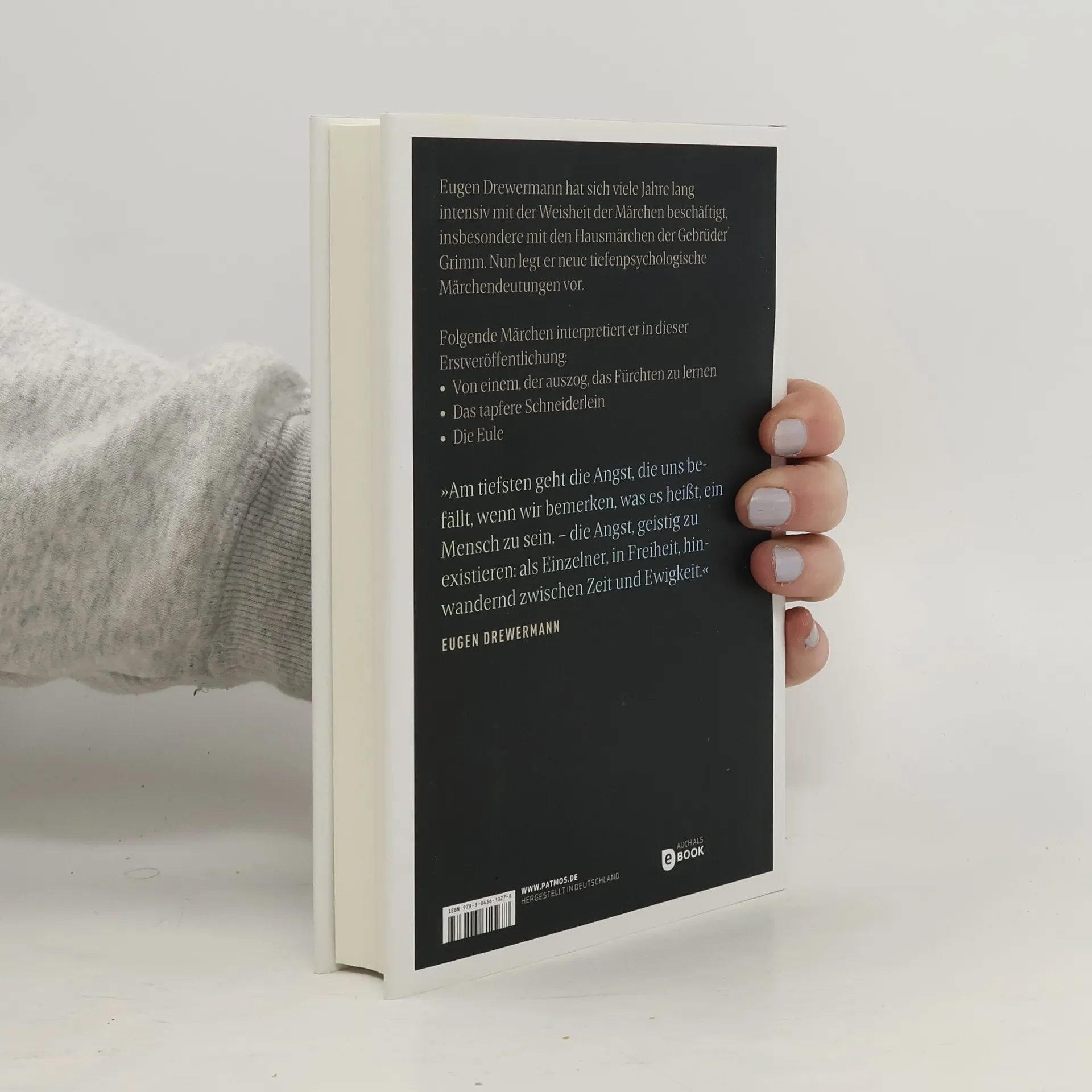 Eugen Drewermann hat sich viele Jahre lang intensiv mit der Weisheit der Märchen beschäftigt, insbesondere mit den Hausmärchen der Gebrüder Grimm. Folgende Märchen interpretiert er in dieser Erstveröffentlichung: – Von einem, der auszog, das Fürchten zu lernen – Das tapfere Schneiderlein – Die Eule. „Am tiefsten geht die Angst, die uns befällt, wenn wir bemerken, was es heißt, ein Mensch zu sein, - die Angst, geistig zu existieren: als Einzelner, in Freiheit, hinwandernd zwischen Zeit und Ewigkeit. […] Im Grunde läßt sie sich nur lösen in Vertrauen, doch dazu brauchte es eines gewissermaßen religiösen Haltepunkts. Ein solcher Halt im Absoluten läßt sich nicht verordnen noch verfügen; es läßt sich freilich zeigen, was passiert, wenn er uns fehlt. Wir werden dann die Angst verdrängen oder anderen Angst machen oder die vermeintlichen Angstquellen auszuschalten suchen. In jedem Falle finden wir niemals uns selbst, gelangen wir nie wirklich zu den anderen und werden niemals Ruhe haben.“/ E. DREWERMANN