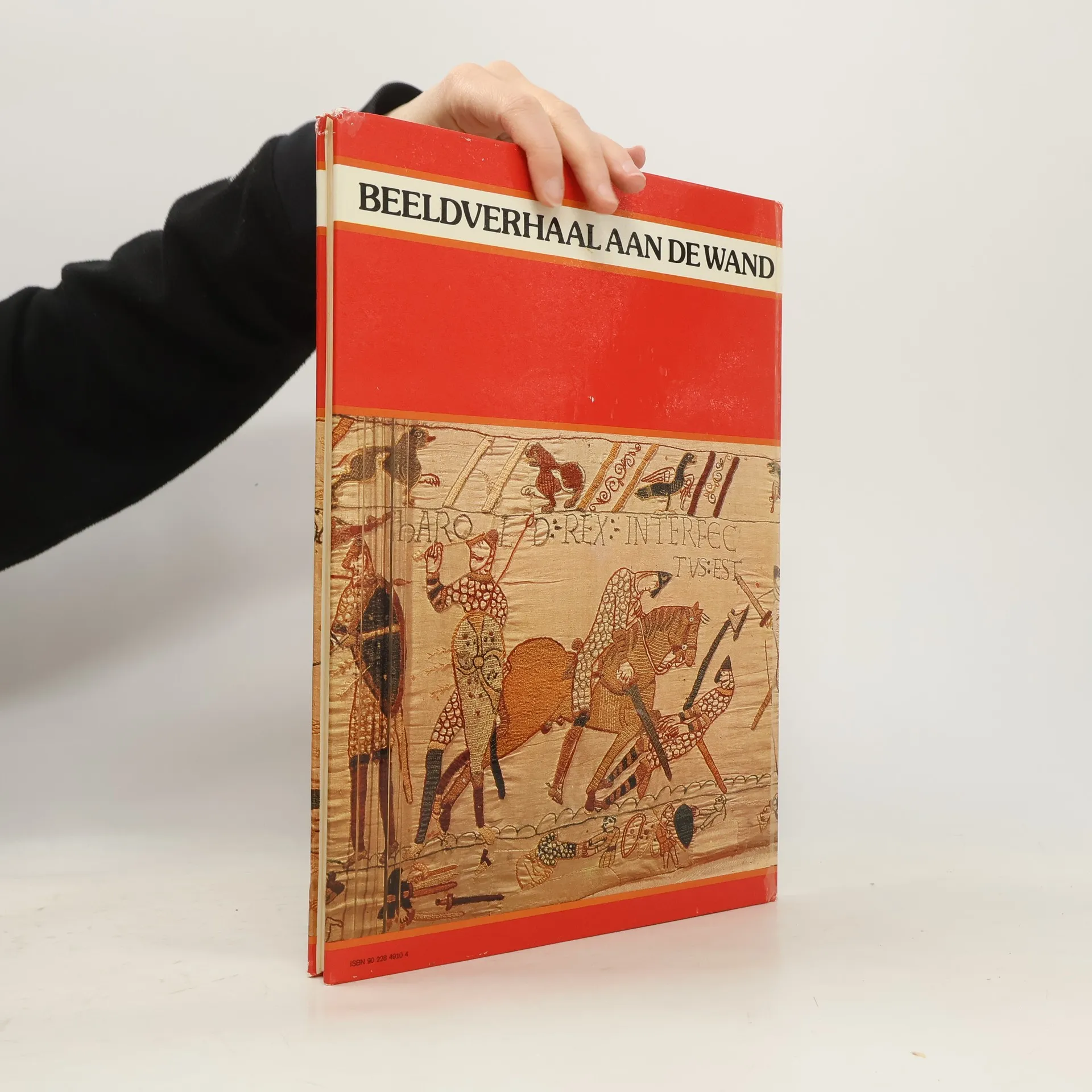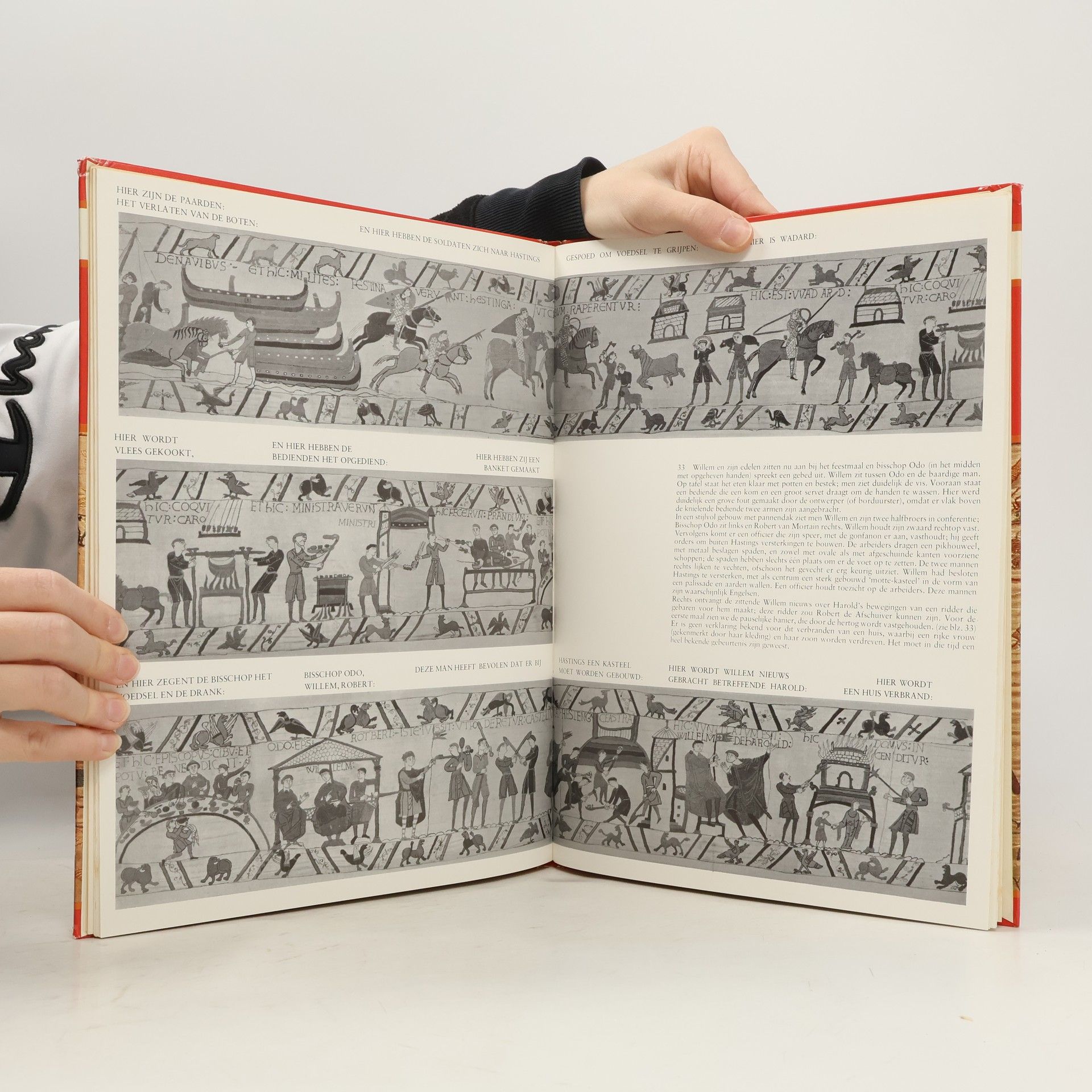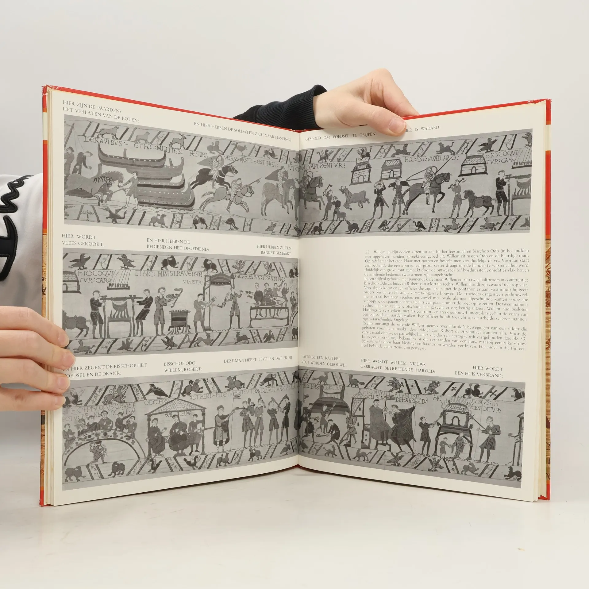 Afbeeldingen in zwart-wit en in kleur met beschrijvingen van de taferelen op het in de 11e eeuw vervaardigde borduursel te Bayeux in Normandië, waarop de slag bij Hastings in 1066 is weergegeven.