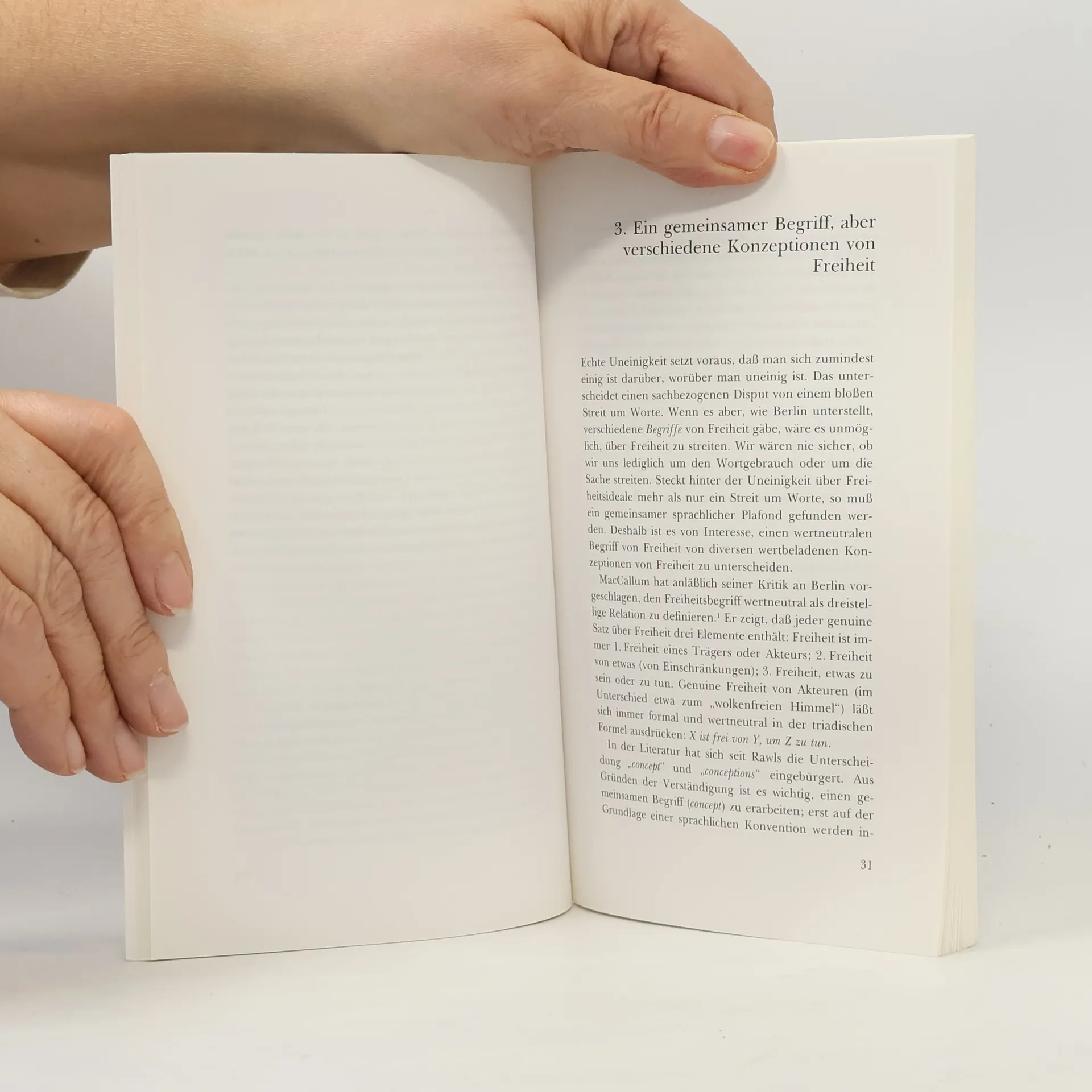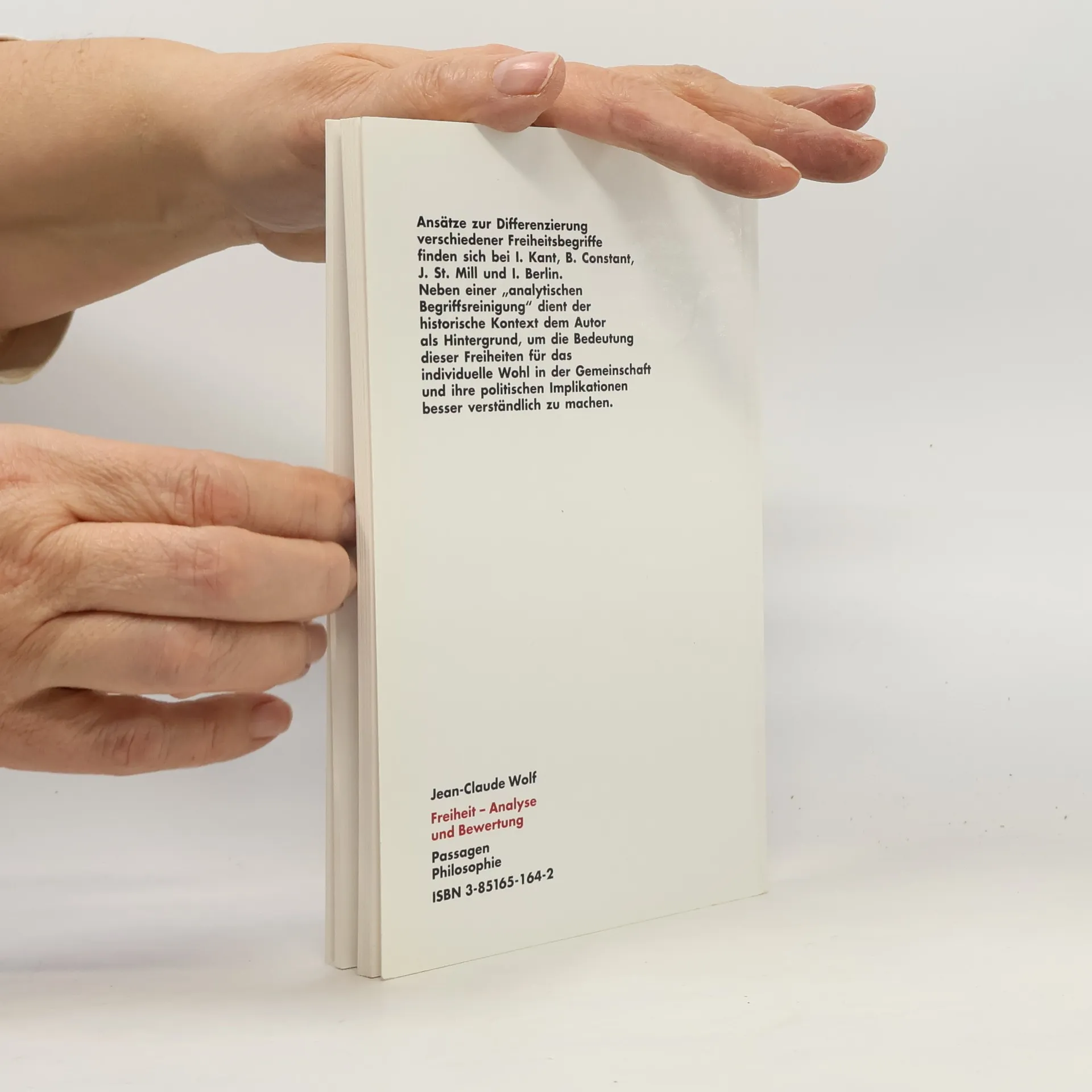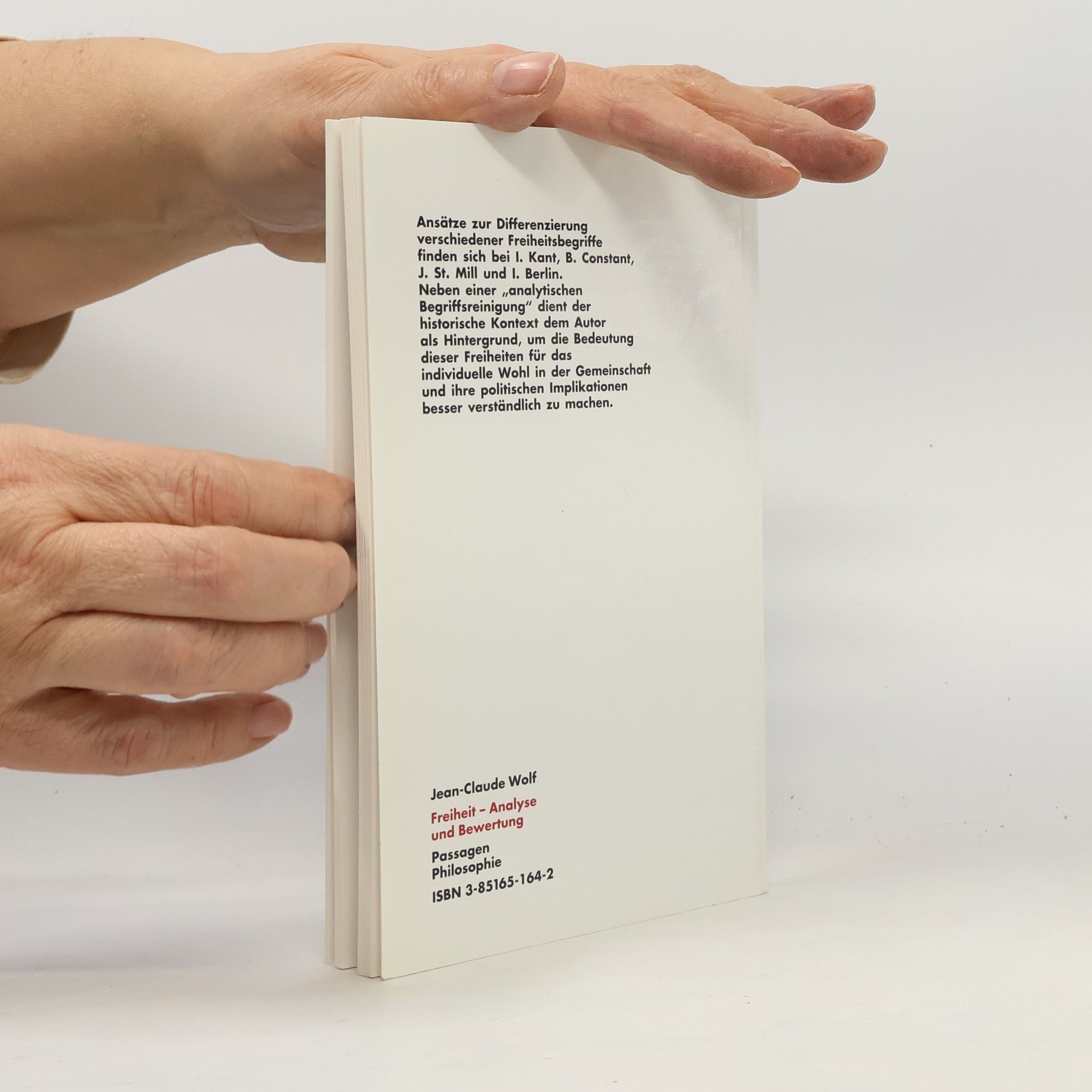 Oft werden Freiheit, ihre Vorbedingungen und andere Wertvorstellungen vermischt. Ansätze zur Differenzierung verschiedener Freiheitsbegriffe finden sich bei Immanuel Kant, Benjamin Constant, John Stuart Mill und Isaiah Berlin. Die vorliegende Arbeit dokumentiert die reichhaltige zeitgenössische Diskussion, die insbesondere an Berlin, aber auch an Kant anknüpft. Zwei Begriffe von Freiheit – negative Freiheit, ungehindert etwas zu tun, was ich will, und eine minimale Explikation von Autonomie als Wahlfreiheit – werden gegen konkurrierende Begriffe und gegen zahlreiche Einwände verteidigt. Neben dieser „analytischen Begriffsreinigung“ dient der historische Kontext und der Reichtum von Werten als Hintergrund, um die Bedeutung dieser Freiheiten für das individuelle Wohl in der Gemeinschaft und ihre politischen Implikationen besser zu verstehen.