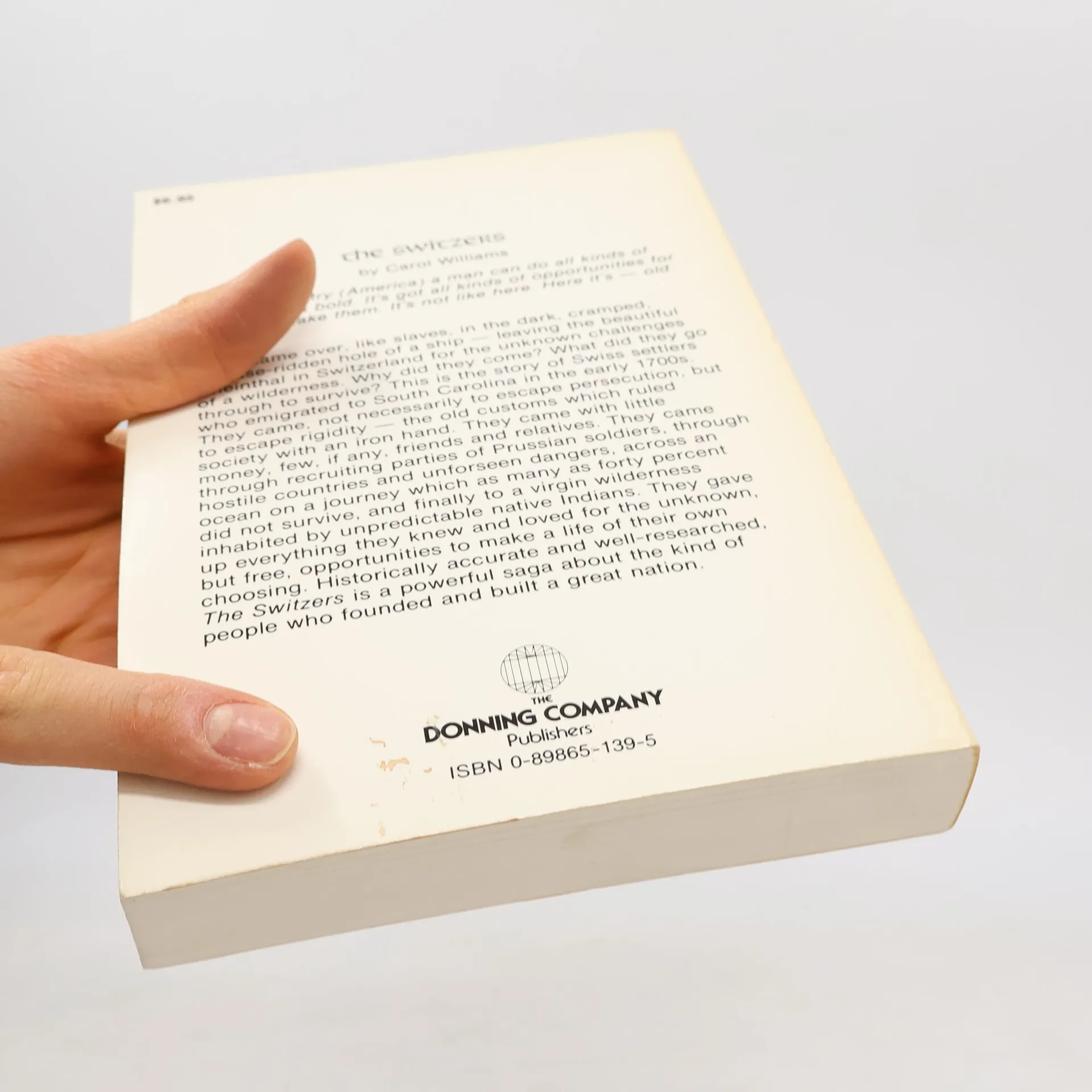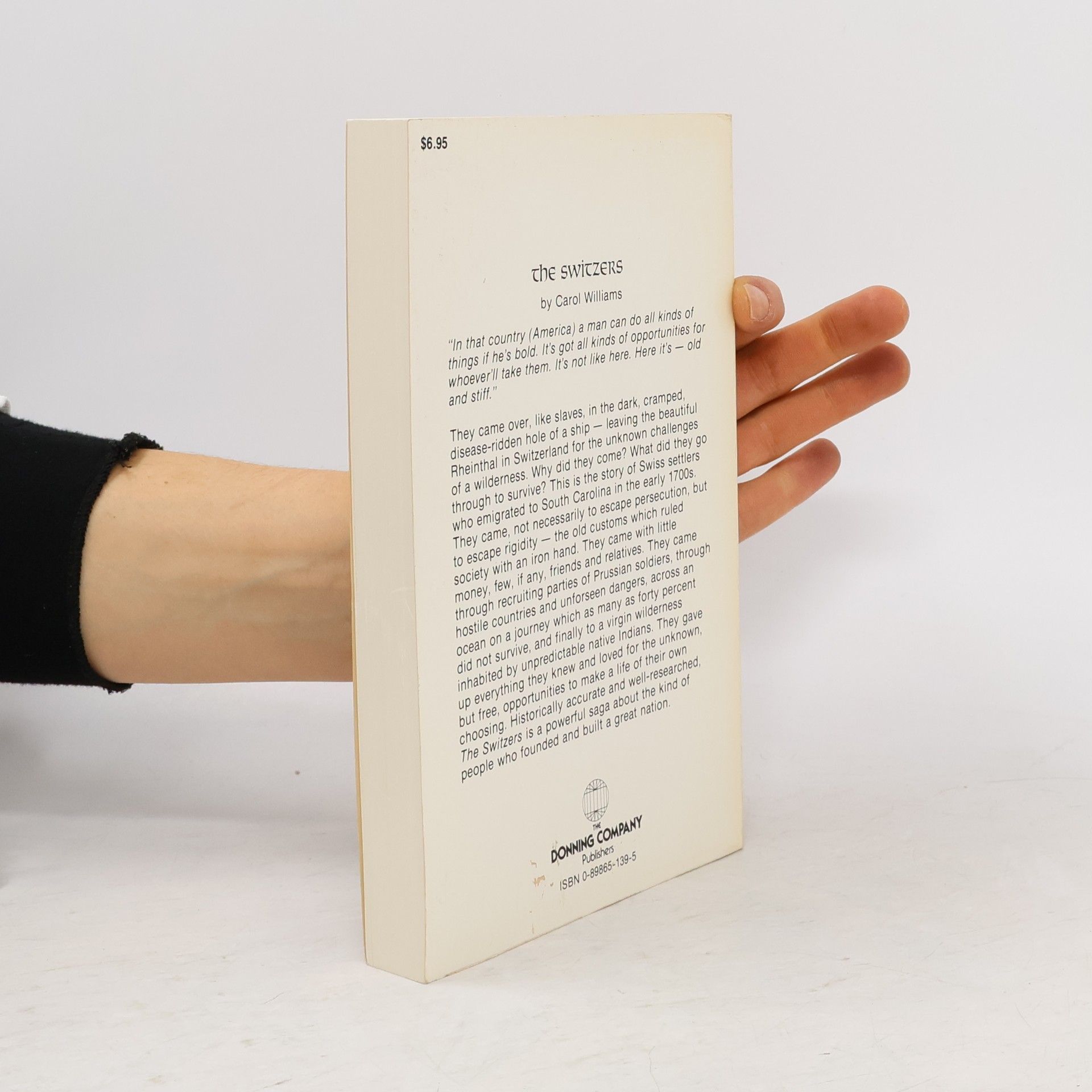 [From Back cover] "In that country (America) a man can do all kinds of things If he's bold. It's got all kinds of opportunities for whoever'll take them. It's not like here. Here it's â old and stiff." They came over, like slaves, in the dark, cramped, disease-ridden hole of a ship â leaving the beautiful Rheinthal in Switzerland for the unknown challenges of a wilderness. Why did they come? What did they go through to survive? This is the story of Swiss settlers who emigrated to South Carolina in the early 1700s. They came, not necessarily to escape persecution, but to escape rigidity â the old customs which ruled society with an iron hand. They came with little money, few, if any, friends and relatives. They came through recruiting parties of Prussian soldiers, through hostile countries and unforseen dangers, across an ocean on a journey which as many as forty percent did not survive, and finally to a virgin wilderness inhabited by unpredictable native Indians. They gave up everything they knew and loved for the unknown, but free, opportunities to make a life of their own choosing. Historically accurate and well-researched the Switzers is a powerful saga about the kind of people who founded and built a great nation.