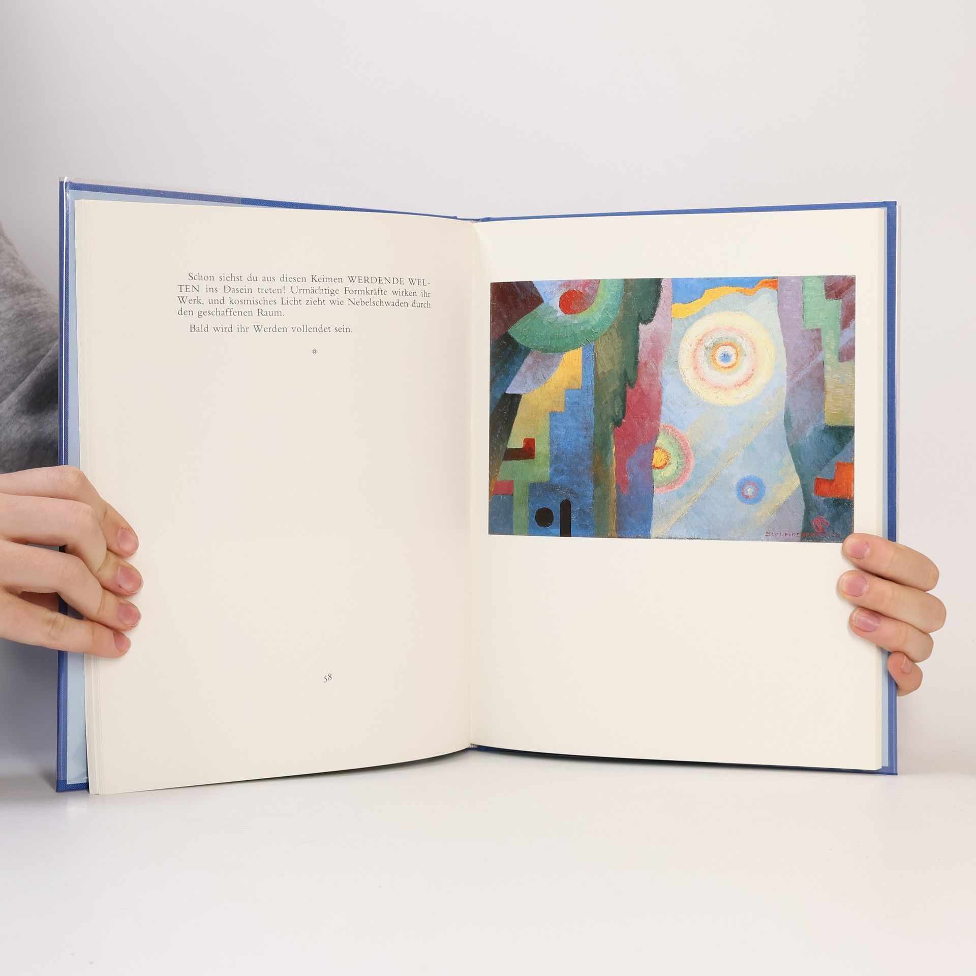 Ganz für sich steht im geistigen Lehrwerk von Bo Yin Ra das durch zwanzig Farbdrucke nach seinen geistlichen Bildern erläuterte Buchwerk: „Welten“ das in einen Bereich der Struktur ewigen Geistes führt, der ohne bildhafte Darstellung der Seele nicht in seiner Eigenformung erfassbar werden könnte, - ja diese Nachgestaltung in Farbe und Linie kategorisch erheischt, um die innerhalb der irdisch bedingten Vorstellungswelt des Erdenmenschen geschmiedeten Fesseln zu lösen in die seine Vorstellungen vom Ewigen eingekettet sind. Reproduktionen nach Gemälden von Bô Yin Râ (Joseph Anton Schneiderfranken)
