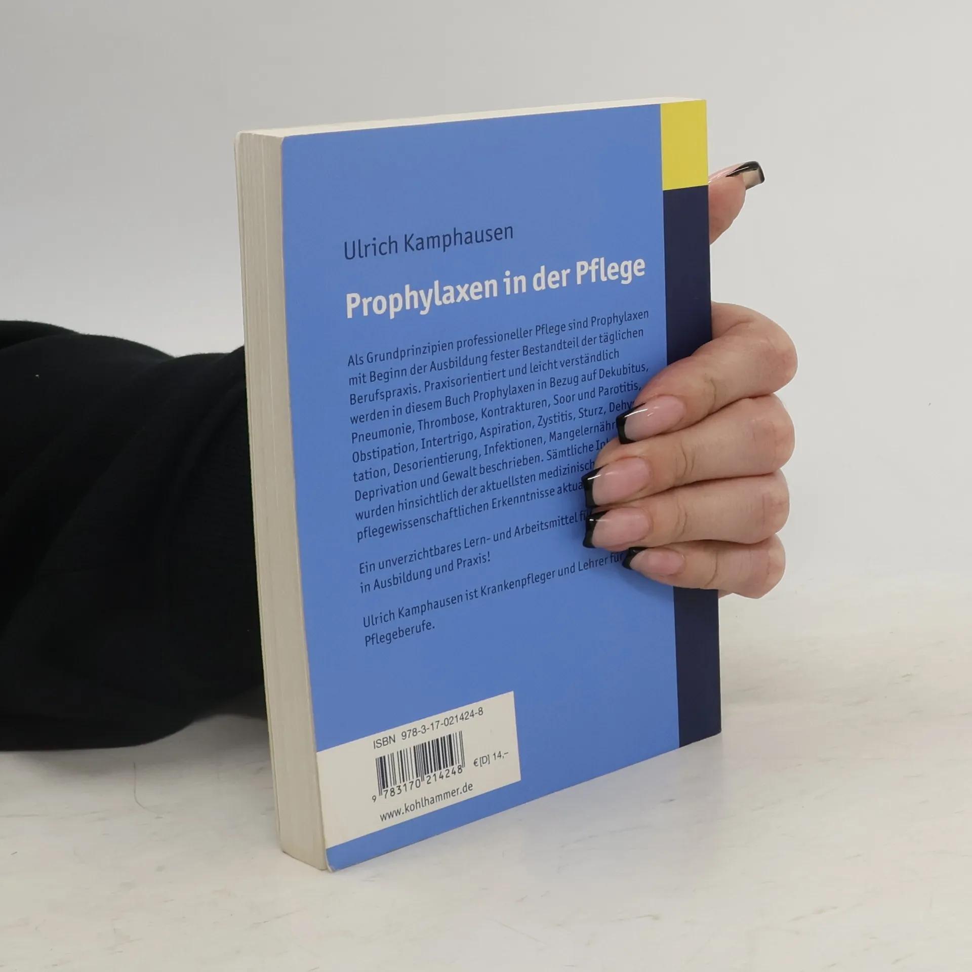 Als Grundprinzipien professioneller Pflege sind Prophylaxen mit Beginn der Ausbildung fester Bestandteil der täglichen Berufspraxis. Praxisorientiert und leicht verständlich werden in diesem Buch Prophylaxen in Bezug auf Dekubitus, Pneumonie, Thrombose, Kontrakturen, Soor und Parotitis, Obstipation, Intertrigo, Aspiration, Zystitis, Sturz, Dehydratation, Desorientierung, Infektionen, Mangelernährung, Deprivation und Gewalt beschrieben. Sämtliche Inhalte wurden hinsichtlich der aktuellsten medizinischen und pflegewissenschaftlichen Erkenntnisse aktualisiert. Ein unverzichtbares Lern- und Arbeitsmittel für Pflegende in Ausbildung und Praxis! Passend hierzu gibt es jetzt auch ein Arbeitsbuch (ISBN 978-3-17-021425-5), in dem Wissen zur Rekapitulation und Vertiefung gezielt durch unterschiedliche Fragetypen (Kreuzworträtsel, Fallbeispiele, Lückentexte etc.) abgefragt werden kann.