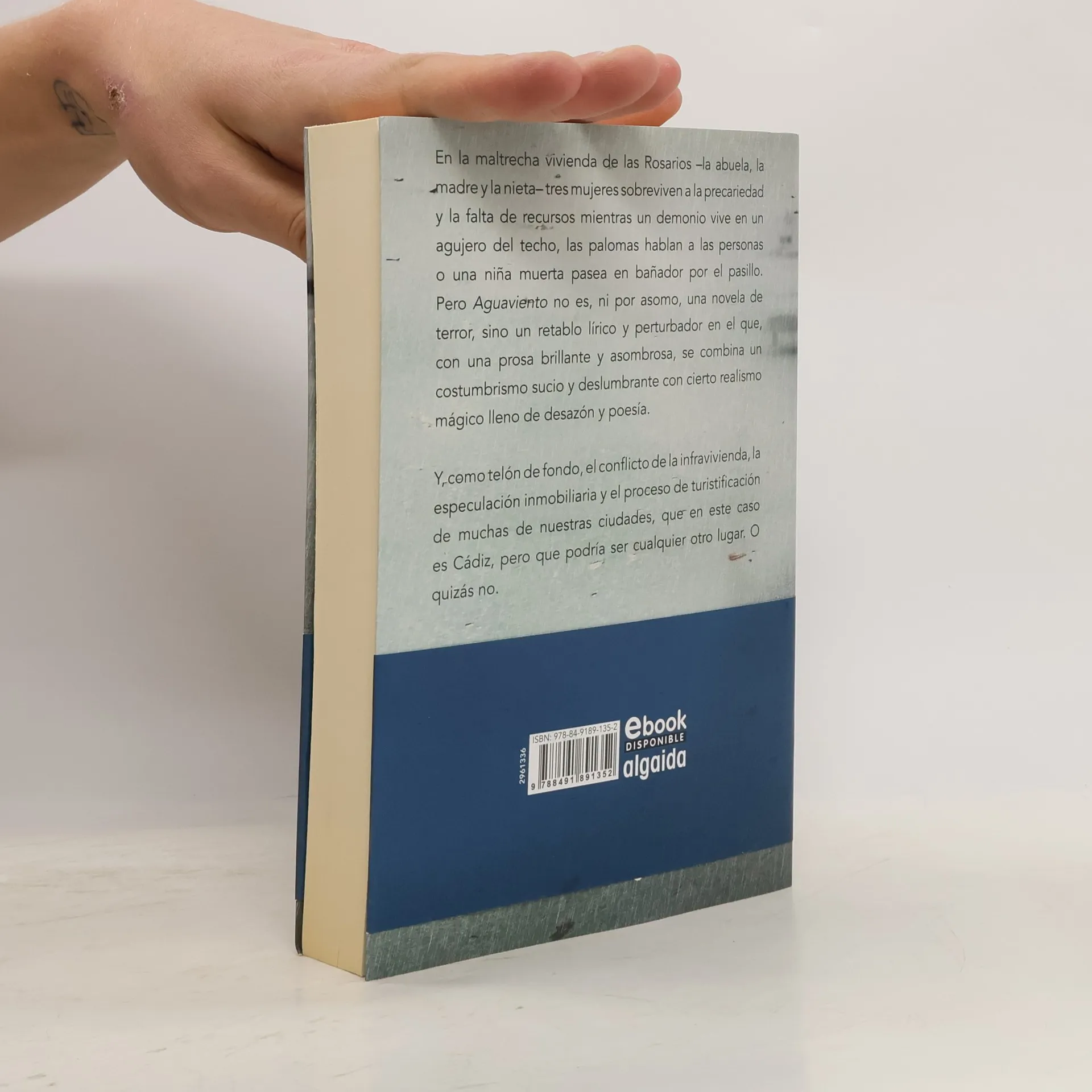 En la maltrecha vivienda de las Rosarios -la abuela, la madre y la nieta- tres mujeres sobreviven a la precariedad y la falta de recursos mientras un demonio vive en un agujero del techo, las palomas hablan a las personas o una niña muerta pasea en bañador por el pasillo. Pero Aguaviento no es, ni por asomo, una novela de terror, sino un retablo lírico y perturbador en el que, con una prosa brillante y asombrosa, se combina un costumbrismo sucio y deslumbrante con cierto realismo mágico lleno de desazón y poesía. Y, como telón de fondo, el conflicto de la infravivienda, la especulación inmobiliaria y el proceso de turistificación de muchas de nuestras ciudades, que en este caso es Cádiz, pero que podría ser cualquier otro lugar. O quizás no.