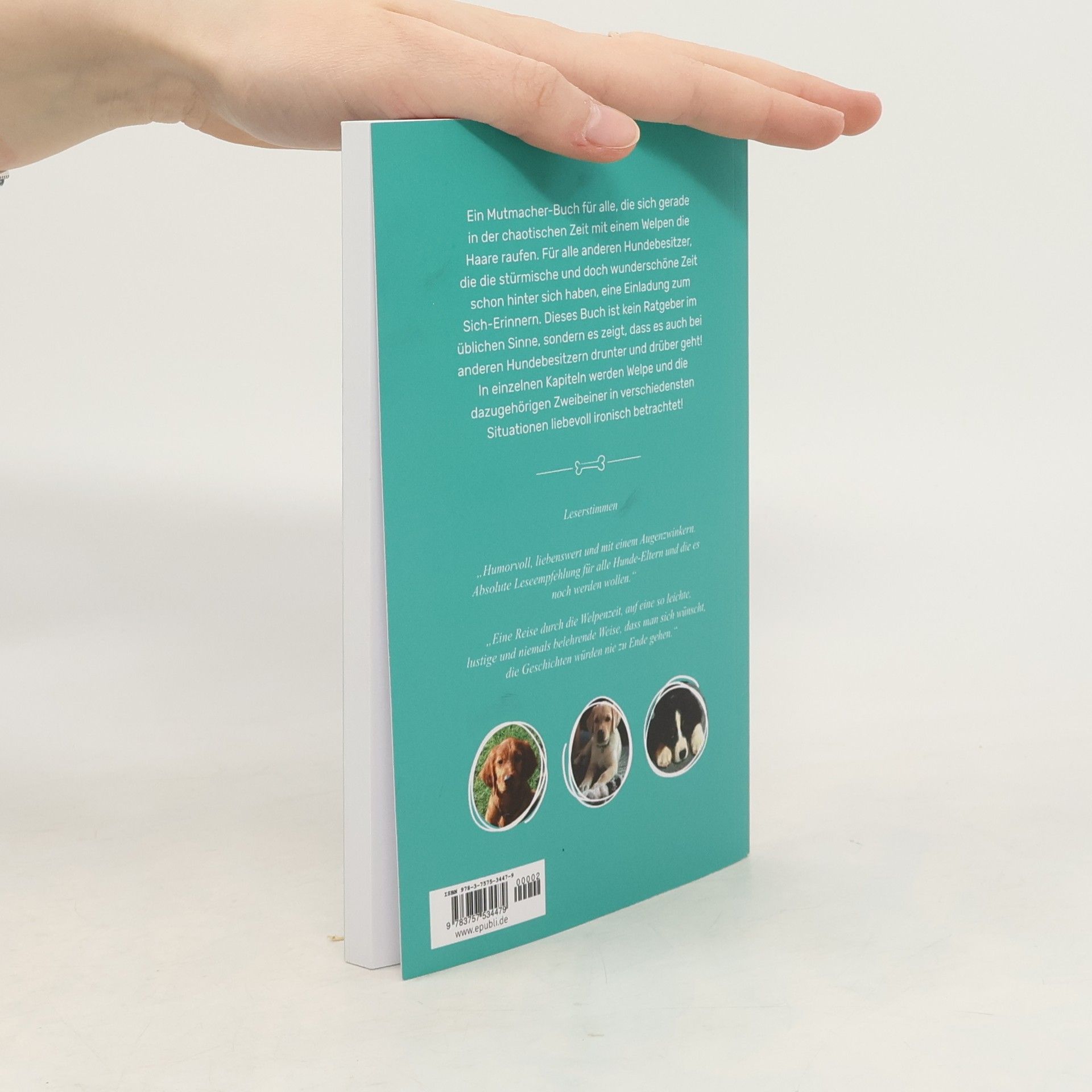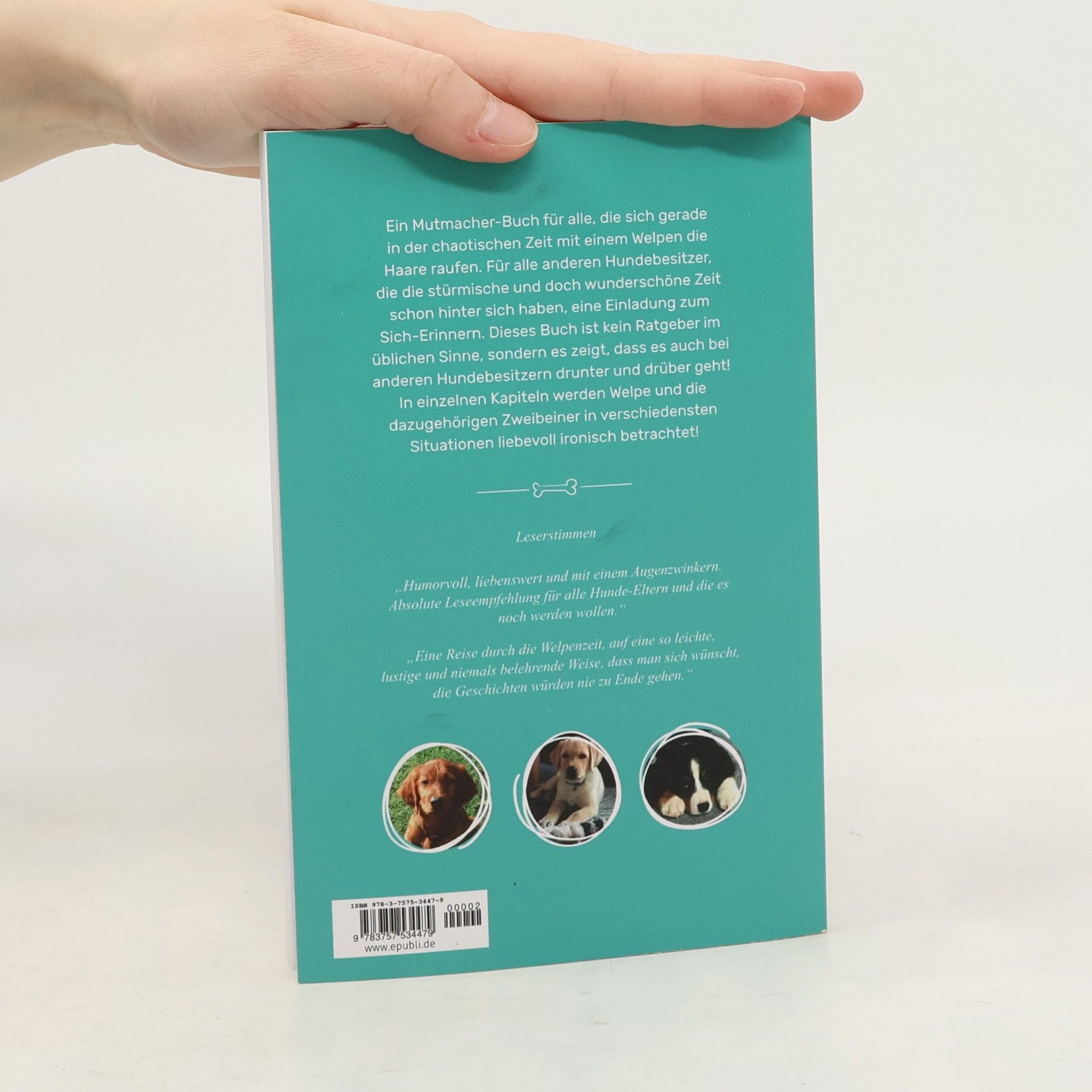 Ein Mutmacher-Buch für alle, die sich gerade in der chaotischen Zeit mit einem Welpen die Haare raufen. Für alle anderen Hundebesitzer, die die stürmische und doch wunderschöne Zeit schon hinter sich haben, eine Einladung zum Sich-Erinnern. Dieses Buch ist kein Ratgeber im üblichen Sinne, sondern es zeigt, dass es auch bei anderen Hundebesitzern drunter und drüber geht! In einzelnen Kapiteln werden Welpe und die dazugehörigen Zweibeiner in verschiedensten Situationen liebevoll ironisch betrachtet!