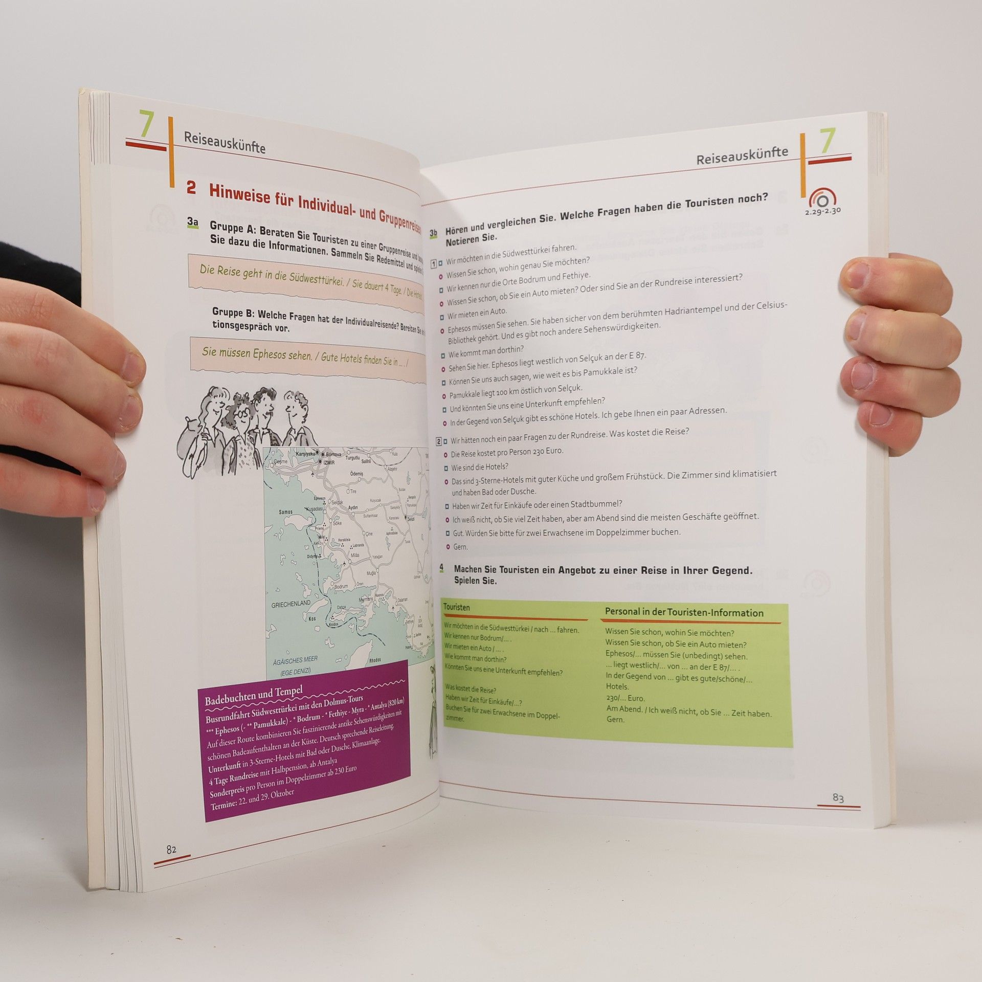 Angestellte in Gastronomie und Touristen-Informationen lernen, die wichtigsten Situationen ihres Berufsalltags mit deutschen Gästen zu bewältigen. Kurstragend oder kursbegleitend einsetzbar, mit intensivem Training von Hörverstehen und Sprechfertigkeit.