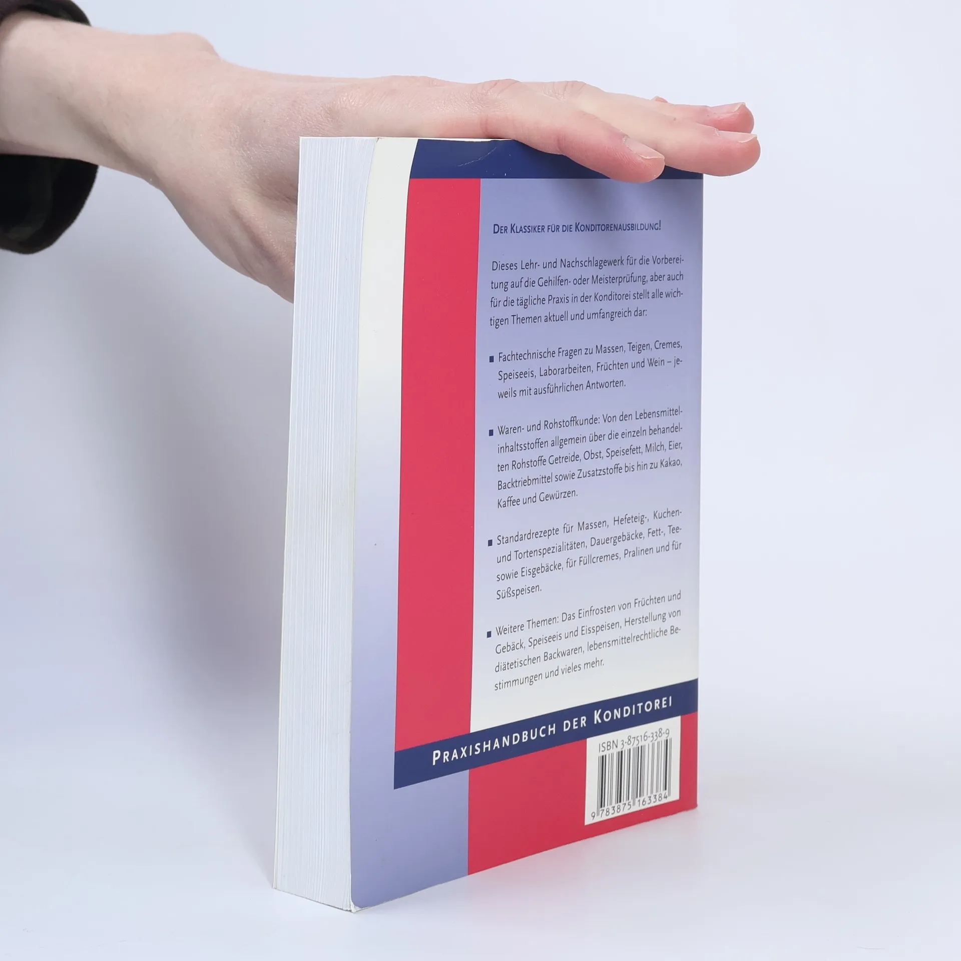 Das in der 6., vollständig überarbeiteten Auflage erschienene Buch ist ein Klassiker für die Vorbereitung der Gehilfen- oder Meisterprüfung, ein Nachschlagewerk für die Praxis und ein ideales Lehrbuch für die Weiterbildung. Weit über 500 fachtechnische Fragen aus allen Wissensgebieten der Konditorei mit ausführlichen Antworten. Über 280 Standardrezepturen wichtiger Massen, Gebäcke, Cremes, für die Zubereitung von Eis, für Spezialitäten und für Diabetikererzeugnisse. Ein Klassiker der Konditorei-Literatur. 1968 erstmals erschienen, immer wieder vollständig überbearbeitet. Aktuell und informativ.