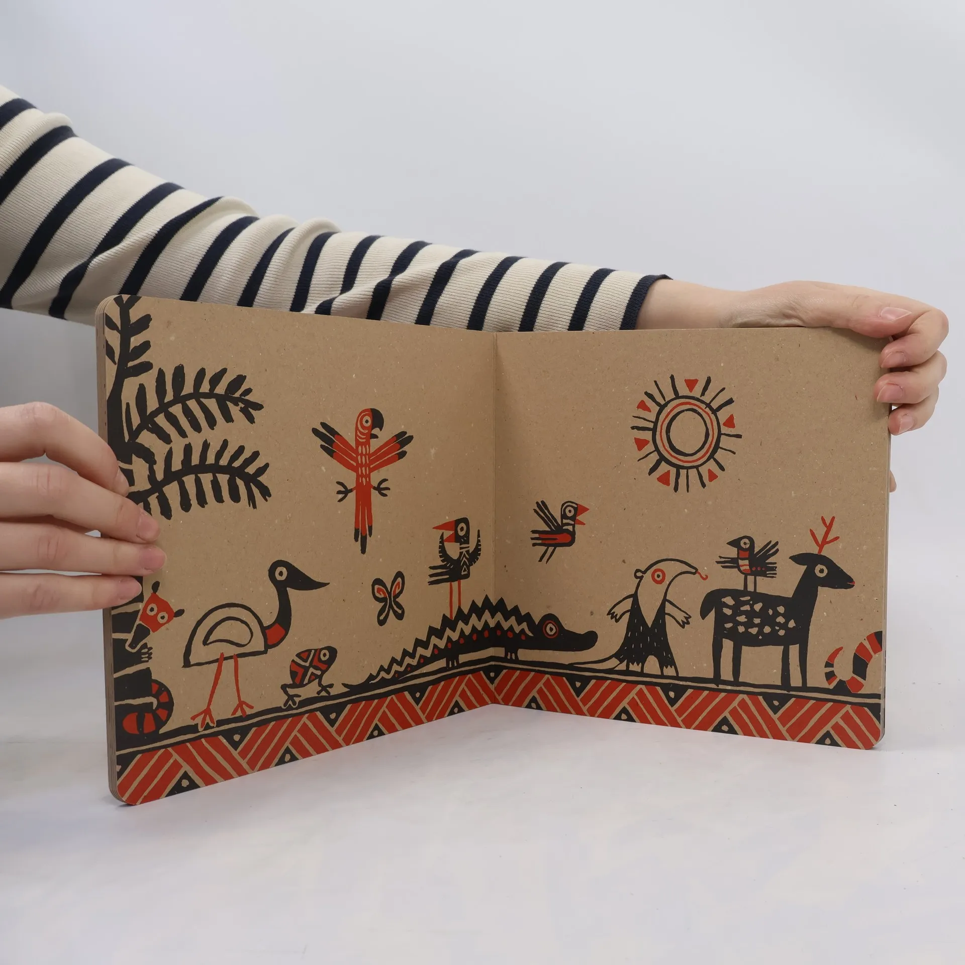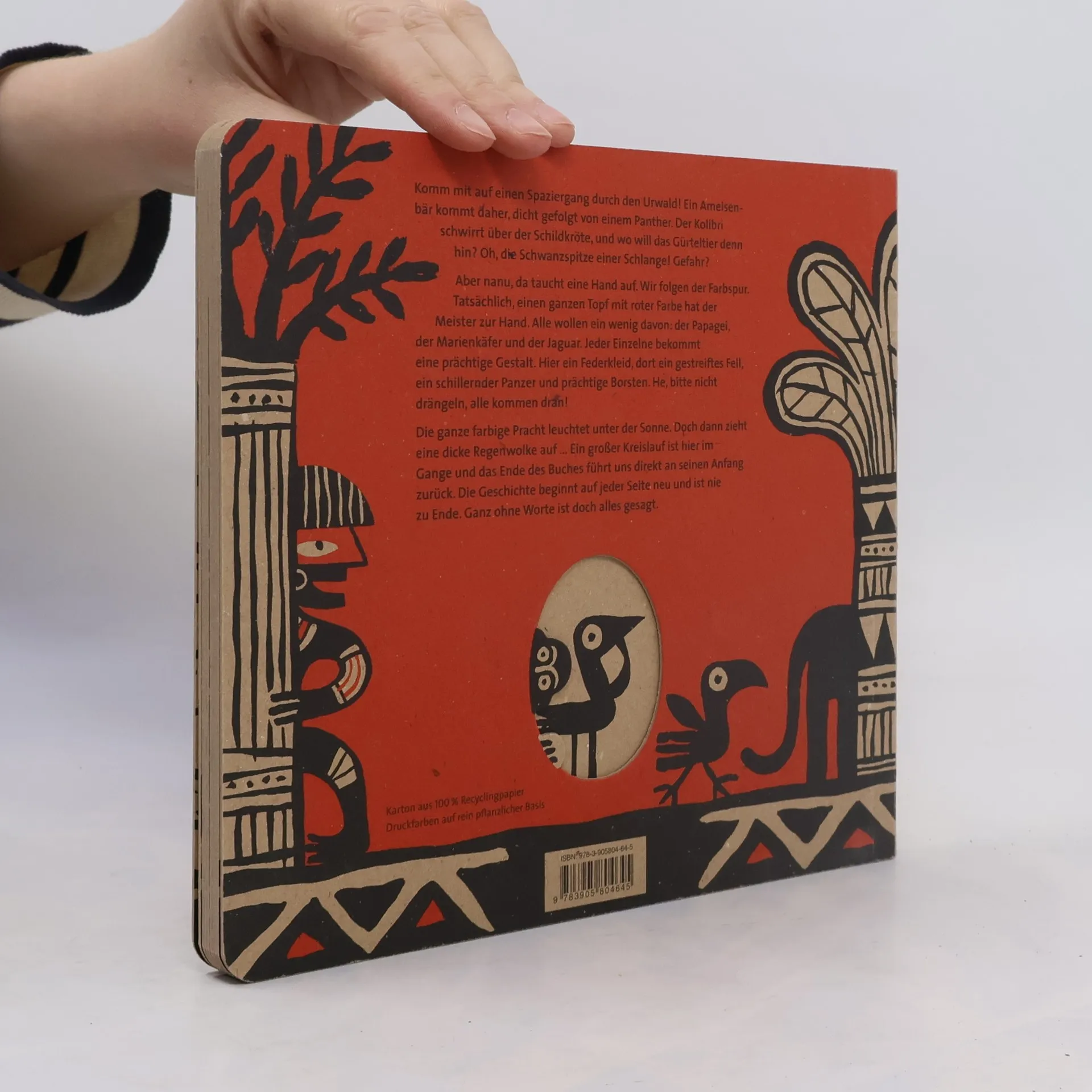 Kommst du mit auf einen Spaziergang durch den Urwald? Ein Ameisenbär kommt daher, dicht gefolgt von einem Panther. Der Kolibri schwirrt über der Schildkröte, und wo will das Gürteltier denn hin? Oh, die Schwanzspitze einer Schlange, Gefahr? Aber nanu, da taucht eine Hand auf. Wir folgen der Farbspur. Tatsächlich, einen ganzen Topf mit roter Farbe hat der Meister zur Hand. Alle wollen etwas davon: Der Papagei, der Marienkäfer und der Leopard. Jeder Einzelne bekommt eine prächtige Gestalt. Hier ein Federkleid, dort eine gestreiftes Fell, ein schillernder Panzer und prächtige Borsten. He, bitte nicht drängeln, alle kommen dran! Die ganze farbige Pracht leuchtet unter der Sonne. 'Bin ich schön?', fragt sich nicht nur der Tukan. Doch dann zieht eine dicke Regenwolke auf. Das ist nun mal der Lauf der Dinge … Ein grosser Kreislauf ist hier im Gange und das Ende des Buches führt uns direkt an seinen Anfang zurück. Die Geschichte beginnt auf jeder Seite neu und ist nie zu Ende. Ganz ohne Worte ist doch alles gesagt.
