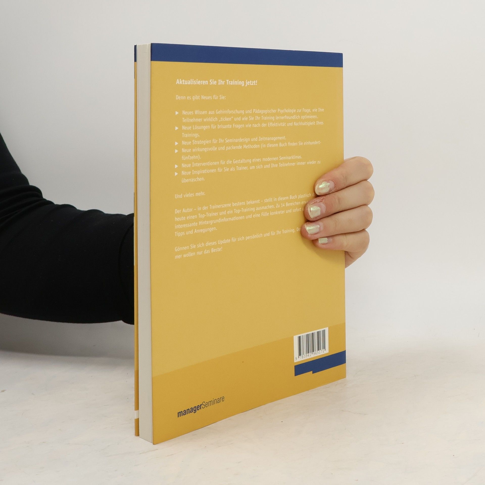 Aktualisieren Sie Ihr Training jetzt! Denn es gibt neue Lösungen für brisante Fragen wie die nach der Effektivität und Nachhaltigkeit Ihres Business-Trainings. Neue Strategien für Ihr Seminardesign und Zeitmanagement. Neue wirkungsvolle und 115 packende Methoden. Diese Updates warten auf Sie: Neues Wissen aus Gehirnforschung und pädagogischer Psychologie zur Frage, wie Ihre Teilnehmer wirklich „ticken“ und wie Sie Ihr Training lernerfreundlich optimieren. Neue Lösungen für brisante Fragen wie nach der Effektivität und Nachhaltigkeit Ihres Trainings. Neue Strategien für Ihr Seminardesign und Zeitmanagement. Neue wirkungsvolle und packende Methoden (in diesem Buch finden Sie einhundertfünfzehn). Neue Interventionen für die Gestaltung eines modernen Seminarklimas. Neue Inspirationen für Sie als Trainer, um sich und Ihre Teilnehmer immer wieder zu überraschen. Der Autor Bernd Weidenmann – in der Trainerszene bestens bekannt – inspiriert Sie zu Gedankenausflügen, was heute einen Top-Trainer und ein Top-Training ausmachen. Dabei ist das Buch besonders gut geeignet für routinierte Profitrainer. Denn sie trainieren zusätzlich zum fachlichen oder methodischen Können die Wachheit ihrer Sinne für das Neue, Unerwartete, Nachhaltige. Gönnen Sie sich dieses Update für sich persönlich und für Ihr Training. Denn Ihre Teilnehmer wollen nur das Beste!