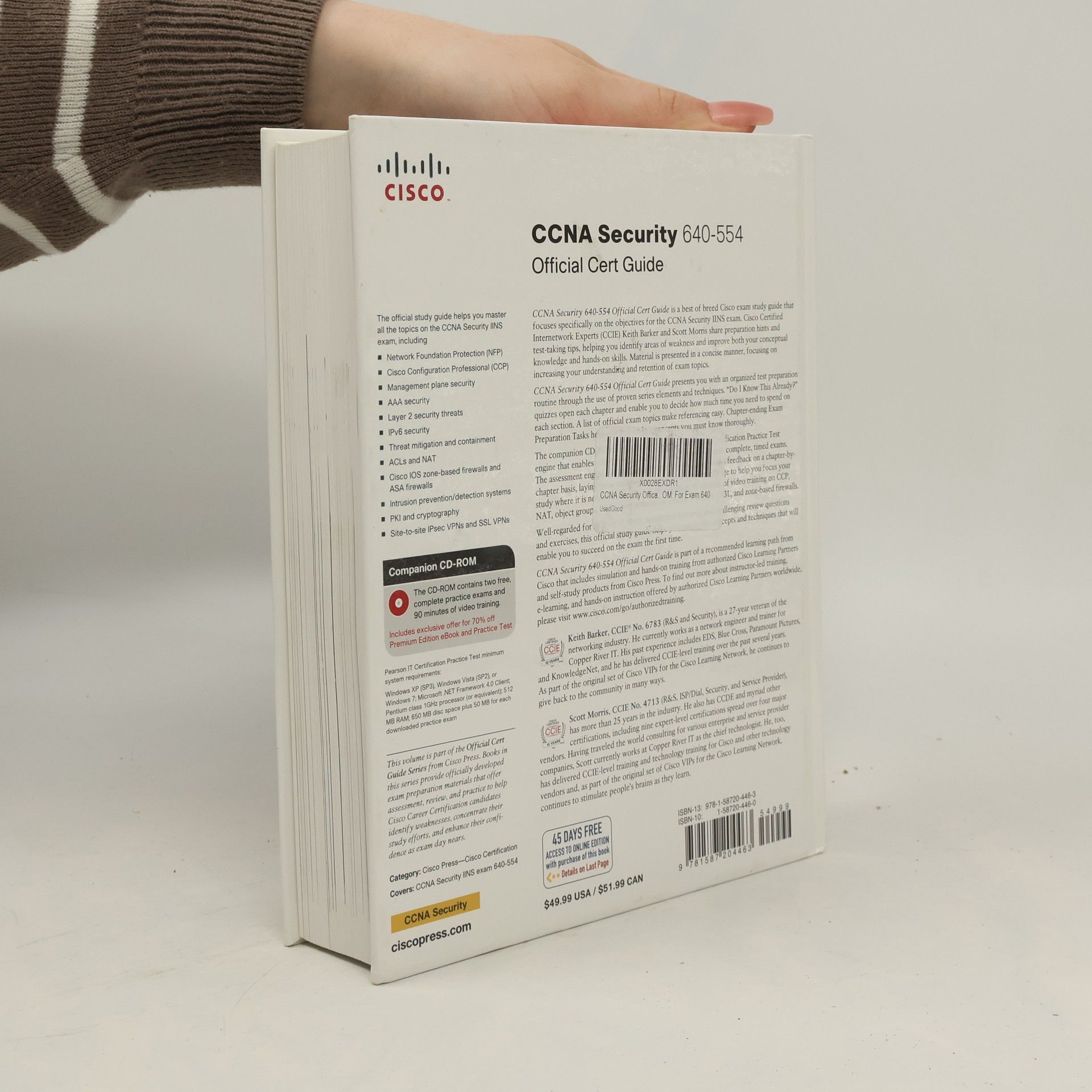 >Trust the best selling Official Cert Guide series from Cisco Press to help you learn, prepare, and practice for exam success. They are built with the objective of providing assessment, review, and practice to help ensure you are fully prepared for your certification exam. Master Cisco CCNA Security IINS 640-554 exam topics Assess your knowledge with chapter-opening quizzes Review key concepts with exam preparation tasks This is the eBook edition of the "CCNA Security 640-554 Official Cert Guide. "This eBook does not include the companion practice exam that comes with the print edition. "CCNA Security 640-554 Official Cert Guide" presents you with an organized test preparation routine through the use of proven series elements and techniques. "Do I Know This Already?" quizzes open each chapter and enable you to decide how much time you need to spend on each section. Exam topic lists make referencing easy. Chapter-ending Exam Preparation Tasks help you drill on key concepts you must know thoroughly. "CCNA Security 640-554 Official Cert Guide," focuses specifically on the objectives for the CCNA Security IINS exam. Expert networking professionals Keith Barker and Scott Morris share preparation hints and test-taking tips, helping you identify areas of weakness and improve both your conceptual knowledge and hands-on skills. Material is presented in a concise manner, focusing on increasing your understanding and retention of exam topics. This eBook comes complete with 90 minutes of video training on CCP, NAT, object groups, ACLs, port security on a Layer 2 switch, CP3L, and zone-based firewalls. See the last page of the eBook file for instructions on downloading the videos. Well-regarded for its level of detail, assessment features, comprehensive design scenarios, and challenging review questions and exercises, this official study guide helps you master the concepts and techniques that will enable you to succeed on the exam the first time. The official study guide helps you master all the topics on the CCNA Security exam, including: " " Network security concepts Security policies and strategies Network foundation protection (NFP) Cisco Configuration Professional (CCP) Management plane security AAA security Layer 2 security threats IPv6 security Threat mitigation and containment Access Control Lists (ACLs) Network Address Translation (NAT) Cisco IOS zone-based firewalls and ASA firewalls Intrusion prevention and detection systems Public Key Infrastructure (PKI) and cryptography Site-to-site IPsec VPNs and SSL VPNs " " "CCNA Security 640-554 ""Official Cert Guide" is part of a recommended learning path from Cisco that includes simulation and hands-on training from authorized Cisco Learning Partners and self-study products from Cisco Press. To find out more about instructor-led training, e-learning, and hands-on instruction offered by authorized Cisco Learning Partners worldwide, please visit www.cisco.com/go/authorizedtraining .