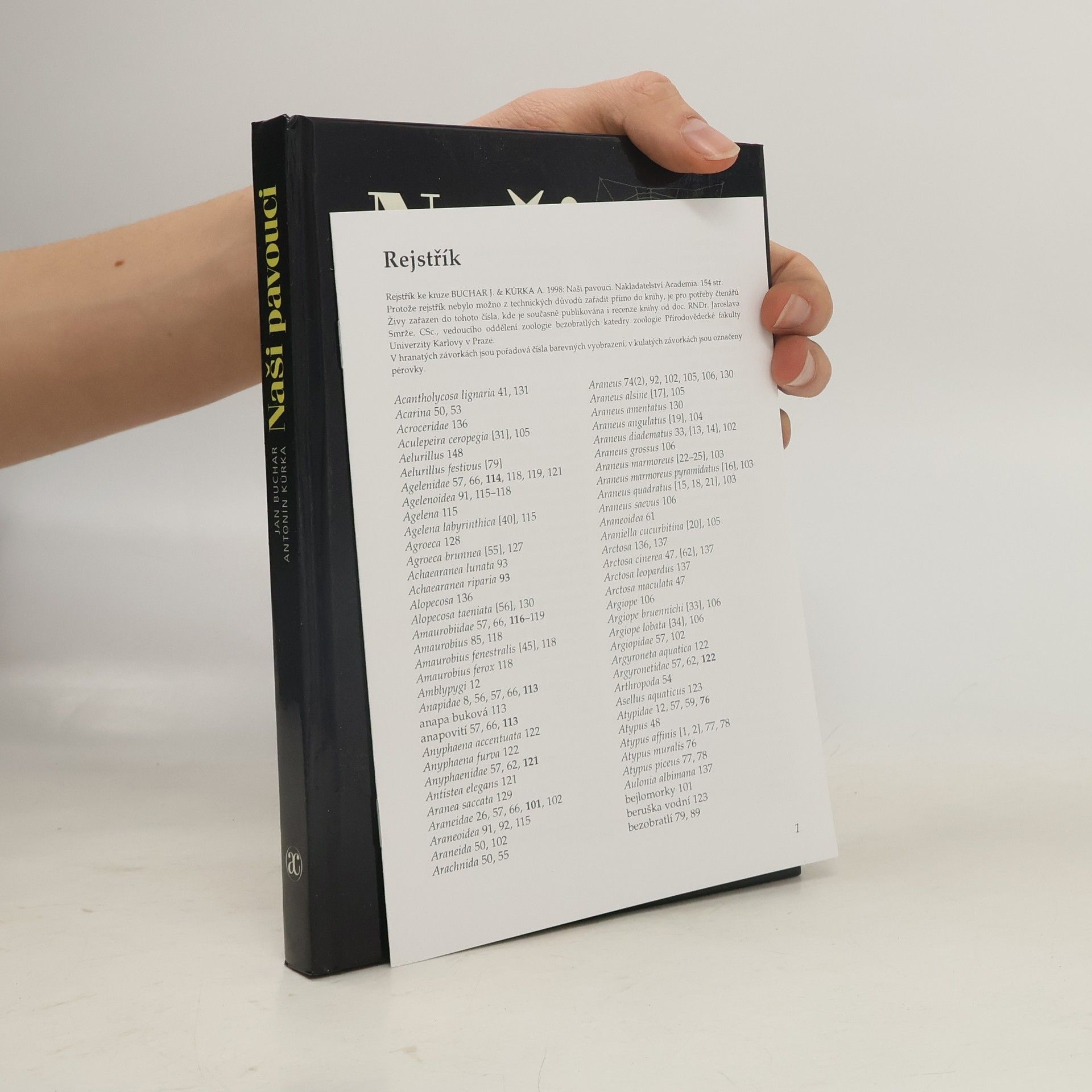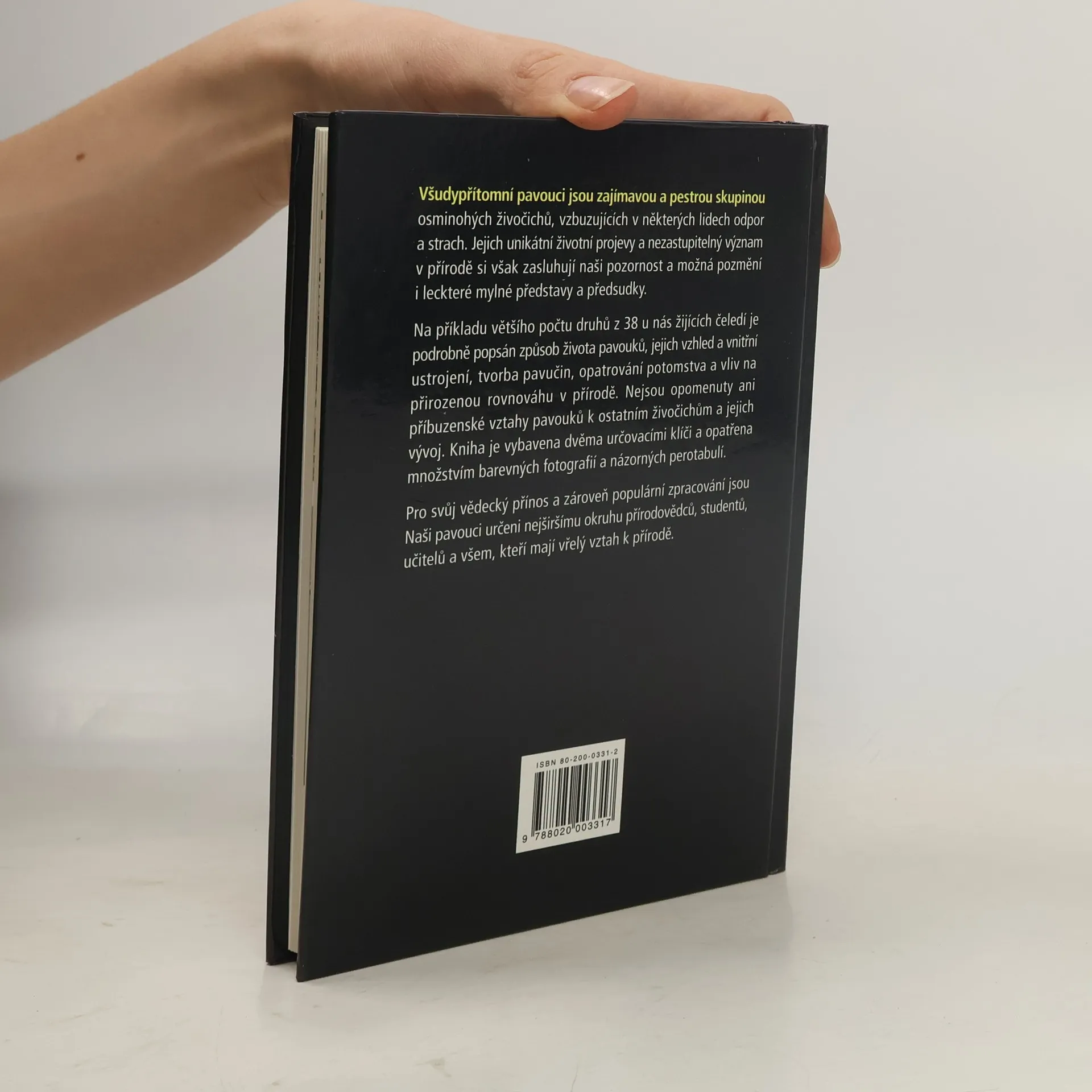 Na příkladu většího počtu druhů z 38 u nás žijících čeledí je podrobně popsán způsob života pavouků, jejich vzhled a vnitřní ustrojení, tvorba pavučin, opatrování potomstva a vliv na přirozenou rovnováhu v přírodě. Nejsou opomenuty ani příbuzenské vztahy pavouků k ostatním živočichům a jejich vývoj. Kniha je vybavena dvěma určovacími klíči a opatřena množství barevných fotografií a názorných perotabulí.