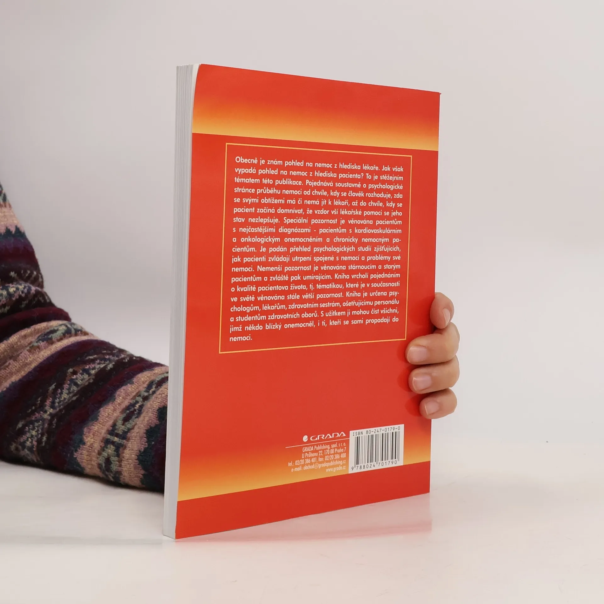 Autor se snaží ukázat a popsat průběh nemoci tak, jak ho prožívá a jak se s ním vyrovnává pacient. Kniha ukazuje krok za krokem psychologickou stránku nemoci: od samotných počátků, kdy pacient přijímá fakt, že se něco děje, rozhoduje se pro návštěvu lékaře a snaží se vyrovnat s neradostnou skutečností. Každý jinak, každý po svém. A to je hlavním tématem knihy: ukázat nejčastější pacientovy postoje, reakce, typické rysy chování a psychické stavy. Pozornost je věnována problematice přijímání a zvládání bolesti, pobytu v nemocnici, otázkám interakce pacienta a lékaře. V centru zájmu stojí pacienti s nejčastější problematickou diagnózou - pacienti s onkologickým onemocněním, kardiovaskulárními chorobami a chronicky nemocní. Autor neopomíjí ani důležitou skupinu starých a umírajících pacientů. Knihu uzavírá kapitola o kvalitách života pacienta. Velmi pěkně, srozumitelně popsané. Odborné i chápavé (z hlediska pacienta). Jen rychle přejít od teorie k praxi a stanovené zásady komunikace s pacientem realizovat v zdravotnických zařízeních.