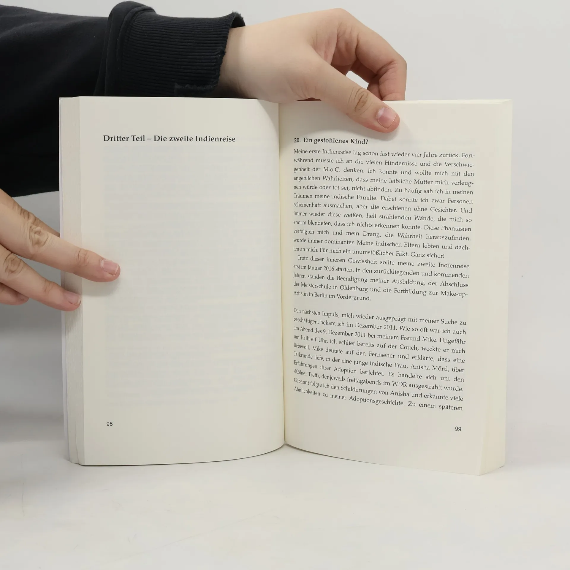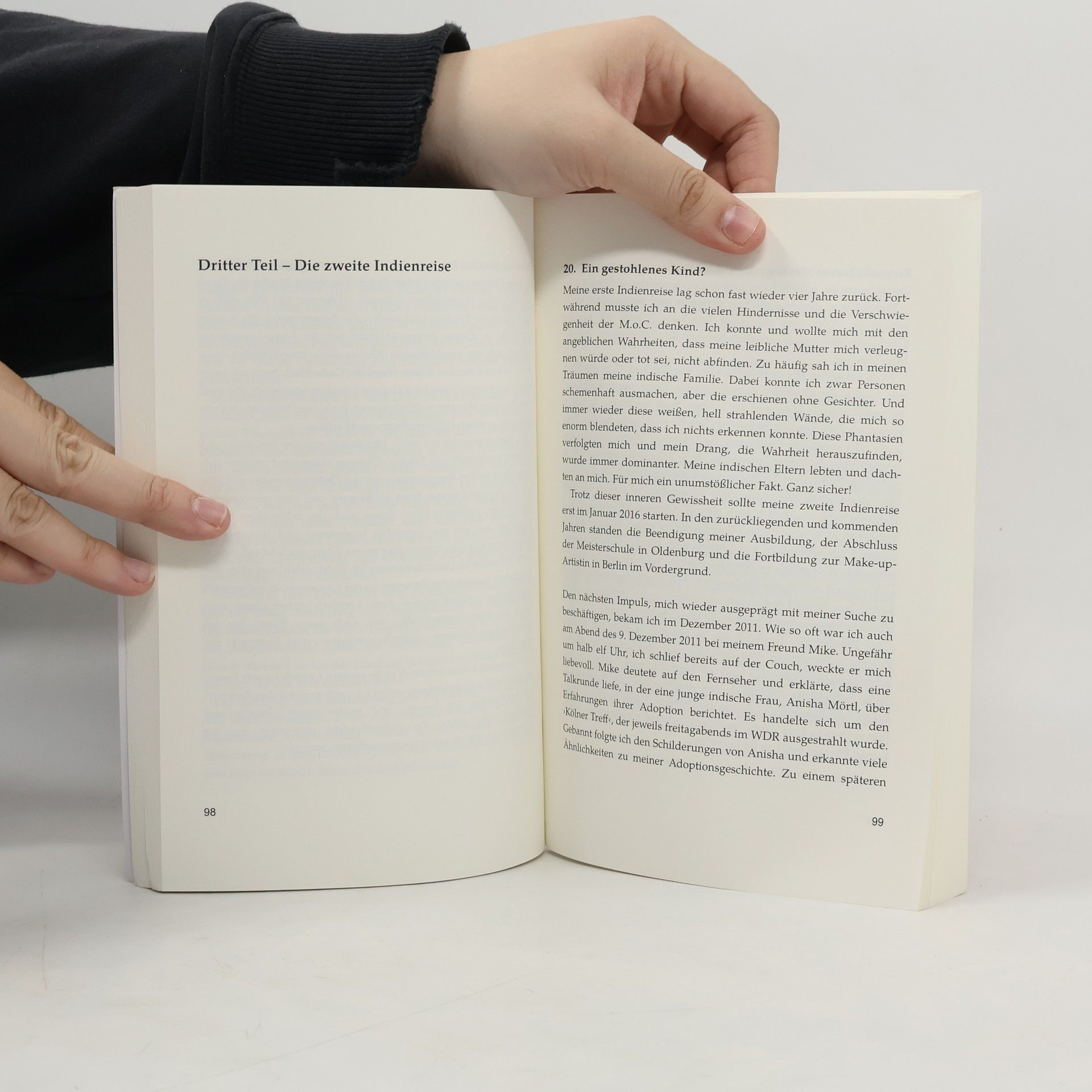 Ein adoptiertes Mädchen auf der Suche nach ihrer indischen Abstammung. Isabel Carla Sindu wird 1989 im Alter von sechs Monaten ohne die Zustimmung ihrer leiblichen Eltern mit der Hilfe der Missionaries of Charity und ProInfante an ein deutsches Ehepaar vermittelt. Bereits sehr früh versucht sie, mehr über ihre Wurzeln zu erfahren. Hierbei stößt sie auf eine Mauer des Schweigens. Offen und ehrlich berichtet Isabel über ihr Schicksal und erzählt, was sie im Laufe von drei Indienreisen über sich und ihre Kultur lernte.