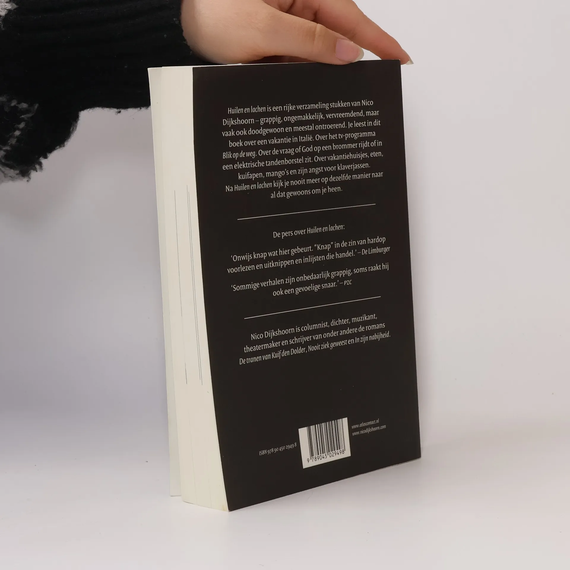Huilen en lachen is een rijke verzameling stukken van Nico Dijkshoorn – grappig, ongemakkelijk, vervreemdend, maar vaak ook doodgewoon en meestal ontroerend. Je leest in dit boek over een vakantie in Italië, over het tv-programma Blik op de weg. Over de vraag of God op een brommer rijdt of in een elektrische tandenborstel zit. Over vakantiehuisjes, eten, kuifapen, mango’s en over zijn angst voor klaverjassen. Het is goed om via Huilen en lachen de wereld van Nico Dijkshoorn in te duiken. Nooit kijk je meer op dezelfde manier naar al dat gewoons om je heen.