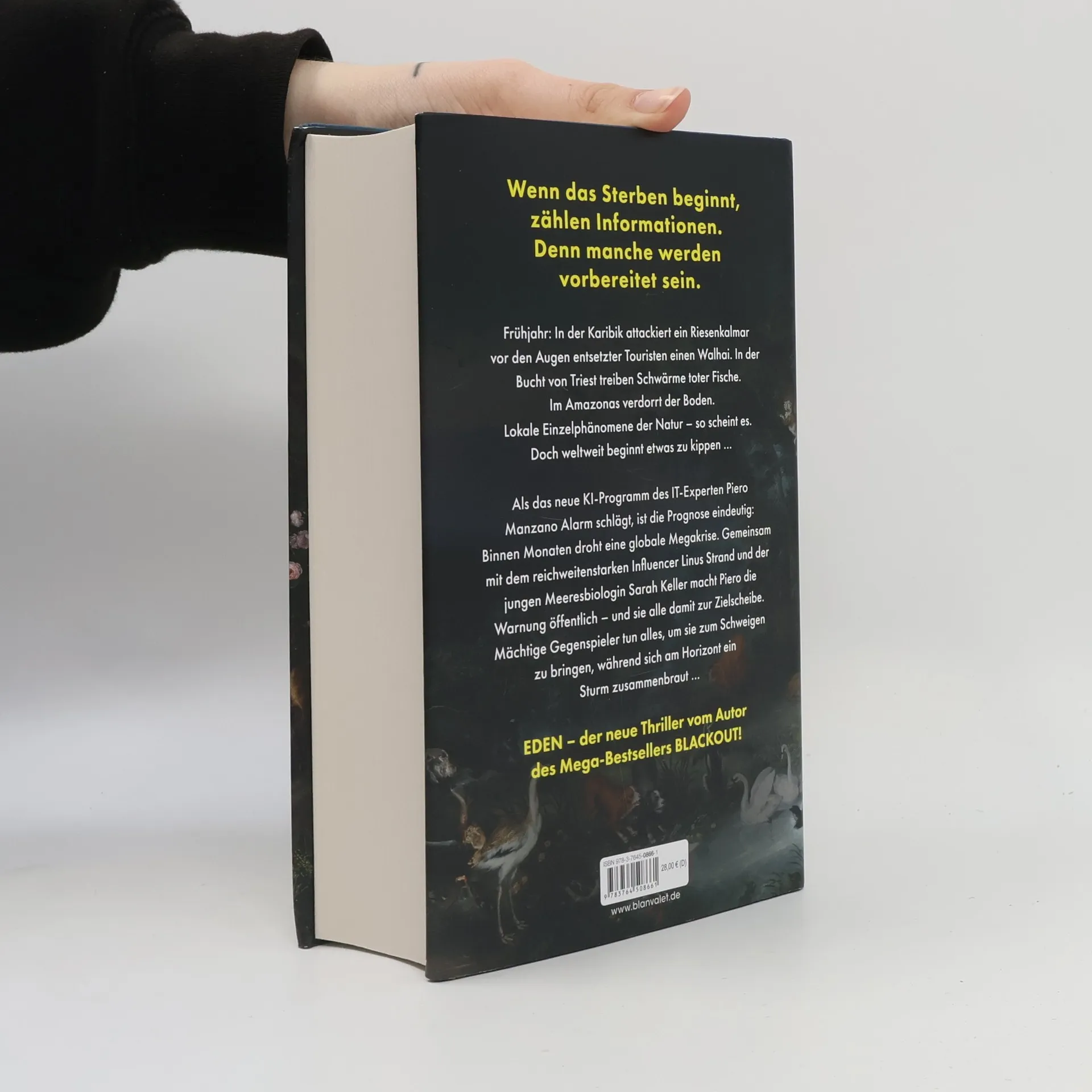 Das Sterben hat begonnen – der neue rasante Thriller von SPIEGEL-Bestsellerautor Marc Elsberg Frühsommer: In der karibischen See greift ein Riesenkalmar vor den Augen entsetzter Touristen einen Walhai an. In der Bucht von Triest treiben Schwärme toter Fische im Meer. Im Amazonas-Gebiet trocknen die Böden aus. Folgen des weltweiten Artensterbens, kaum eine Nachrichtenmeldung wert. Doch das neu entwickelte KI-Programm von IT-Experte Piero Manzano schlägt Alarm und prognostiziert eine globale Superkrise, die die Welt binnen weniger Wochen ins Chaos stürzen wird. Mit Hilfe seines Neffen Linus, der als Influencer eine enorme Reichweite hat, und der jungen Meeresbiologin Sarah Keller macht Piero die Warnungen öffentlich – und gerät damit gefährlich in die Schusslinie. Mächtige Gegenspieler tun alles, um ihn zum Schweigen zu bringen, während sich am Horizont buchstäblich ein Sturm zusammenbraut … Lesen Sie auch die anderen brisanten Thriller von Marc Elsberg wie BLACKOUT und CELSIUS.