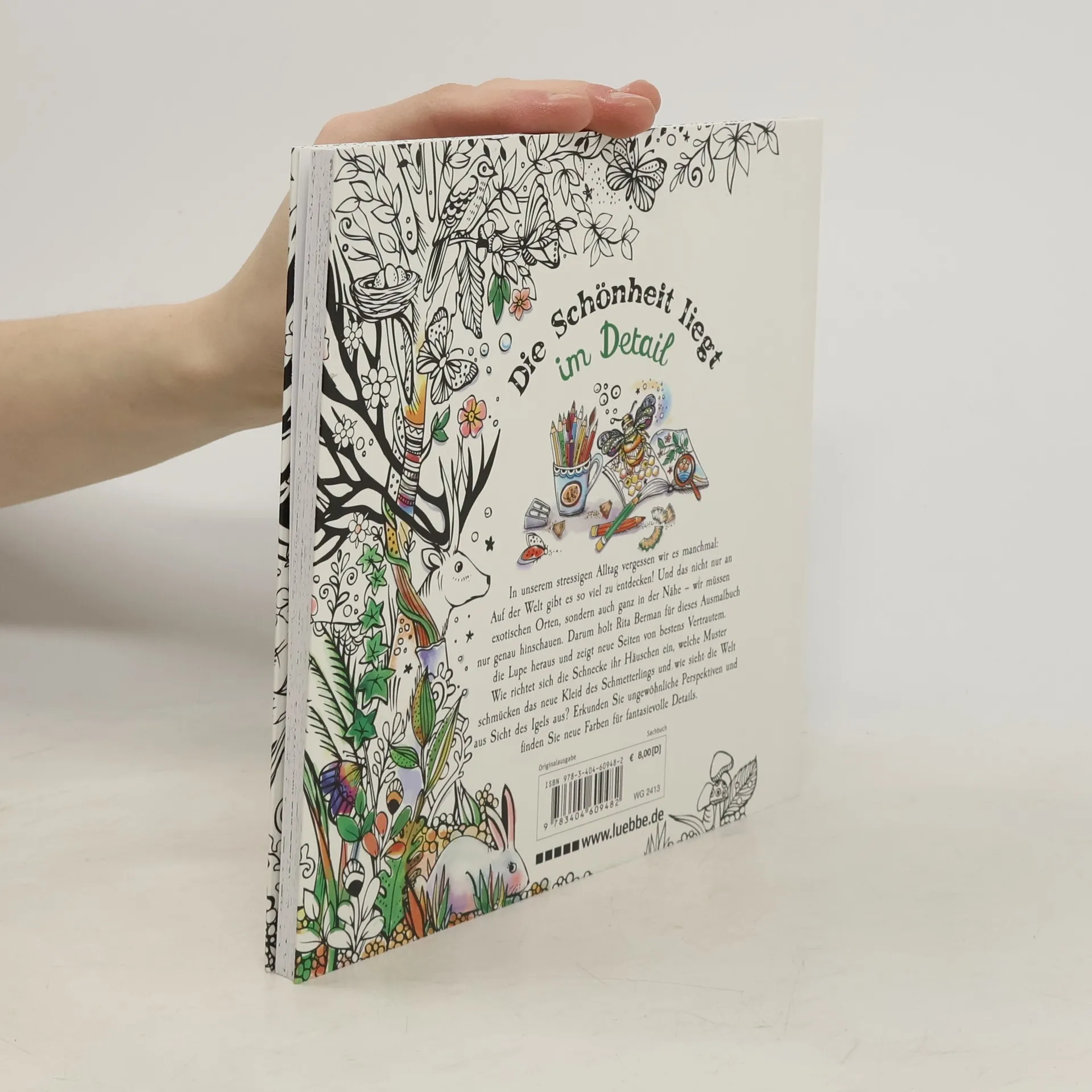 In unserem stressigen Alltag vergessen wir es manchmal: Auf der Welt gibt es so viel zu entdecken! Und das nicht nur an exotischen Orten, sondern auch ganz in der Nähe - wir müssen nur genau hinschauen. Darum holt Rita Berman für dieses Malbuch die Lupe heraus und zeigt neue Seiten von bestens Vertrautem. Wie richtet sich die Schnecke ihr Häuschen ein, welche Muster schmücken das neue Kleid des Schmetterlings und wie sieht die Welt aus Sicht des Igels aus? Erkunden Sie ungewöhnliche Perspektiven und finden Sie neue Farben für fantasievolle Details.