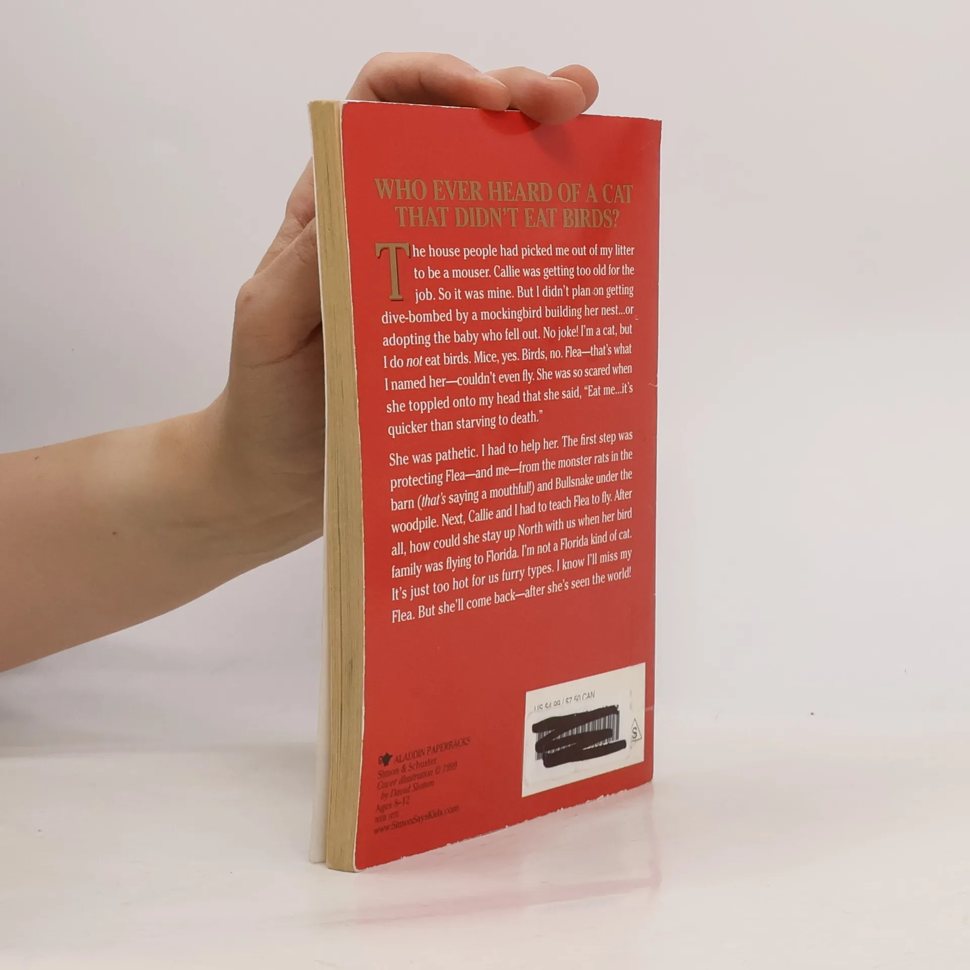 Who ever heard of a cat that didn't eat birds?The house people had picked me out of my litter to be a mouser. Callie was getting too old for the job. So it was mine. But I didn't plan on getting dive-bombed by a mockingbird building her nest...or adopting the baby who fell out. No joke! I'm a cat, but I do not eat birds. Mice, yes. Birds, no. Flea -- that's what I named her -- couldn't even fly. She was so scared when she toppled onto my head that she said, "Eat me...it's quicker than starving to death."She was pathetic. I had to help her. The first step was protecting Flea -- and me -- from the monster rats in the barn ( that's saying a mouthful!) and Bullsnake under the woodpile. Next, Callie and I had to teach Flea to fly. After all, how could she stay up North with us when her bird family was flying to Florida. I'm not a Florida kind of cat. It's just too hot for us furry types. I know I'll miss my Flea. But she'll come back -- after she's seen the world!