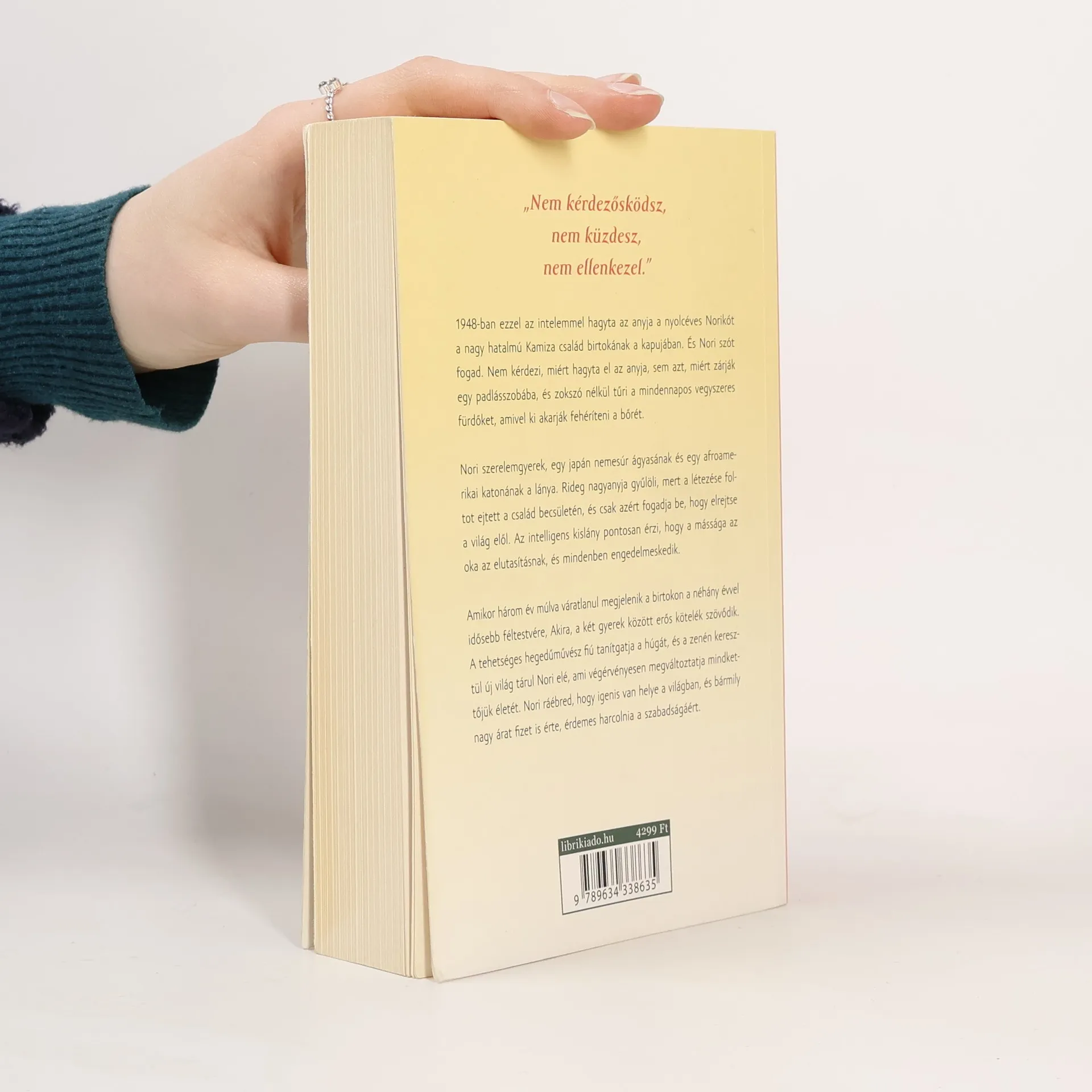 "Nem kérdezősködsz, nem küzdesz, nem ellenkezel." 1948-ban ezzel az intelemmel hagyta az anyja a nyolcéves Norikót a nagyhatalmú Kamiza család birtokának a kapujában. És Nori szót fogad. Nem kérdezi, miért hagyta el az anyja, sem azt, miért zárják egy padlásszobába, és zokszó nélkül tűri a mindennapos vegyszeres fürdőket, amivel ki akarják fehéríteni a bőrét. Nori szerelemgyerek, egy japán nemesúr ágyasának és egy afroamerikai katonának a lánya. Rideg nagyanyja gyűlöli, mert a létezése foltot ejtett a család becsületén, és csak azért fogadja be, hogy elrejtse a világ elől. Az intelligens kislány pontosan érzi, hogy a mássága az oka az elutasításnak, és mindenben engedelmeskedik. Amikor három év múlva váratlanul megjelenik a birtokon a néhány évvel idősebb féltestvére, Akira, a két gyerek között erős kötelék szövődik. A tehetséges hegedűművész fiú tanítgatja a húgát, és a zenén keresztül új világ tárul Nori elé, ami végérvényesen megváltoztatja mindkettőjük életét. Nori ráébred, hogy igenis van helye a világban, és bármily nagy árat fizet is érte, érdemes harcolnia a szabadságáért.