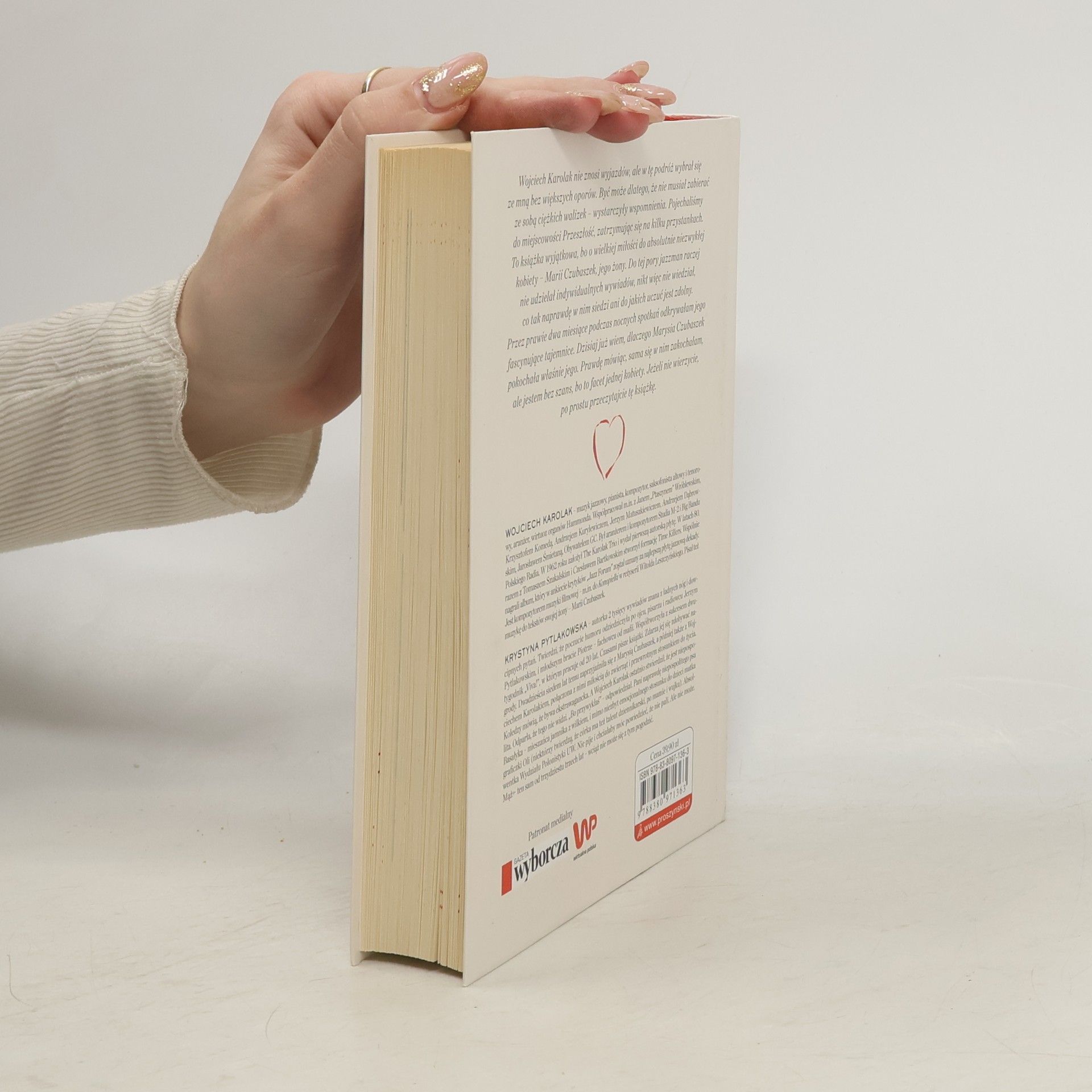 "Wojciech Karolak nie znosi wyjazdów, ale w tę podróż wybrał się ze mną bez większych oporów. Być może dlatego, że nie musiał zabierać ze sobą ciężkich walizek - wystarczyły wspomnienia. Pojechaliśmy do miejscowości Przeszłość, zatrzymując się na kilku przystankach.To książka wyjątkowa, bo o wielkiej miłości do absolutnie niezwykłej kobiety - Marii Czubaszek, jego żony. Do tej pory jazzman raczej nie udzielał indywidualnych wywiadów, nikt więc nie wiedział, co tak naprawdę w nim siedzi ani do jakich uczuć jest zdolny. Przez prawie dwa miesiące podczas nocnych spotkań odkrywałam jego fascynujące tajemnice. Dzisiaj już wiem, dlaczego Marysia Czubaszek pokochała właśnie jego. Prawdę mówiąc, sama się w nim zakochałam, ale jestem bez szans, bo to facet jednej kobiety. Jeżeli nie wierzycie, po prostu przeczytajcie tę książkę." - Krystyna Pytlakowska