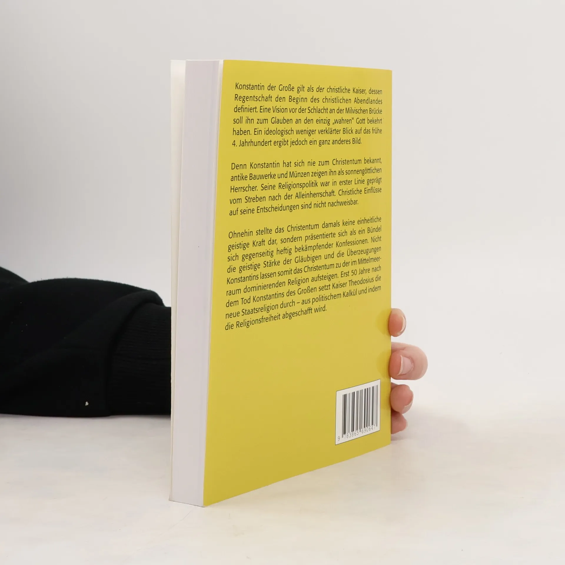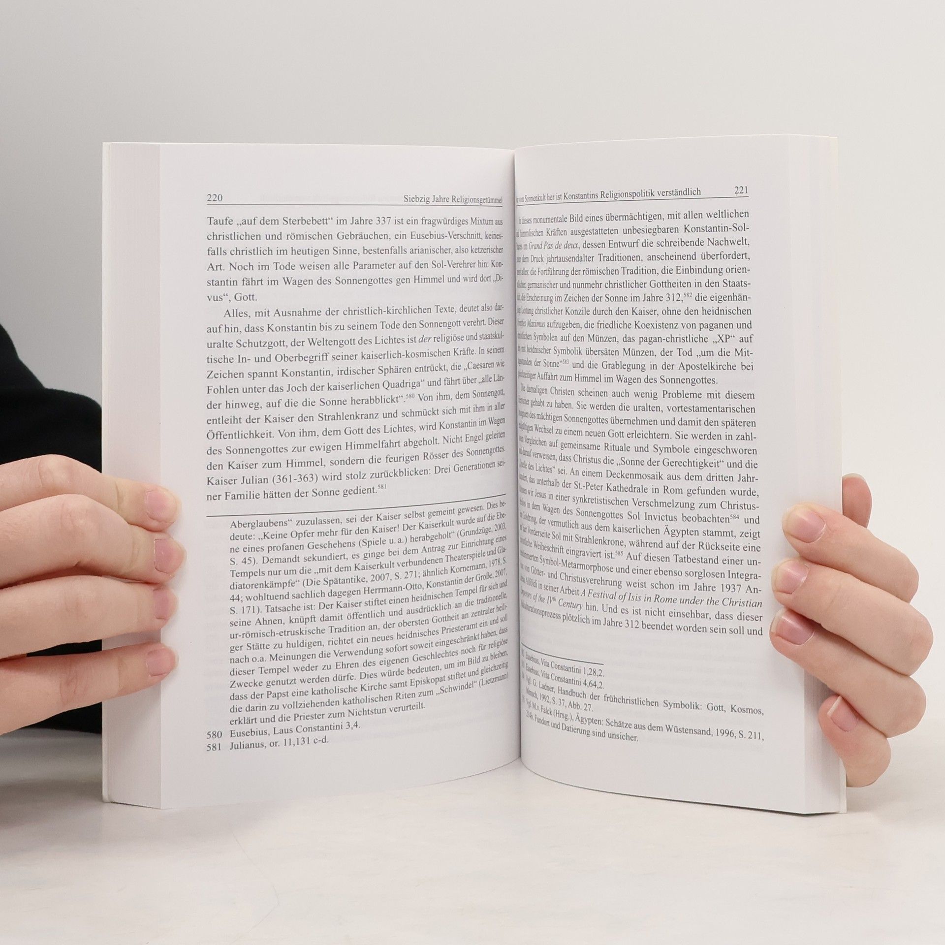 Konstantin gilt als der christliche Kaiser, der den Beginn des christlichen Abendlandes definierte. Eine Vision vor der Schlacht an der Milvischen Brücke soll ihn zum Glauben an den einzig „wahren“ Gott bekehrt haben. Ein ideologisch weniger verklärter Blick auf das frühe 4. Jahrhundert zeigt jedoch, dass Konstantin sich nie zum Christentum bekannte. Antike Bauwerke und Münzen zeigen ihn als sonnengöttlichen Herrscher, und seine Religionspolitik war vor allem von dem Streben nach Alleinherrschaft geprägt. Christliche Einflüsse auf seine Entscheidungen sind nicht nachweisbar. Trotz dieser Erkenntnisse halten viele deutsche Althistoriker das Bild des allerchristlichsten Kaisers aufrecht. Dass Konstantin als arianischer „Ketzer“ getauft wurde, spielt in ihrer Wahrnehmung keine Rolle, ebenso wenig wie die Zeugnisse, die ihn mit dem Sonnengott verbinden. Die Symbolforschung zeigt, dass das Kreuz zur Zeit Konstantins noch nicht als christliches Symbol galt, was jedoch nicht zu einem kritischen Umgang mit kirchlichen Quellen führt. Althistoriker diskutieren ernsthaft, ob Konstantin das Kreuz im Traum oder tatsächlich gesehen habe. Das Christentum war damals kein einheitliches Glaubenssystem, sondern ein Bündel kämpfender Konfessionen. Erst 50 Jahre nach Konstantins Tod setzte Kaiser Theodosius das Christentum als Staatsreligion durch, motiviert durch politischen Kalkül und die Abschaffung der Religionsfreiheit.