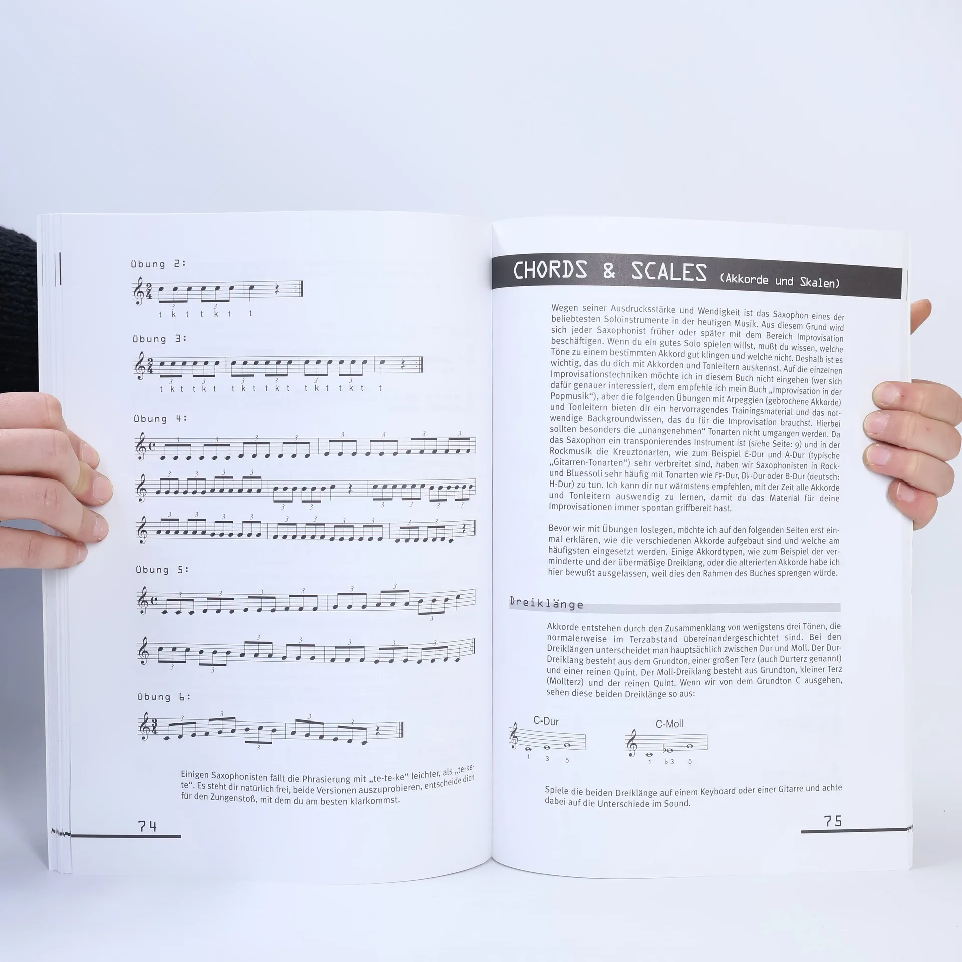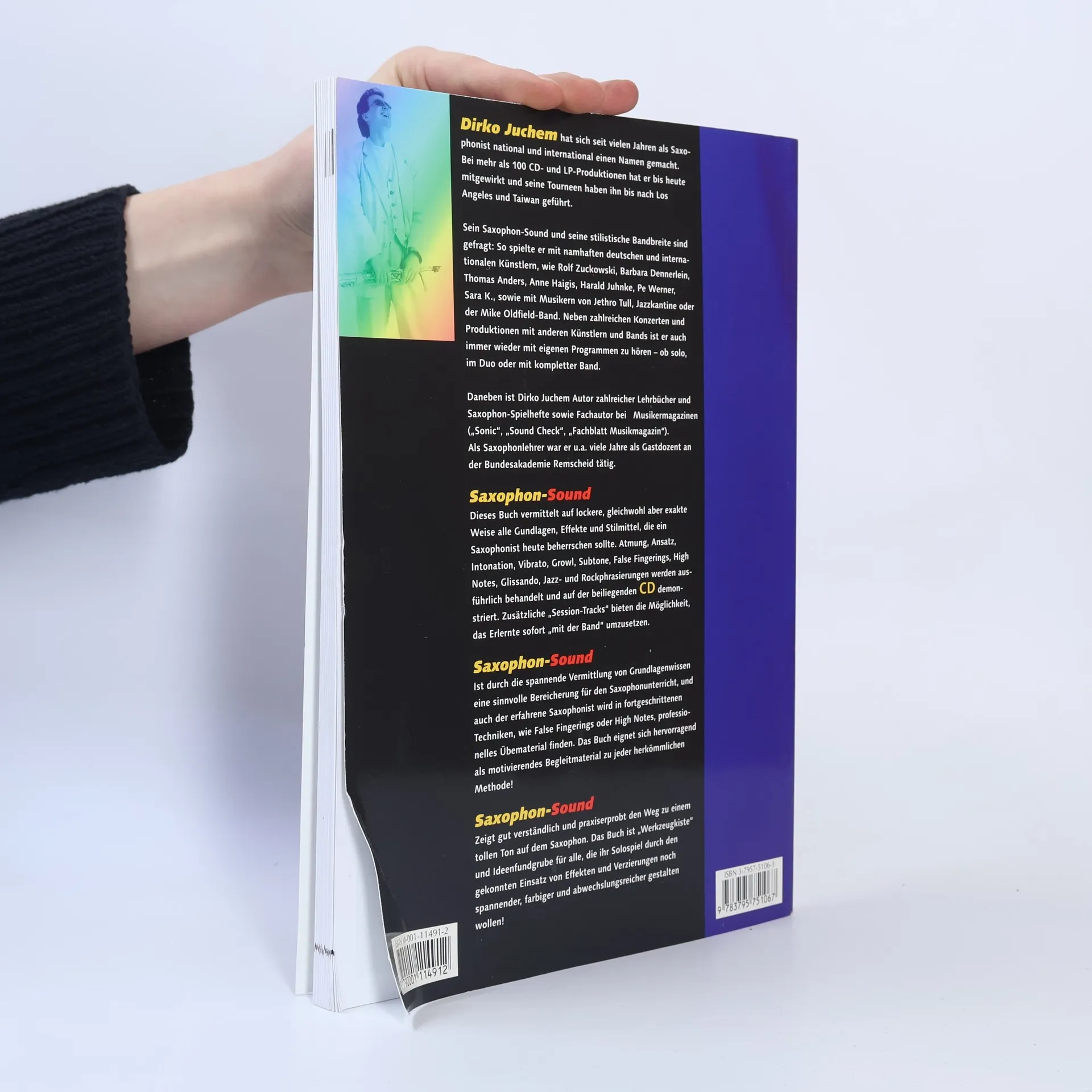 Grundlagen und Spezialeffekte fr alle Saxophone In diesem Buch geht es um den perfekten Sound auf dem Saxophon. Dirko Juchem erklrt auf lockere, aber gleichwohl exakte Weise alle Effekte, die ein Saxophonist heute auf seinem Instrument beherrschen professionelle Atmung, Ansatz, Intonation, Vibrato, Growl, Subtone, False Fingerings, High Notes, Glissando, Jazz- und Rockphrasierung werden ausfhrlich behandelt und auf der beiliegenden CD demonstriert. Zustzliche "Session-Tracks" bieten die Mglichkeit, das Erlernte sofort "mit einer Band" umzusetzen."Saxophone Sound" ist durch die lockere Vermittlung von Grundlagenwissen eine sinnvolle Bereicherung fr den Unterricht, und auch der erfahrene Saxophonist wird in den fortgeschrittenen Techniken, wie False Fingerings oder High Notes, professionelles bematerial finden. "Saxophon-Sound" eignet sich hervorragend fr den Saxophonunterricht und kann als motivierendes Begleitmaterial neben jeder herkmmlichen Methode verwendet werden. Inhalt der CD Vorwort Who is who Die Tne H-B-Bb Equipment Sound Verzierungen Phrasierung Chords & Scales (Akkorde und Skalen) Fingertechnik Anhang Grifftabellen