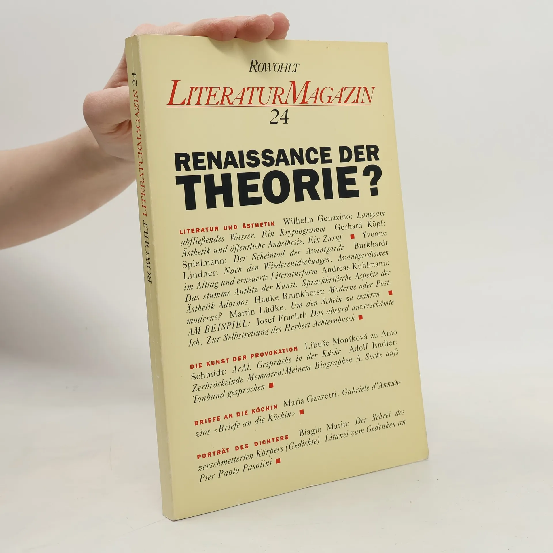 Literaturmagazin - 24: Renaissance der Theorie?, Oliver Martin Lüdtke-Handjery, Delf Schmidt, Wilhelm Genazino, Gerhard Köpf, Yvonne Spielmann, Burkhardt Lindner, Andreas Kuhlmann, Hauke Brunkhorst, Josef Früchtl, Libuše Moníková, Adolf Endler, Maria Gazzetti, Biagio Marin